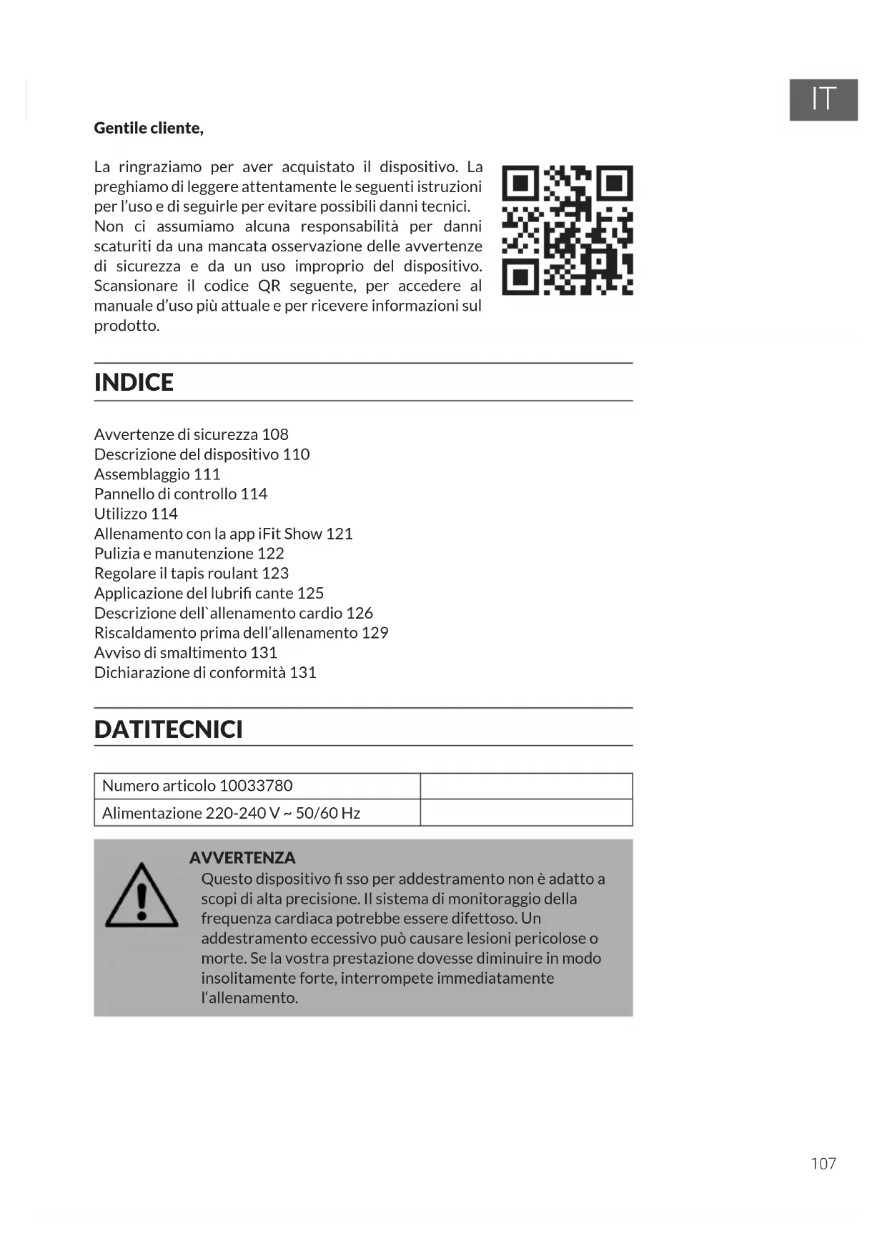 Gentile cliente, La ringraziamo per aver acquistato il dispositivo. La preghiamo di leggere attentamente le seguenti istruzioni per l’uso e di seguirle per evitare possibili danni tecnici. Non ci assumiamo alcuna responsabilità per danni scaturiti da una mancata osservazione delle avvertenze di sicurezza e da un uso improprio del dispositivo. Scansionare il codice QR seguente, per accedere al manuale d’uso più attuale e per ricevere informazioni sul prodotto. INDICE Avvertenze di sicurezza 108 Descrizione del dispositivo 110 Assemblaggio 111 Pannello di controllo 114 Utilizzo 114 Allenamento con la app iFit Show 121 Pulizia e manutenzione 122 Regolare il tapis roulant 123 Applicazione del lubri cante 125 Descrizione dell`allenamento cardio 126 Riscaldamento prima dell’allenamento 129 Avviso di smaltimento 131 Dichiarazione di conformità 131 DATI TECNICI Numero articolo 10033780 Alimentazione 220-240 V ~ 50/60 Hz AVVERTENZA Questo dispositivo sso per addestramento non è adatto a scopi di alta precisione. Il sistema di monitoraggio della frequenza cardiaca potrebbe essere difettoso. Un addestramento eccessivo può causare lesioni pericolose o morte. Se la vostra prestazione dovesse diminuire in modo insolitamente forte, interrompete immediatamente l‘allenamento.108