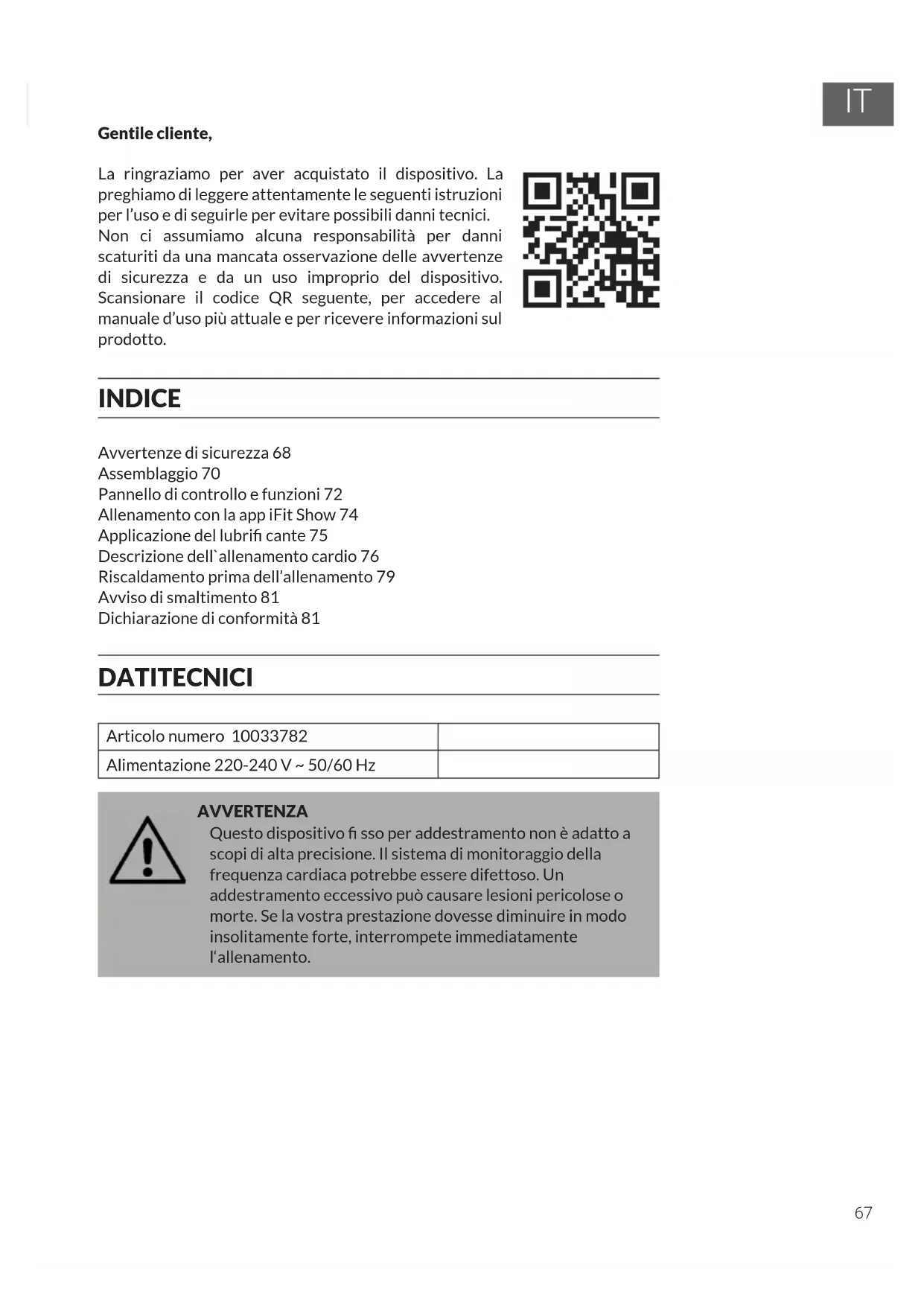 Gentile cliente, La ringraziamo per aver acquistato il dispositivo. La preghiamo di leggere attentamente le seguenti istruzioni per l’uso e di seguirle per evitare possibili danni tecnici. Non ci assumiamo alcuna responsabilità per danni scaturiti da una mancata osservazione delle avvertenze di sicurezza e da un uso improprio del dispositivo. Scansionare il codice QR seguente, per accedere al manuale d’uso più attuale e per ricevere informazioni sul prodotto. INDICE Avvertenze di sicurezza 68 Assemblaggio 70 Pannello di controllo e funzioni 72 Allenamento con la app iFit Show 74 Applicazione del lubri cante 75 Descrizione dell`allenamento cardio 76 Riscaldamento prima dell’allenamento 79 Avviso di smaltimento 81 Dichiarazione di conformità 81 DATI TECNICI Articolo numero 10033782 Alimentazione 220-240 V ~ 50/60 Hz AVVERTENZA Questo dispositivo sso per addestramento non è adatto a scopi di alta precisione. Il sistema di monitoraggio della frequenza cardiaca potrebbe essere difettoso. Un addestramento eccessivo può causare lesioni pericolose o morte. Se la vostra prestazione dovesse diminuire in modo insolitamente forte, interrompete immediatamente l‘allenamento.68