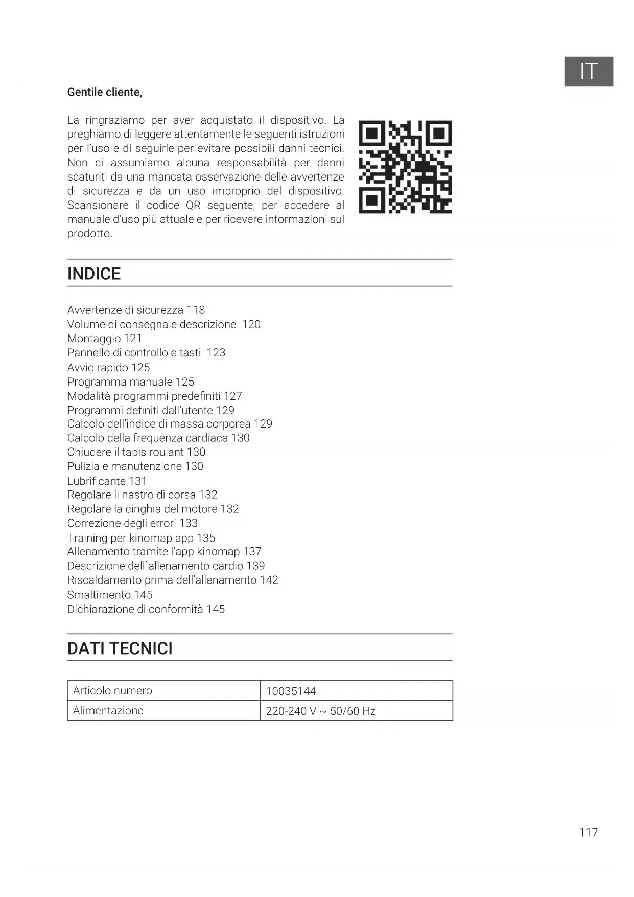 Gentile cliente, La ringraziamo per aver acquistato il dispositivo. La preghiamo di leggere attentamente le seguenti istruzioni per l’uso e di seguirle per evitare possibili danni tecnici. Non ci assumiamo alcuna responsabilità per danni scaturiti da una mancata osservazione delle avvertenze di sicurezza e da un uso improprio del dispositivo. Scansionare il codice QR seguente, per accedere al manuale d’uso più attuale e per ricevere informazioni sul prodotto. INDICE Avvertenze di sicurezza 118 Volume di consegna e descrizione 120 Montaggio 121 Pannello di controllo e tasti 123 Avvio rapido 125 Programma manuale 125 Modalità programmi predeniti 127 Programmi deniti dall’utente 129 Calcolo dell’indice di massa corporea 129 Calcolo della frequenza cardiaca 130 Chiudere il tapis roulant 130 Pulizia e manutenzione 130 Lubricante 131 Regolare il nastro di corsa 132 Regolare la cinghia del motore 132 Correzione degli errori 133 Training per kinomap app 135 Allenamento tramite l’app kinomap 137 Descrizione dell`allenamento cardio 139 Riscaldamento prima dell’allenamento 142 Smaltimento 145 Dichiarazione di conformità 145 DATI TECNICI Articolo numero