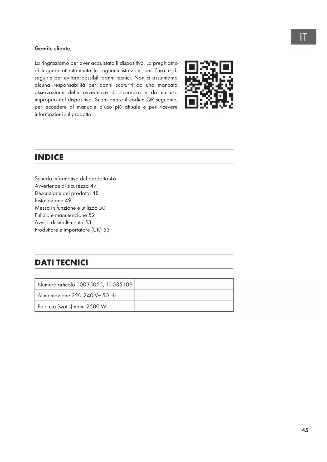 Gentile cliente, La ringraziamo per aver acquistato il dispositivo. La preghiamo di leggere attentamente le seguenti istruzioni per l’uso e di seguirle per evitare possibili danni tecnici. Non ci assumiamo alcuna responsabilità per danni scaturiti da una mancata osservazione delle avvertenze di sicurezza e da un uso improprio del dispositivo. Scansionare il codice QR seguente, per accedere al manuale d’uso più attuale e per ricevere informazioni sul prodotto. INDICE DATI TECNICI Numero articolo 10035055, 10035109 Alimentazione 220-240 V~ 50 Hz Potenza (watts) max. 2500 W Scheda informativa del prodotto46 Avvertenze di sicurezza47 Descrizione del prodotto48 Installazione49 Messa in funzione e utilizzo50 Pulizia e manutenzione52 Avviso di smaltimento53 Produttore e importatore (UK)5346