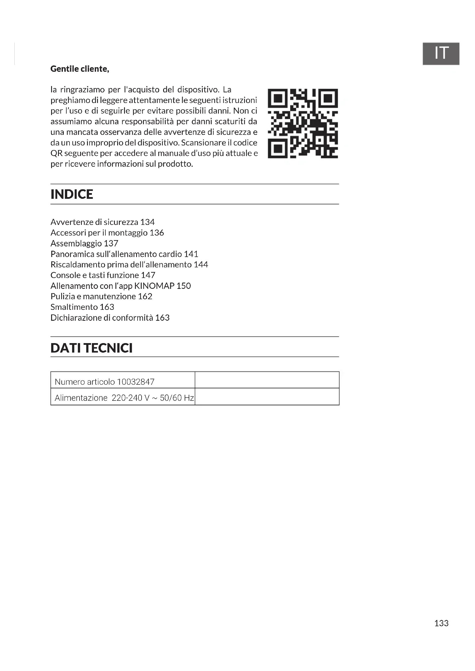 Gentile cliente, la ringraziamo per l'acquisto del dispositivo. La preghiamo di leggere attentamente le seguenti istruzioni per l’uso e di seguirle per evitare possibili danni. Non ci assumiamo alcuna responsabilità per danni scaturiti da una mancata osservanza delle avvertenze di sicurezza e da un uso improprio del dispositivo. Scansionare il codice QR seguente per accedere al manuale d’uso più attuale e per ricevere informazioni sul prodotto. INDICE Avvertenze di sicurezza 134 Accessori per il montaggio 136 Assemblaggio 137 Panoramica sull‘allenamento cardio 141 Riscaldamento prima dell‘allenamento 144 Console e tasti funzione 147 Allenamento con l‘app KINOMAP 150 Pulizia e manutenzione 162 Smaltimento 163 Dichiarazione di conformità 163 DATI TECNICI Numero articolo 10032847 Alimentazione 220-240 V ~ 50/60 Hz134