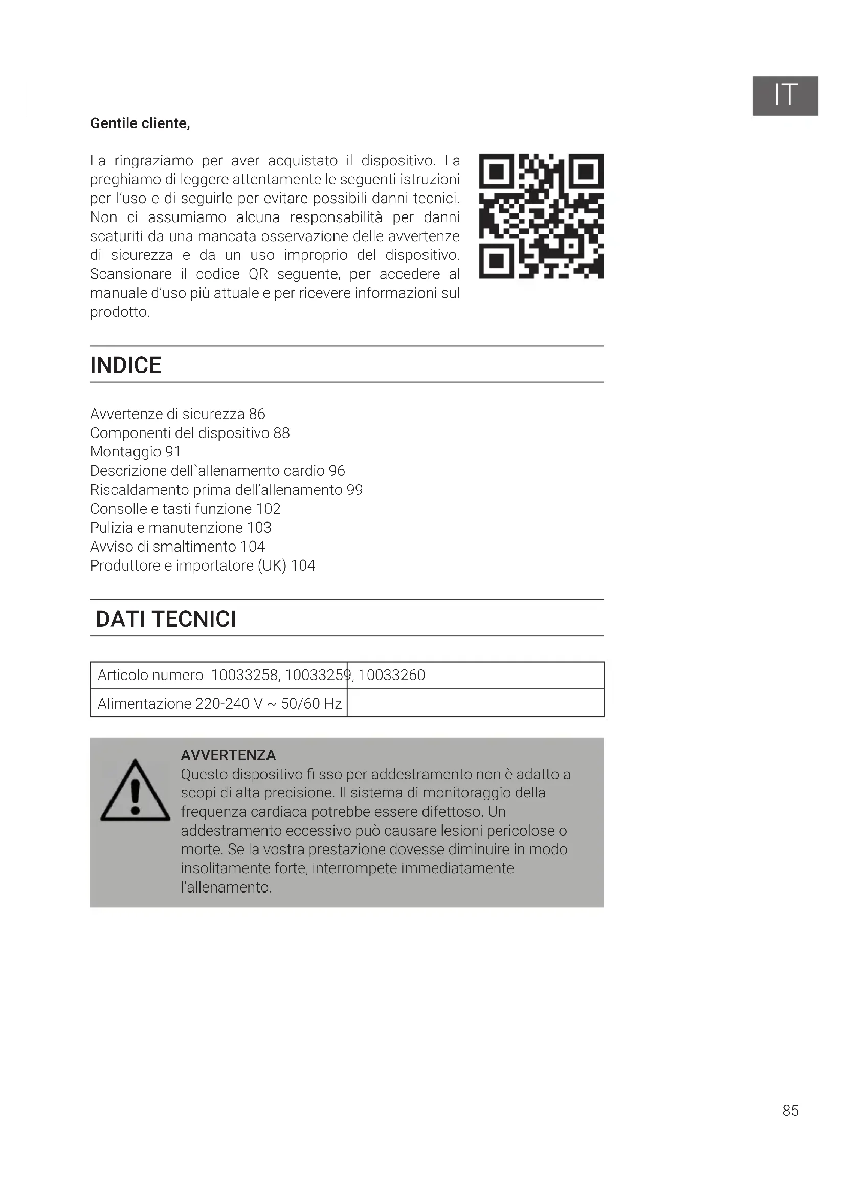 Gentile cliente, La ringraziamo per aver acquistato il dispositivo. La preghiamo di leggere attentamente le seguenti istruzioni per l’uso e di seguirle per evitare possibili danni tecnici. Non ci assumiamo alcuna responsabilità per danni scaturiti da una mancata osservazione delle avvertenze di sicurezza e da un uso improprio del dispositivo. Scansionare il codice QR seguente, per accedere al manuale d’uso più attuale e per ricevere informazioni sul prodotto. INDICE Avvertenze di sicurezza 86 Componenti del dispositivo 88 Montaggio 91 Descrizione dell`allenamento cardio 96 Riscaldamento prima dell’allenamento 99 Consolle e tasti funzione 102 Pulizia e manutenzione 103 Avviso di smaltimento 104 Produttore e importatore (UK) 104 DATI TECNICI Articolo numero 10033258, 10033259, 10033260 Alimentazione 220-240 V ~ 50/60 Hz AVVERTENZA Questo dispositivo sso per addestramento non è adatto a scopi di alta precisione. Il sistema di monitoraggio della frequenza cardiaca potrebbe essere difettoso. Un addestramento eccessivo può causare lesioni pericolose o morte. Se la vostra prestazione dovesse diminuire in modo insolitamente forte, interrompete immediatamente l‘allenamento.86