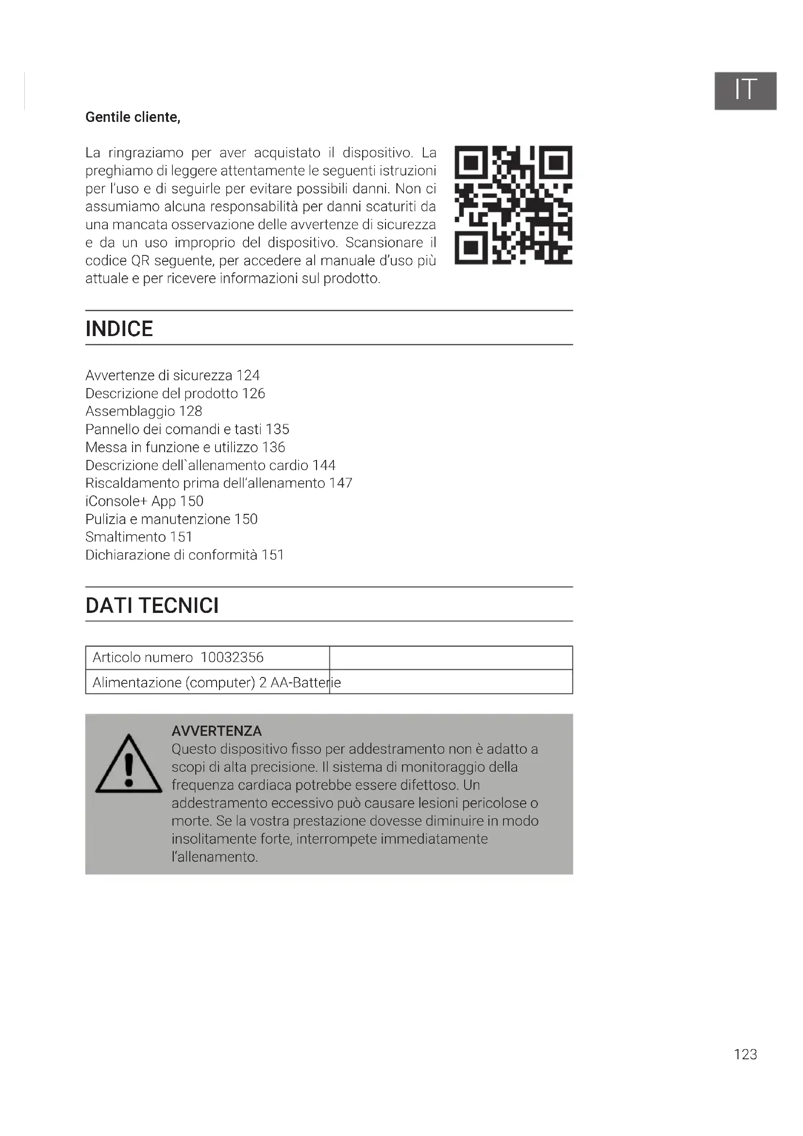 Gentile cliente, La ringraziamo per aver acquistato il dispositivo. La preghiamo di leggere attentamente le seguenti istruzioni per l’uso e di seguirle per evitare possibili danni. Non ci assumiamo alcuna responsabilità per danni scaturiti da una mancata osservazione delle avvertenze di sicurezza e da un uso improprio del dispositivo. Scansionare il codice QR seguente, per accedere al manuale d’uso più attuale e per ricevere informazioni sul prodotto. INDICE Avvertenze di sicurezza 124 Descrizione del prodotto 126 Assemblaggio 128 Pannello dei comandi e tasti 135 Messa in funzione e utilizzo 136 Descrizione dell`allenamento cardio 144 Riscaldamento prima dell’allenamento 147 iConsole+ App 150 Pulizia e manutenzione 150 Smaltimento 151 Dichiarazione di conformità 151 DATI TECNICI Articolo numero 10032356 Alimentazione (computer) 2 AA-Batterie AVVERTENZA Questo dispositivo sso per addestramento non è adatto a scopi di alta precisione. Il sistema di monitoraggio della frequenza cardiaca potrebbe essere difettoso. Un addestramento eccessivo può causare lesioni pericolose o morte. Se la vostra prestazione dovesse diminuire in modo insolitamente forte, interrompete immediatamente l‘allenamento.124