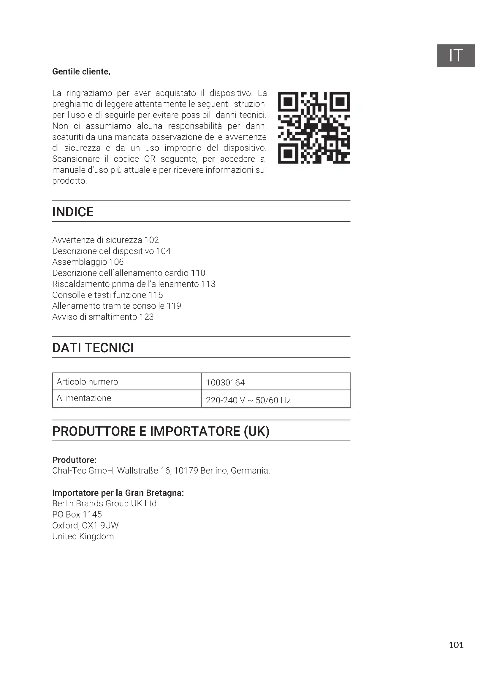 Gentile cliente, La ringraziamo per aver acquistato il dispositivo. La preghiamo di leggere attentamente le seguenti istruzioni per l’uso e di seguirle per evitare possibili danni tecnici. Non ci assumiamo alcuna responsabilità per danni scaturiti da una mancata osservazione delle avvertenze di sicurezza e da un uso improprio del dispositivo. Scansionare il codice QR seguente, per accedere al manuale d’uso più attuale e per ricevere informazioni sul prodotto. INDICE Avvertenze di sicurezza 102 Descrizione del dispositivo 104 Assemblaggio 106 Descrizione dell`allenamento cardio 110 Riscaldamento prima dell’allenamento 113 Consolle e tasti funzione 116 Allenamento tramite consolle 119 Avviso di smaltimento 123 DATI TECNICI Articolo numero