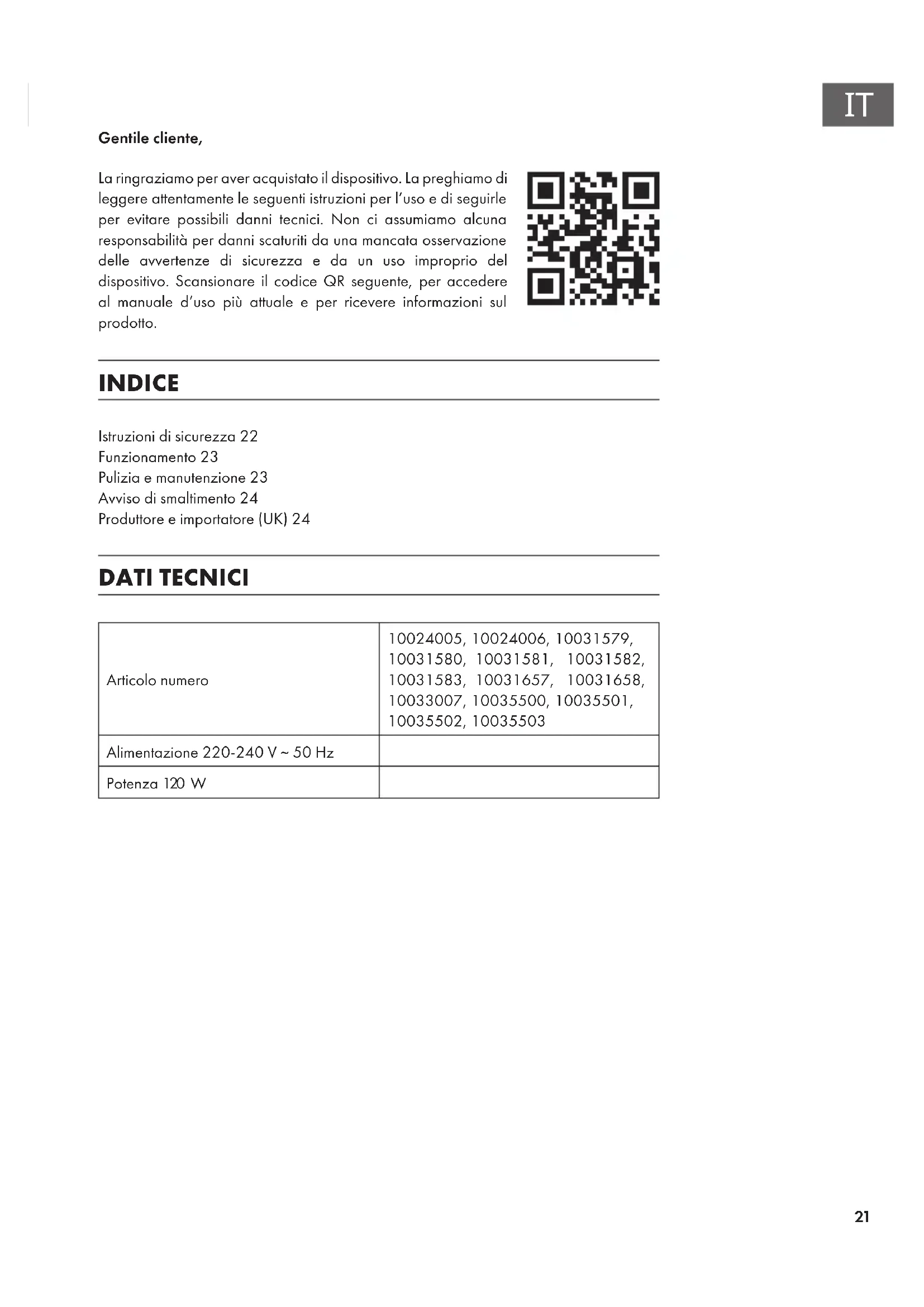 Gentile cliente, La ringraziamo per aver acquistato il dispositivo. La preghiamo di leggere attentamente le seguenti istruzioni per l’uso e di seguirle per evitare possibili danni tecnici. Non ci assumiamo alcuna responsabilità per danni scaturiti da una mancata osservazione delle avvertenze di sicurezza e da un uso improprio del dispositivo. Scansionare il codice QR seguente, per accedere al manuale d’uso più attuale e per ricevere informazioni sul prodotto. INDICE Istruzioni di sicurezza22 Funzionamento23 Pulizia e manutenzione23 Avviso di smaltimento24 Produttore e importatore (UK)24 DATI TECNICI Articolo numero 10024005, 10024006, 10031579, 10031580, 10031581, 10031582, 10031583, 10031657, 10031658, 10033007, 10035500, 10035501, 10035502, 10035503 Alimentazione 220-240 V ~ 50 Hz Potenza 120 W22