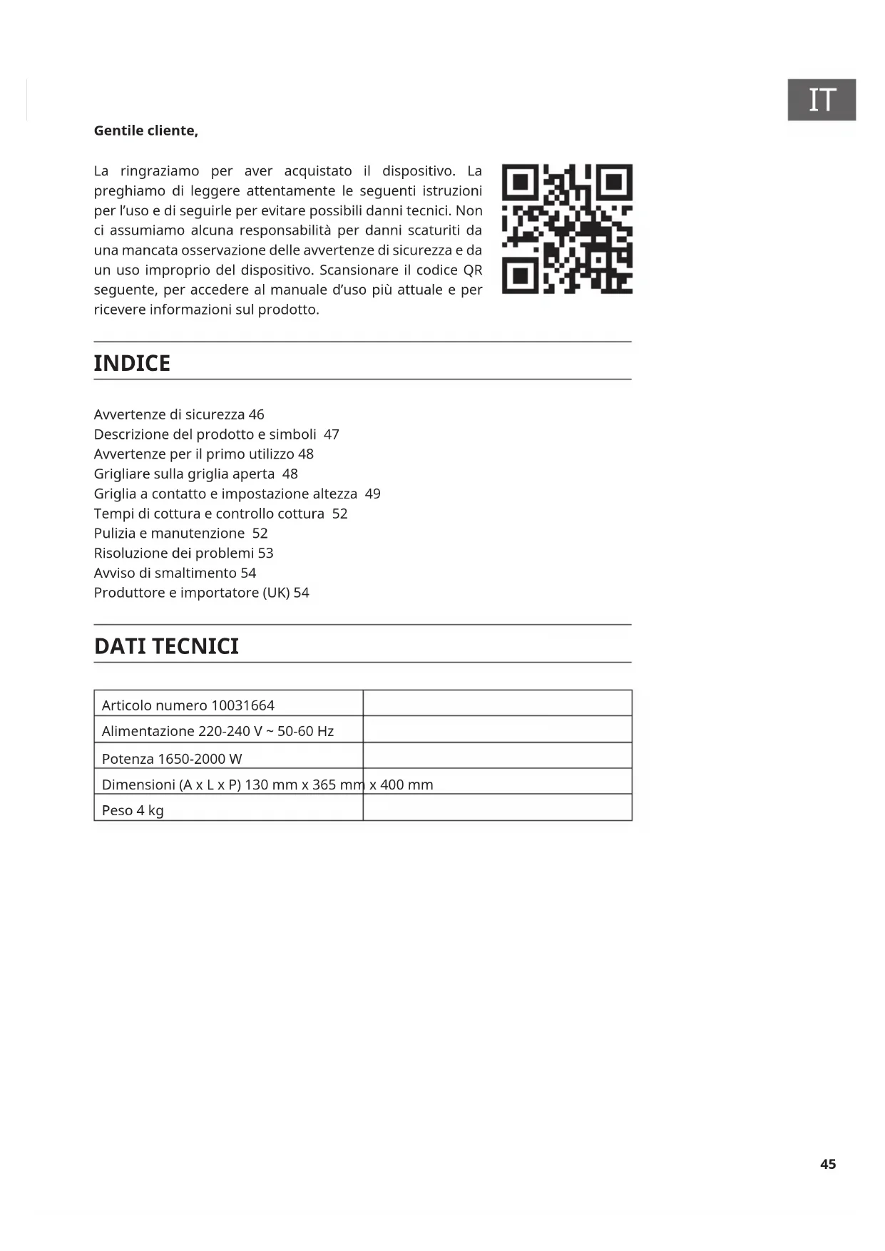 Gentile cliente, La ringraziamo per aver acquistato il dispositivo. La preghiamo di leggere attentamente le seguenti istruzioni per l’uso e di seguirle per evitare possibili danni tecnici. Non ci assumiamo alcuna responsabilità per danni scaturiti da una mancata osservazione delle avvertenze di sicurezza e da un uso improprio del dispositivo. Scansionare il codice QR seguente, per accedere al manuale d’uso più attuale e per ricevere informazioni sul prodotto. INDICE Avvertenze di sicurezza 46 Descrizione del prodotto e simboli 47 Avvertenze per il primo utilizzo 48 Grigliare sulla griglia aperta 48 Griglia a contatto e impostazione altezza 49 Tempi di cottura e controllo cottura 52 Pulizia e manutenzione 52 Risoluzione dei problemi 53 Avviso di smaltimento 54 Produttore e importatore (UK) 54 DATI TECNICI Articolo numero 10031664 Alimentazione 220-240 V ~ 50-60 Hz Potenza 1650-2000 W Dimensioni (A x L x P) 130 mm x 365 mm x 400 mm Peso 4 kg46