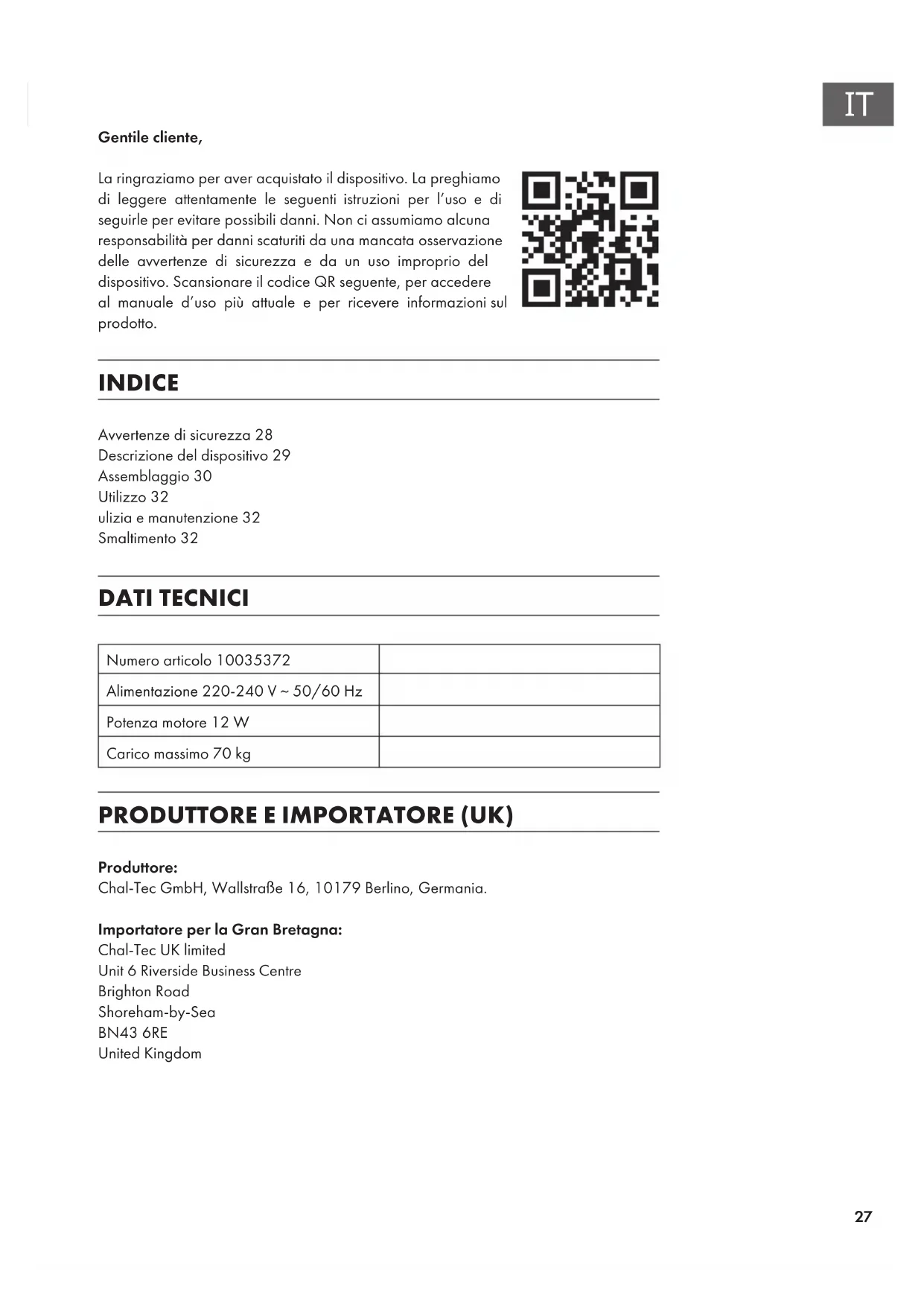 Gentile cliente, La ringraziamo per aver acquistato il dispositivo. La preghiamo di leggere attentamente le seguenti istruzioni per l’uso e di seguirle per evitare possibili danni. Non ci assumiamo alcuna responsabilità per danni scaturiti da una mancata osservazione delle avvertenze di sicurezza e da un uso improprio del dispositivo. Scansionare il codice QR seguente, per accedere al manuale d’uso più attuale e per ricevere informazioni sul prodotto. INDICE Avvertenze di sicurezza28 Descrizione del dispositivo29 Assemblaggio30 Utilizzo32 ulizia e manutenzione32 Smaltimento32 DATI TECNICI Numero articolo 10035372 Alimentazione 220-240 V ~ 50/60 Hz Potenza motore 12 W Carico massimo 70 kg PRODUTTORE E IMPORTATORE (UK) Produttore: Chal-Tec GmbH, Wallstraße 16, 10179 Berlino, Germania. Importatore per la Gran Bretagna: Chal-Tec UK limited Unit 6 Riverside Business Centre Brighton Road Shoreham-by-Sea BN43 6RE United Kingdom28
