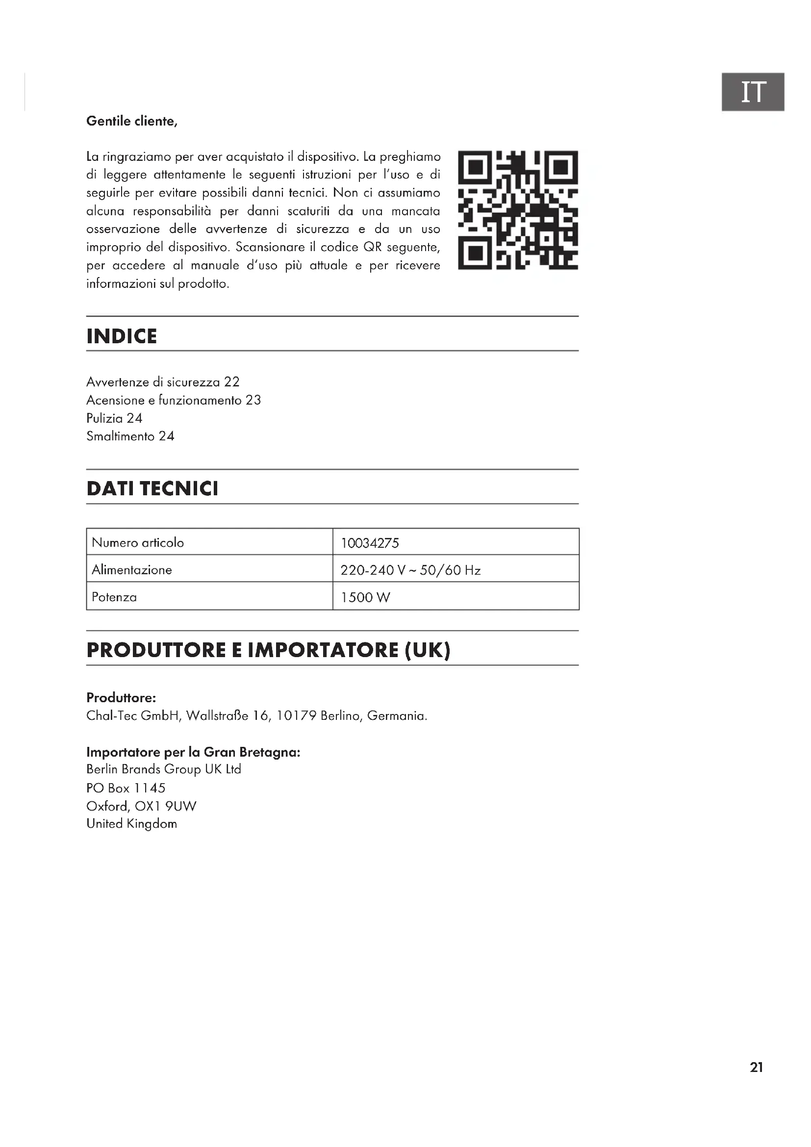 Gentile cliente, La ringraziamo per aver acquistato il dispositivo. La preghiamo di leggere attentamente le seguenti istruzioni per l’uso e di seguirle per evitare possibili danni tecnici. Non ci assumiamo alcuna responsabilità per danni scaturiti da una mancata osservazione delle avvertenze di sicurezza e da un uso improprio del dispositivo. Scansionare il codice QR seguente, per accedere al manuale d’uso più attuale e per ricevere informazioni sul prodotto. INDICE Avvertenze di sicurezza22 Acensione e funzionamento23 Pulizia24 Smaltimento24 DATI TECNICI Numero articolo