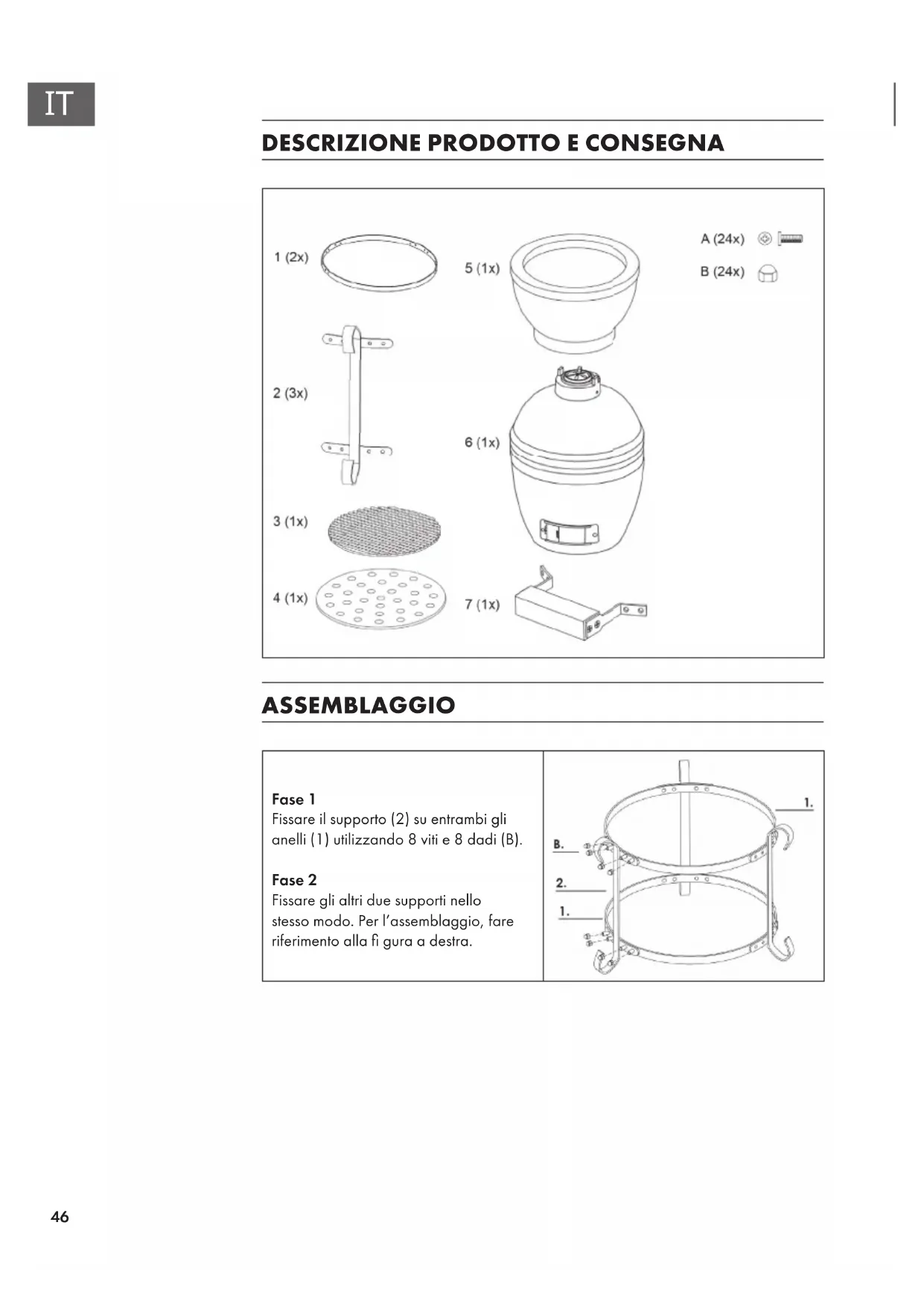 ASSEMBLAGGIO Fase 1 Fissare il supporto (2) su entrambi gli anelli (1) utilizzando 8 viti e 8 dadi (B). Fase 2 Fissare gli altri due supporti nello stesso modo. Per l’assemblaggio, fare riferimento alla gura a destra.47