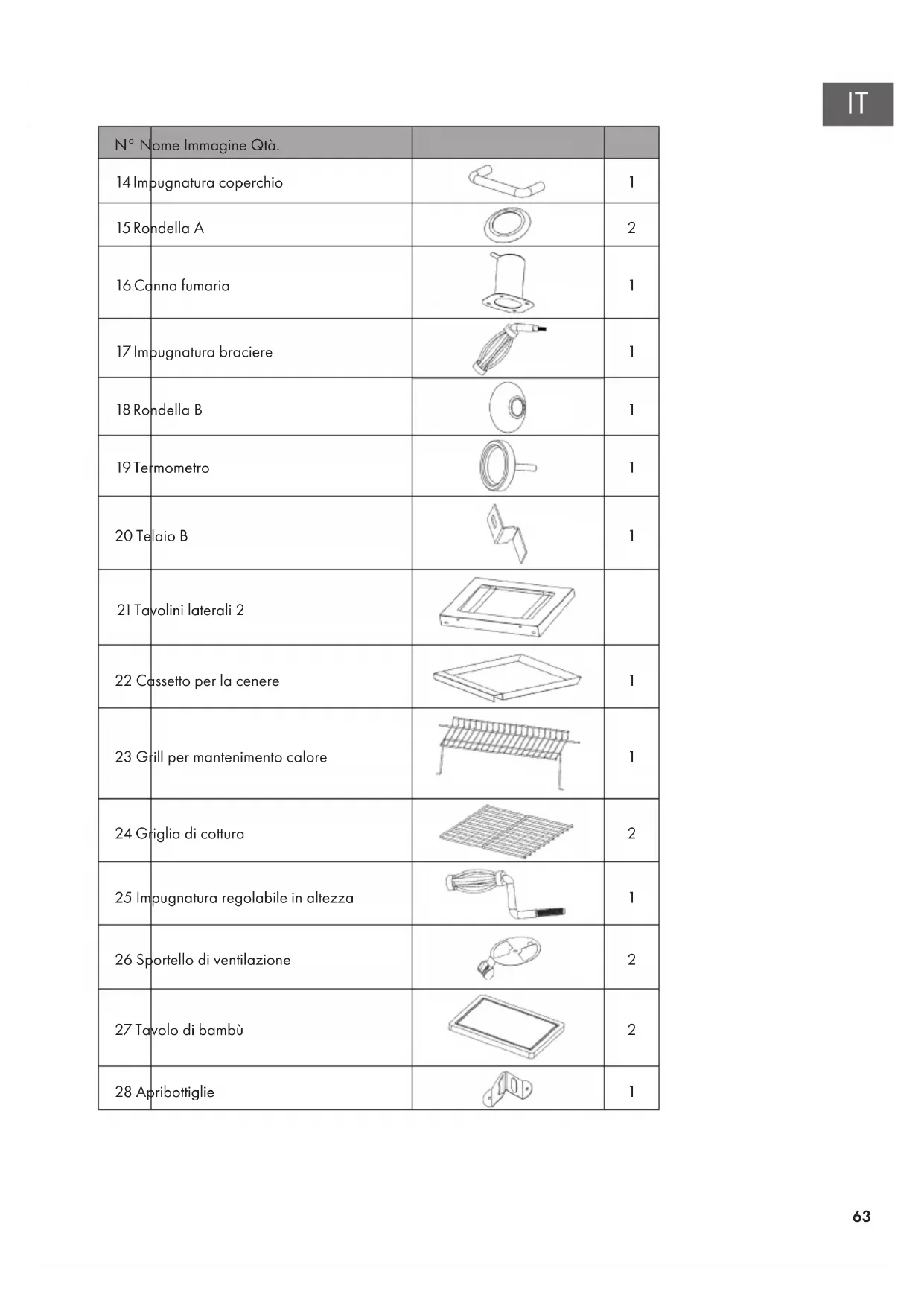 Posizionare i 2 tavolini di bambù (27) sopra ai tavolini laterali. Inserire il cassetto della cenere (22) nel braciere. Aprire il coperchio e inserire le 2 griglia di cottura (23) e il grill di mantenimento calore (24) nel braciere.71
