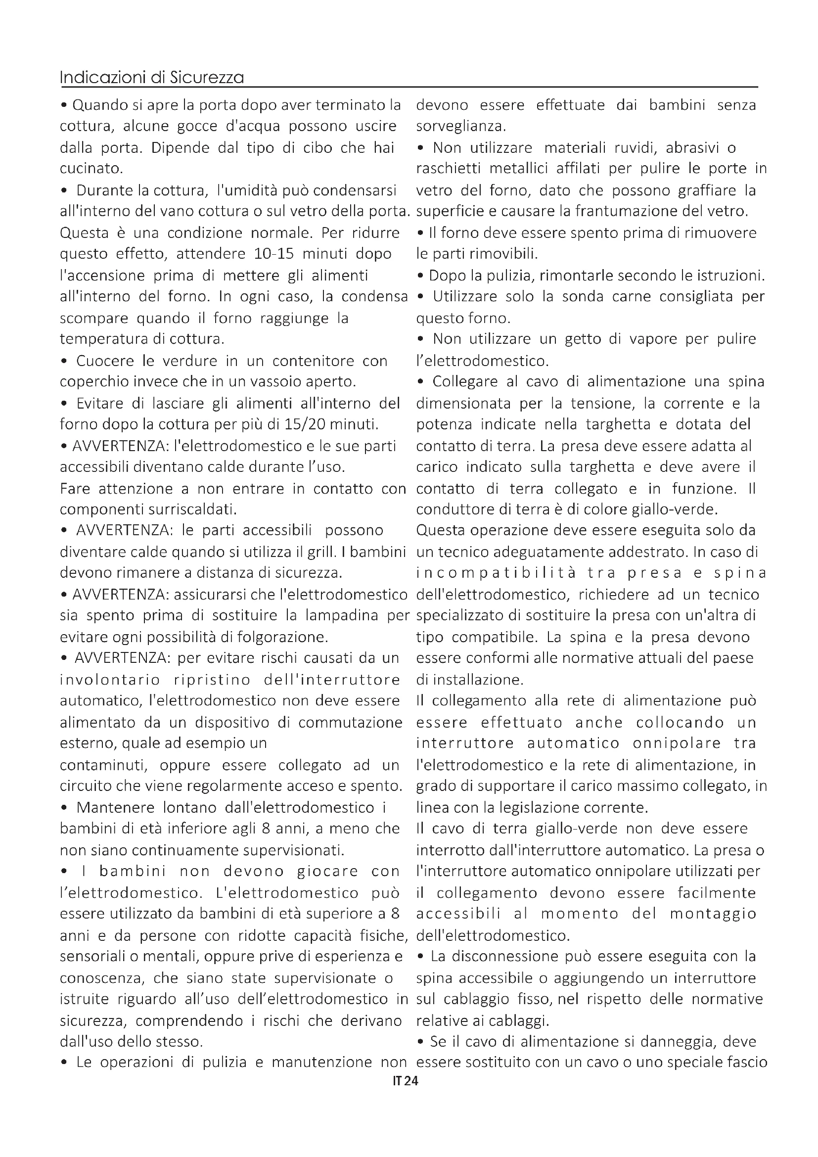 Sommario IT 26Vi ringraziamo per aver scelto uno dei nostri prodotti. Per utilizzare il forno in modo ottimale è consigliabile leggere con attenzione questo manuale e conservarlo con cura per ogni ulteriore consultazione. Prima di installare il forno, prendere nota del numero di serie in modo da poterlo comunicare al personale del servizio di assistenza in caso di richiesta di intervento. Dopo aver rimosso il forno dall’imballaggio, verificare che non abbia subito danni durante il trasporto. In caso di dubbi, non utilizzare il forno e richiedere l’assistenza di un tecnico qualificato. Tenere tutto il materiale da imballaggio (sacchetti di plastica, polistirolo, chiodi) fuori dalla portata dei bambini. Alla prima accensione del forno può svilupparsi fumo di odore acre, causato dal primo riscaldamento del collante dei pannelli d’isolamento avvolgenti il forno: si tratta di un fenomeno assolutamente normale e, in caso si verificasse, occorre attendere la cessazione del fumo prima di introdurre le vivande. Il produttore declina ogni responsabilità in caso di mancata osservanza delle istruzioni contenute in questo documento. NOTA: le funzioni, le proprietà e gli accessori dei forni citati in questo manuale possono variare a seconda dei modelli. Utilizzare il forno solo per lo scopo per cui è stato progettato, ossia solo per la cottura di alimenti; qualsiasi altro utilizzo, ad esempio come fonte di riscaldamento, è considerato improprio e quindi pericoloso. Il costruttore non può essere considerato responsabile per eventuali danni derivanti da usi impropri, erronei ed irragionevoli. L’uso di un qualsiasi apparecchio elettrico comporta l’osservanza di alcune regole fondamentali: - non tirare il cavo di alimentazione per staccare la spina della presa di corrente; - non toccare l’apparecchio con mani o piedi bagnati o umidi; - in generale è sconsigliabile l’uso di adattatori, prese multiple e prolunghe; - in caso di guasto e/o cattivo funzionamento dell’apparecchio, spegnerlo e non manometterlo.