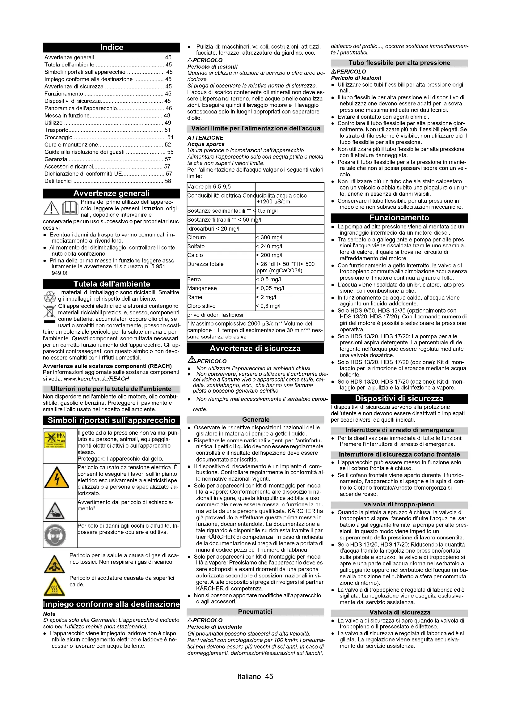 • Dati tecnici Il getto ad alta pressione non va mai pun- tato su persone, animali, equipaggia- menti elettrici attivi o sull’apparecchio stesso. Proteggere l’apparecchio dal gelo. Pericolo causato da tensione elettrica. È consentito eseguire i lavori sull'impianto elettrico esclusivamente a elettricisti spe- cializzati o a personale specializzato au- torizzato. Avvertimento dal pericolo di schiaccia- mento! Pericolo di danni agli occhi e all’udito. In- dossare pressione oculare e uditiva. Pericolo per la salute a causa di gas di sca- rico tossici. Non respirare i gas di scarico. Pericolo di scottature causate da superfici calde. Valore ph 6,5-9,5 Conducibilità elettrica Conducibilità acqua dolce +1200 μS/cm Sostanze sedimentabili ** < 0,5 mg/l Sostanze filtrabili ** < 50 mg/l Idrocarburi < 20 mg/l Cloruro < 300 mg/l Solfato < 240 mg/l Calcio < 200 mg/l Durezza totale < 28 °dH< 50 °TH< 500 ppm (mgCaCO3/l) Ferro < 0,5 mg/l Manganese < 0,05 mg/l Rame < 2 mg/l Cloro attivo < 0,3 mg/l privo di odori fastidiosi p. 58