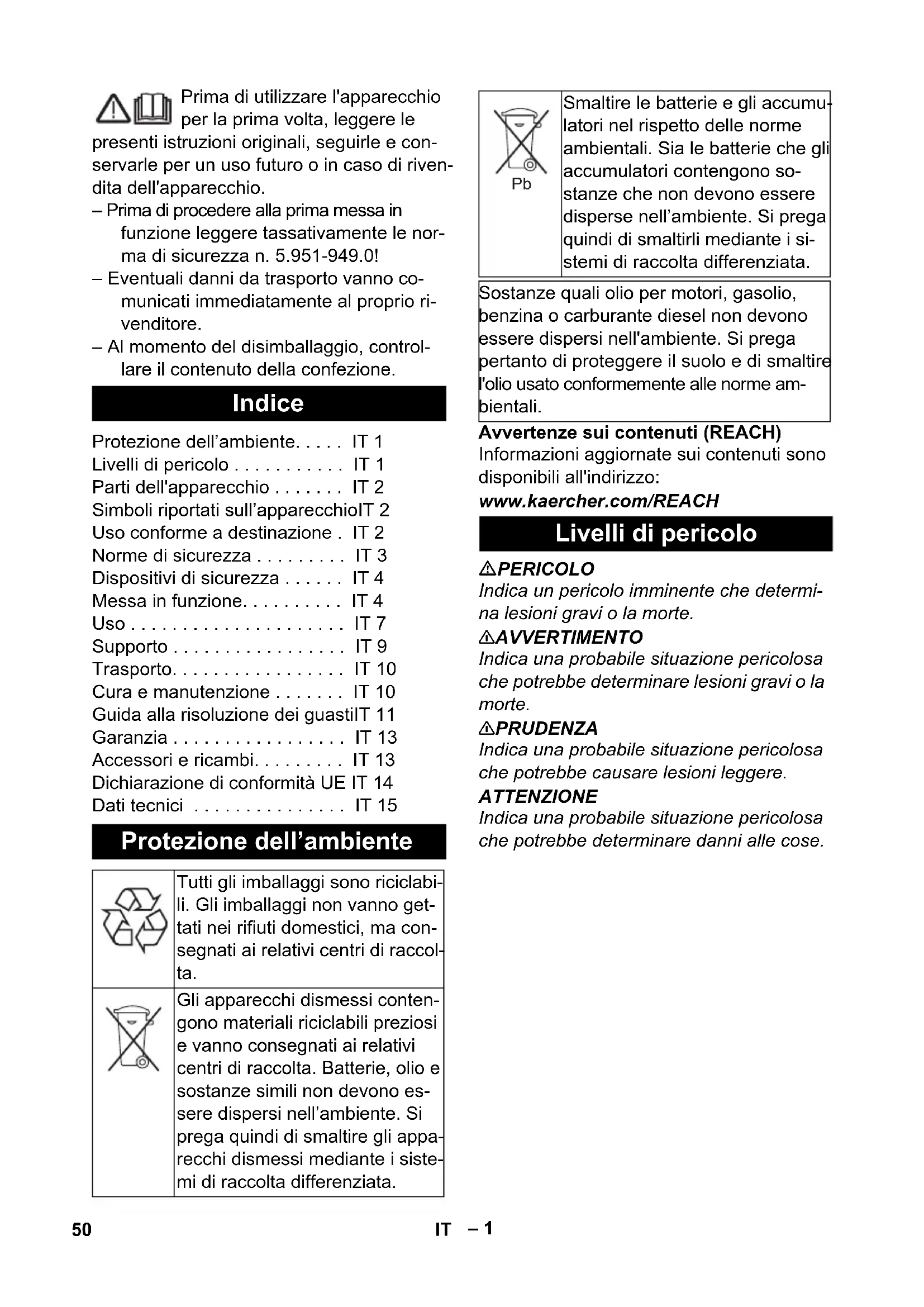 49FR– 1 Prima di utilizzare l'apparecchio per la prima volta, leggere le presenti istruzioni originali, seguirle e con- servarle per un uso futuro o in caso di riven- dita dell'apparecchio. – Prima di procedere alla prima messa in funzione leggere tassativamente le nor- ma di sicurezza n. 5.951-949.0! – Eventuali danni da trasporto vanno co- municati immediatamente al proprio ri- venditore. – Al momento del disimballaggio, control- lare il contenuto della confezione. Avvertenze sui contenuti (REACH) Informazioni aggiornate sui contenuti sono disponibili all'indirizzo: www.kaercher.com/REACH PERICOLO Indica un pericolo imminente che determi- na lesioni gravi o la morte. 몇 AVVERTIMENTO Indica una probabile situazione pericolosa che potrebbe determinare lesioni gravi o la morte. 몇 PRUDENZA Indica una probabile situazione pericolosa che potrebbe causare lesioni leggere. ATTENZIONE Indica una probabile situazione pericolosa che potrebbe determinare danni alle cose. Indice Protezione dell’ambiente... IT 1 Livelli di pericolo ... IT 1 Parti dell'apparecchio ... IT 2 Simboli riportati sull’apparecchioIT 2 Uso conforme a destinazione . IT 2 Norme di sicurezza ... IT 3 Dispositivi di sicurezza ... IT 4 Messa in funzione... IT 4 Uso ... IT 7 Supporto ... IT 9 Trasporto... IT 10 Cura e manutenzione ... IT 10 Guida alla risoluzione dei guastiIT 11 Garanzia ... IT 13 Accessori e ricambi... IT 13 Dichiarazione di conformità UE IT 14 Dati tecnici ... IT 15 Protezione dell’ambiente Tutti gli imballaggi sono riciclabi- li. Gli imballaggi non vanno get- tati nei rifiuti domestici, ma con- segnati ai relativi centri di raccol- ta. Gli apparecchi dismessi conten- gono materiali riciclabili preziosi e vanno consegnati ai relativi centri di raccolta. Batterie, olio e sostanze simili non devono es- sere dispersi nell’ambiente. Si prega quindi di smaltire gli appa- recchi dismessi mediante i siste- mi di raccolta differenziata. Smaltire le batterie e gli accumu- latori nel rispetto delle norme ambientali. Sia le batterie che gli accumulatori contengono so- stanze che non devono essere disperse nell’ambiente. Si prega quindi di smaltirli mediante i si- stemi di raccolta differenziata. Sostanze quali olio per motori, gasolio, benzina o carburante diesel non devono essere dispersi nell'ambiente. Si prega pertanto di proteggere il suolo e di smaltire l'olio usato conformemente alle norme am- bientali. Livelli di pericolo