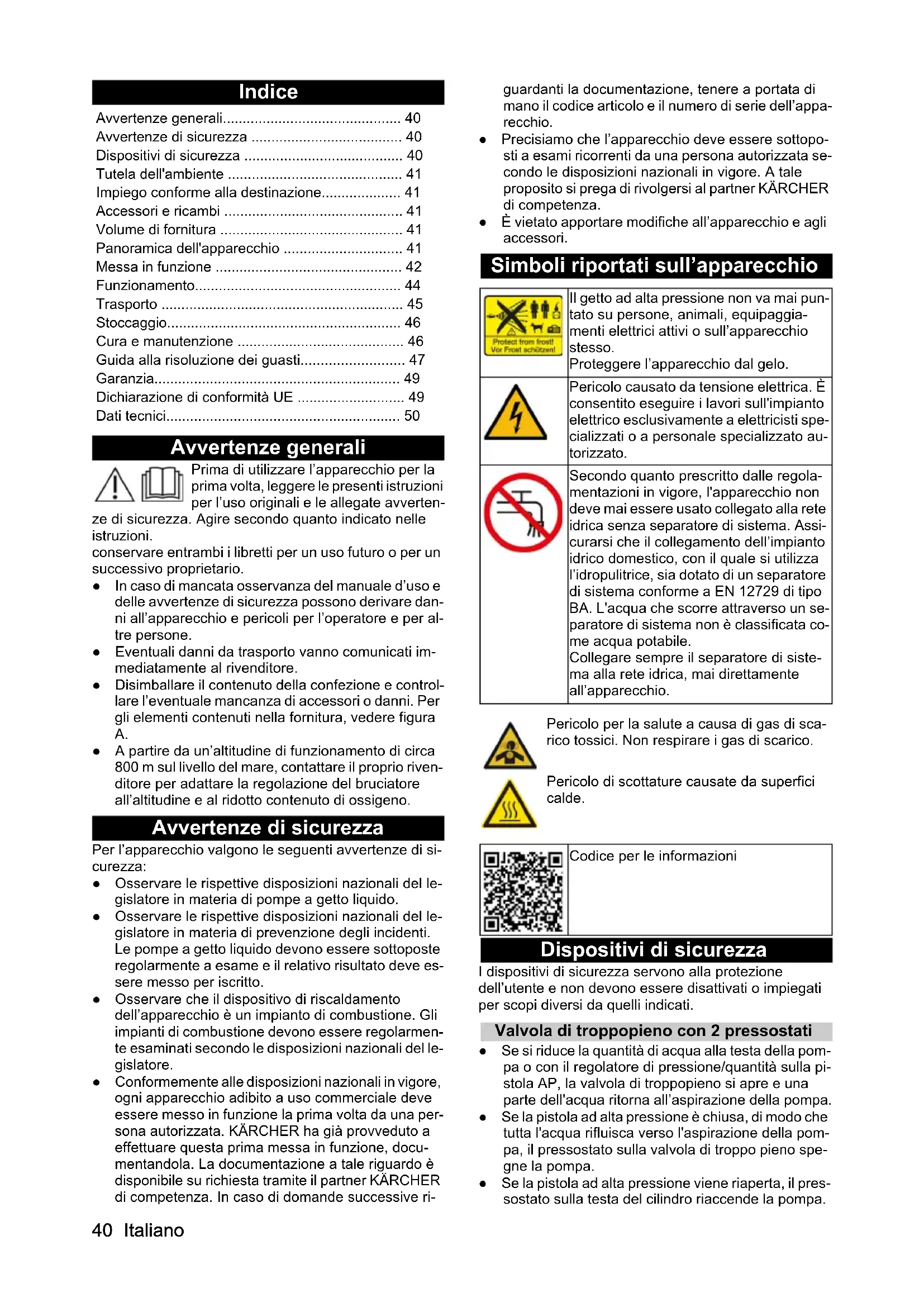 - ● A partire da un’altitudine di funzionamento di circa 800 m sul livello del mare, contattare il proprio riven- ditore per adattare la regolazione del bruciatore all’altitudine e al ridotto contenuto di ossigeno. Avvertenze di sicurezza Per l’apparecchio valgono le seguenti avvertenze di si- curezza: ● Osservare le rispettive disposizioni nazionali del le- gislatore in materia di pompe a getto liquido. ● Osservare le rispettive disposizioni nazionali del le- gislatore in materia di prevenzione degli incidenti. Le pompe a getto liquido devono essere sottoposte regolarmente a esame e il relativo risultato deve es- sere messo per iscritto. ● Osservare che il dispositivo di riscaldamento dell’apparecchio è un impianto di combustione. Gli impianti di combustione devono essere regolarmen- te esaminati secondo le disposizioni nazionali del le- gislatore. ● Conformemente alle disposizioni nazionali in vigore, ogni apparecchio adibito a uso commerciale deve essere messo in funzione la prima volta da una per- sona autorizzata. KÄRCHER ha già provveduto a effettuare questa prima messa in funzione, docu- mentandola. La documentazione a tale riguardo è disponibile su richiesta tramite il partner KÄRCHER di competenza. In caso di domande successive ri- guardanti la documentazione, tenere a portata di mano il codice articolo e il numero di serie dell’appa- recchio. ● Precisiamo che l’apparecchio deve essere sottopo- sti a esami ricorrenti da una persona autorizzata se- condo le disposizioni nazionali in vigore. A tale proposito si prega di rivolgersi al partner KÄRCHER di competenza. ● È vietato apportare modifiche all’apparecchio e agli accessori. Simboli riportati sull’apparecchio Dispositivi di sicurezza I dispositivi di sicurezza servono alla protezione dell’utente e non devono essere disattivati o impiegati per scopi diversi da quelli indicati. Valvola di troppopieno con 2 pressostati ● Se si riduce la quantità di acqua alla testa della pom- pa o con il regolatore di pressione/quantità sulla pi- stola AP, la valvola di troppopieno si apre e una parte dell'acqua ritorna all’aspirazione della pompa. ● Se la pistola ad alta pressione è chiusa, di modo che tutta l'acqua rifluisca verso l'aspirazione della pom- pa, il pressostato sulla valvola di troppo pieno spe- gne la pompa. ● Se la pistola ad alta pressione viene riaperta, il pres- sostato sulla testa del cilindro riaccende la pompa. Avvertenze generali p. 40