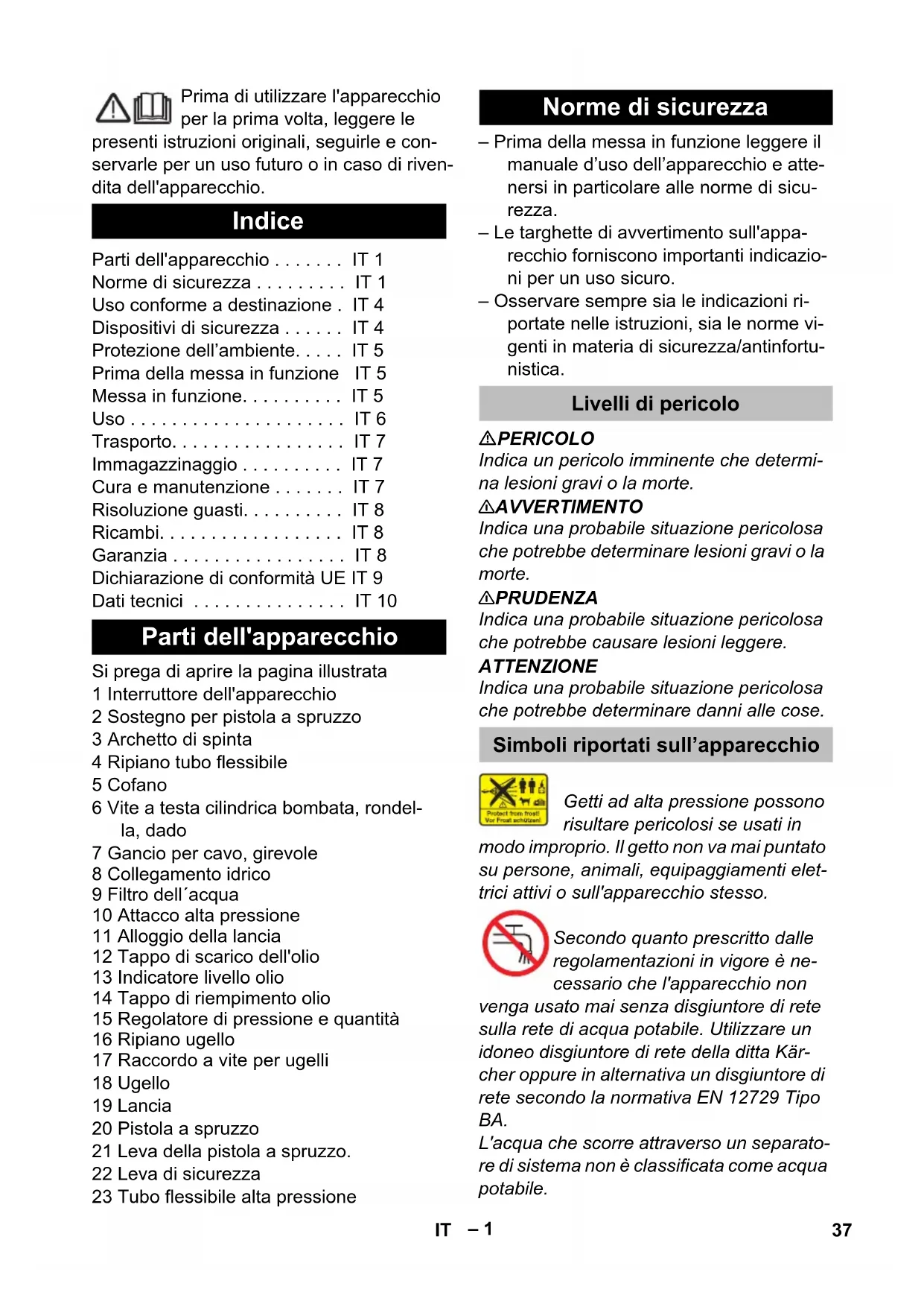 - 36 FR– 1 Prima di utilizzare l'apparecchio per la prima volta, leggere le presenti istruzioni originali, seguirle e con- servarle per un uso futuro o in caso di riven- dita dell'apparecchio. Si prega di aprire la pagina illustrata 1 Interruttore dell'apparecchio 2 Sostegno per pistola a spruzzo 3 Archetto di spinta 4 Ripiano tubo flessibile 5 Cofano 6 Vite a testa cilindrica bombata, rondel- la, dado 7 Gancio per cavo, girevole 8 Collegamento idrico 9 Filtro dell´acqua 10 Attacco alta pressione 11 Alloggio della lancia 12 Tappo di scarico dell'olio 13 Indicatore livello olio 14 Tappo di riempimento olio 15 Regolatore di pressione e quantità 16 Ripiano ugello 17 Raccordo a vite per ugelli 18 Ugello 19 Lancia 20 Pistola a spruzzo 21 Leva della pistola a spruzzo. 22 Leva di sicurezza 23 Tubo flessibile alta pressione – Prima della messa in funzione leggere il manuale d’uso dell’apparecchio e atte- nersi in particolare alle norme di sicu- rezza. – Le targhette di avvertimento sull'appa- recchio forniscono importanti indicazio- ni per un uso sicuro. – Osservare sempre sia le indicazioni ri- portate nelle istruzioni, sia le norme vi- genti in materia di sicurezza/antinfortu- nistica. PERICOLO Indica un pericolo imminente che determi- na lesioni gravi o la morte. 몇 AVVERTIMENTO Indica una probabile situazione pericolosa che potrebbe determinare lesioni gravi o la morte. 몇 PRUDENZA Indica una probabile situazione pericolosa che potrebbe causare lesioni leggere. ATTENZIONE Indica una probabile situazione pericolosa che potrebbe determinare danni alle cose. Getti ad alta pressione possono risultare pericolosi se usati in modo improprio. Il getto non va mai puntato su persone, animali, equipaggiamenti elet- trici attivi o sull'apparecchio stesso. Secondo quanto prescritto dalle regolamentazioni in vigore è ne- cessario che l'apparecchio non venga usato mai senza disgiuntore di rete sulla rete di acqua potabile. Utilizzare un idoneo disgiuntore di rete della ditta Kär- cher oppure in alternativa un disgiuntore di rete secondo la normativa EN 12729 Tipo BA. L'acqua che scorre attraverso un separato- re di sistema non è classificata come acqua potabile. Indice Parti dell'apparecchio IT 1 Norme di sicurezza IT 1 Uso conforme a destinazione . IT 4 Dispositivi di sicurezza IT 4 Protezione dell’ambiente IT 5 Prima della messa in funzione IT 5 Messa in funzione IT 5 Uso IT 6 Trasporto IT 7 Immagazzinaggio IT 7 Cura e manutenzione IT 7 Risoluzione guasti IT 8 Ricambi IT 8 Garanzia IT 8 Dichiarazione di conformità UE IT 9 Dati tecnici