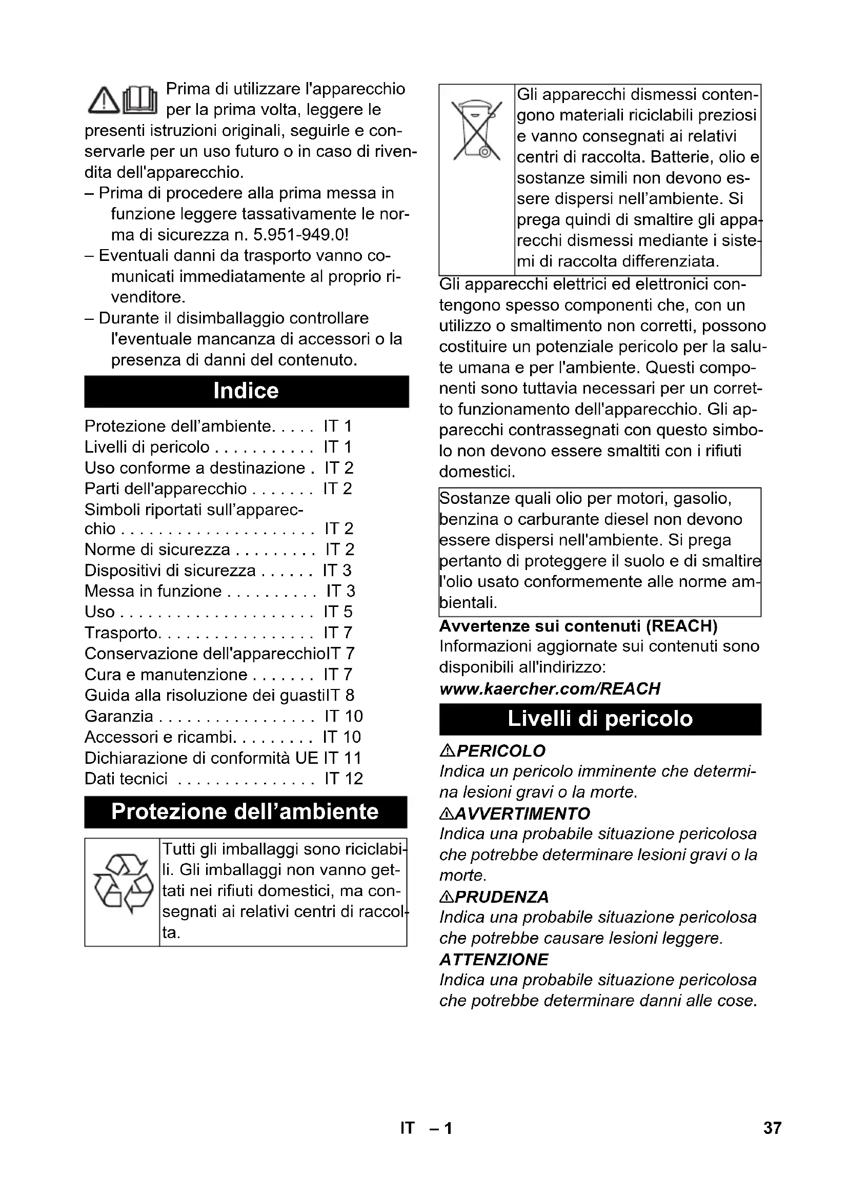 dB(A) 93 97 96 36 FR– 1 Prima di utilizzare l'apparecchio per la prima volta, leggere le presenti istruzioni originali, seguirle e con- servarle per un uso futuro o in caso di riven- dita dell'apparecchio. – Prima di procedere alla prima messa in funzione leggere tassativamente le nor- ma di sicurezza n. 5.951-949.0! – Eventuali danni da trasporto vanno co- municati immediatamente al proprio ri- venditore. – Durante il disimballaggio controllare l'eventuale mancanza di accessori o la presenza di danni del contenuto. Gli apparecchi elettrici ed elettronici con- tengono spesso componenti che, con un utilizzo o smaltimento non corretti, possono costituire un potenziale pericolo per la salu- te umana e per l'ambiente. Questi compo- nenti sono tuttavia necessari per un corret- to funzionamento dell'apparecchio. Gli ap- parecchi contrassegnati con questo simbo- lo non devono essere smaltiti con i rifiuti domestici. Avvertenze sui contenuti (REACH) Informazioni aggiornate sui contenuti sono disponibili all'indirizzo: www.kaercher.com/REACH PERICOLO Indica un pericolo imminente che determi- na lesioni gravi o la morte. 몇 AVVERTIMENTO Indica una probabile situazione pericolosa che potrebbe determinare lesioni gravi o la morte. 몇 PRUDENZA Indica una probabile situazione pericolosa che potrebbe causare lesioni leggere. ATTENZIONE Indica una probabile situazione pericolosa che potrebbe determinare danni alle cose. Indice Protezione dell’ambiente... IT 1 Livelli di pericolo ... IT 1 Uso conforme a destinazione . IT 2 Parti dell'apparecchio ... IT 2 Simboli riportati sull’apparec- chio ... IT 2 Norme di sicurezza ... IT 2 Dispositivi di sicurezza ... IT 3 Messa in funzione ... IT 3 Uso ... IT 5 Trasporto... IT 7 Conservazione dell'apparecchioIT 7 Cura e manutenzione ... IT 7 Guida alla risoluzione dei guastiIT 8 Garanzia ... IT 10 Accessori e ricambi... IT 10 Dichiarazione di conformità UE IT 11 Dati tecnici ... IT 12 Protezione dell’ambiente Tutti gli imballaggi sono riciclabi- li. Gli imballaggi non vanno get- tati nei rifiuti domestici, ma con- segnati ai relativi centri di raccol- ta. Gli apparecchi dismessi conten- gono materiali riciclabili preziosi e vanno consegnati ai relativi centri di raccolta. Batterie, olio e sostanze simili non devono es- sere dispersi nell’ambiente. Si prega quindi di smaltire gli appa- recchi dismessi mediante i siste- mi di raccolta differenziata. Sostanze quali olio per motori, gasolio, benzina o carburante diesel non devono essere dispersi nell'ambiente. Si prega pertanto di proteggere il suolo e di smaltire l'olio usato conformemente alle norme am- bientali. Livelli di pericolo 37IT– 2 Utilizzate questa idropulitrice esclusiva- mente: – per la pulizia di macchinari, veicoli, co- struzioni ed utensili – con accessori e pezzi di ricambio auto- rizzati dalla Kärcher. Figure vedi pag. 2 1 Pistola a spruzzo EASY!Force 2 Dispositivo di arresto di sicurezza 3 Leva a scatto 4 Leva di sicurezza 5 giunto rotante (non per HD 16/15-4 Cage) 6 Tubo flessibile per alta pressione EASY!Lock 7 Contatore ore di funzionamento (opzione) 8 Alloggio della lancia 9 Archetto di spinta 10 Reggitubo/reggicavo 11 Interruttore dell'apparecchio 12 Tappo 13 Spia luminosa stato di funzionamento / guasto 14 Cavo di allacciamento alla rete con spina 15 Bocchettone di riempimento olio (Ser- batoio dell'olio per HD 25/15-4) 16 Collegamento dell'acqua con filtro 17 Regolazione pressione/portata 18 Vano accessori 19 Tappo di scarico dell'olio 20 Indicatore livello olio 21 Tubo flessibile per alta pressione EASY!Lock 22 Manometro 23 Puntello per gru 24 Ugello Power con dado di serraggio 25 Lancia EASY!Lock 26 Regolatore Servo-Press – Gli elementi di comando per il processo di pulizia sono gialli. – Gli elementi di comando per la manu- tenzione ed il service sono grigio chia- ro. 몇 AVVERTIMENTO Rispettare le disposizioni fornite dalla so- cietà per l'approvvigionamento idrico. Secondo quanto prescritto dalle regolamentazioni in vigore è ne- cessario che l'apparecchio non venga usato mai senza separatore di sistema sulla rete di acqua potabile. Uti- lizzare un idoneo separatore di sistema del- la ditta KÄRCHER oppure in alternativa un separatore di sistema secondo la norma EN 12729 tipo BA. L'acqua che scorre attraverso un separato- re di sistema non è classificata come acqua potabile. 몇 PRUDENZA Collegare il separatore di sistema sempre alla mandata dell'acqua, mai direttamente all'apparecchio. PERICOLO Pericolo di lesioni! – Utilizzare solo tubi flessibili d'alta pres- sione originali. – Il tubo flessibile d'alta pressione e il di- spositivo a spruzzo devono essere indi- cati per la sovrapressione massima in- dicata nei Dati tecnici. – Evitare il contatto con agenti chimici. Uso conforme a destinazione Parti dell'apparecchio Contrassegno colore Simboli riportati sull’apparecchio Getti ad alta pressione possono risultare perico- losi se usati in modo non conforme a destinazione. Il getto non va mai punta- to su persone, animali, equipaggiamenti elettrici attivi o sull'apparecchio stesso. Pericolo di danneggia- mento causato da acqua congelata! Svuotare l'ap- parecchio durante l'inver- no oppure collocarlo in un locale riscaldato. Norme di sicurezza 38 IT– 3 – Controllare giornalmente il tubo flessibi- le d'alta pressione. Non utilizzare più tubi flessibili piegati. Se è visibile lo strato filato esterno, non utilizzare più il tubo flessibile d'alta pressione. – Non utilizzare il tubo flessibile d'alta pressione con filettatura danneggiata. – Posare il tubo flessibile d'alta pressione in modo non possa essere calpestato. – Non utilizzare più il tubo flessibile solle- citato da calpestio, piegatura, urti, an- che se non è visibile alcun danneggia- mento. – Posare il tubo flessibile d'alta pressione in modo che non si verifichino sollecita- zioni meccaniche. – È vietato apportare modifiche all'appa- recchio/accessori. I dispositivi di sicur