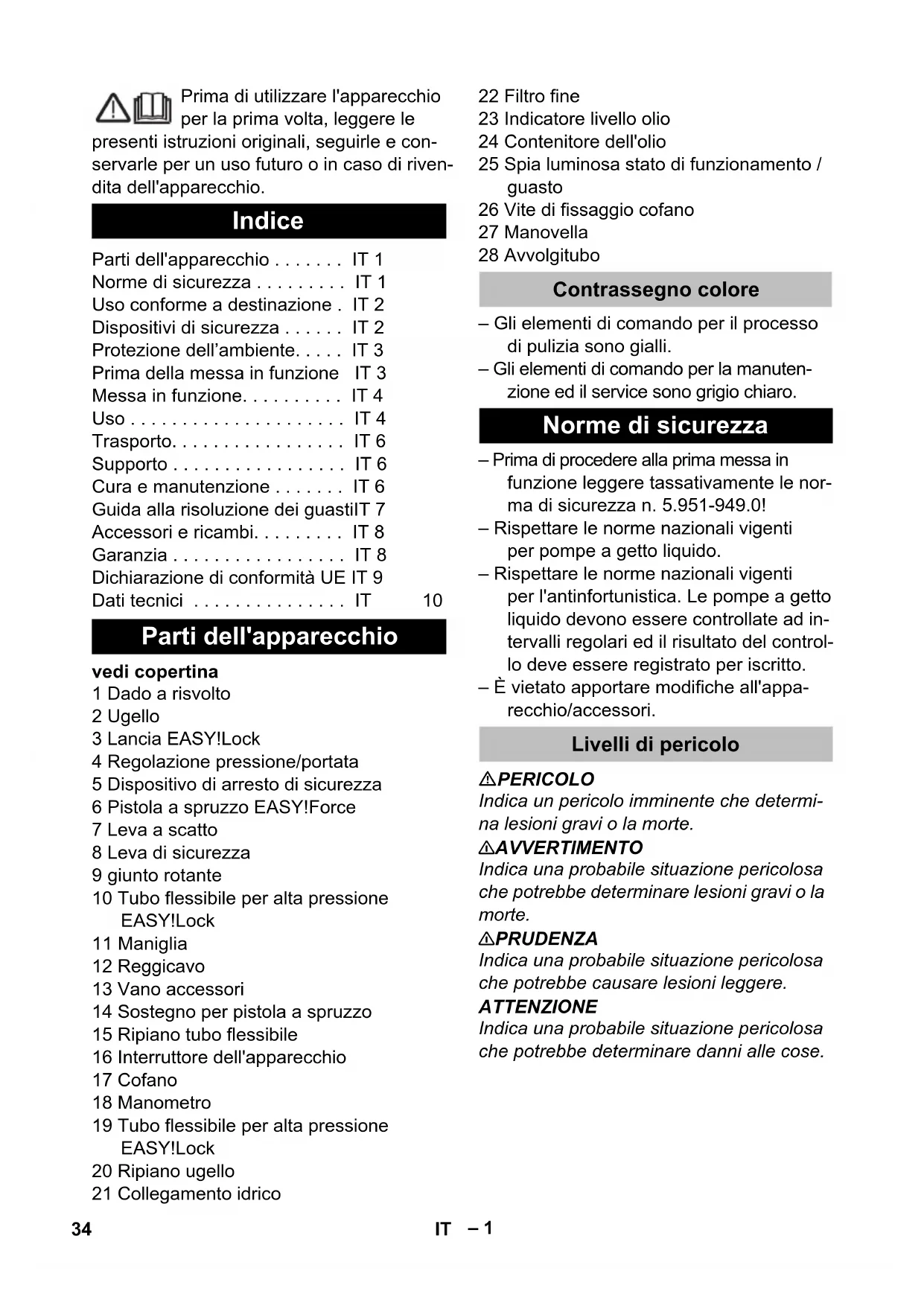 • 33FR– 1 Prima di utilizzare l'apparecchio per la prima volta, leggere le presenti istruzioni originali, seguirle e con- servarle per un uso futuro o in caso di riven- dita dell'apparecchio. vedi copertina 1 Dado a risvolto 2 Ugello 3 Lancia EASY!Lock 4 Regolazione pressione/portata 5 Dispositivo di arresto di sicurezza 6 Pistola a spruzzo EASY!Force 7 Leva a scatto 8 Leva di sicurezza 9 giunto rotante 10 Tubo flessibile per alta pressione EASY!Lock 11 Maniglia 12 Reggicavo 13 Vano accessori 14 Sostegno per pistola a spruzzo 15 Ripiano tubo flessibile 16 Interruttore dell'apparecchio 17 Cofano 18 Manometro 19 Tubo flessibile per alta pressione EASY!Lock 20 Ripiano ugello 21 Collegamento idrico 22 Filtro fine 23 Indicatore livello olio 24 Contenitore dell'olio 25 Spia luminosa stato di funzionamento / guasto 26 Vite di fissaggio cofano 27 Manovella 28 Avvolgitubo – Gli elementi di comando per il processo di pulizia sono gialli. – Gli elementi di comando per la manuten- zione ed il service sono grigio chiaro. – Prima di procedere alla prima messa in funzione leggere tassativamente le nor- ma di sicurezza n. 5.951-949.0! – Rispettare le norme nazionali vigenti per pompe a getto liquido. – Rispettare le norme nazionali vigenti per l'antinfortunistica. Le pompe a getto liquido devono essere controllate ad in- tervalli regolari ed il risultato del control- lo deve essere registrato per iscritto. – È vietato apportare modifiche all'appa- recchio/accessori. PERICOLO Indica un pericolo imminente che determi- na lesioni gravi o la morte. 몇 AVVERTIMENTO Indica una probabile situazione pericolosa che potrebbe determinare lesioni gravi o la morte. 몇 PRUDENZA Indica una probabile situazione pericolosa che potrebbe causare lesioni leggere. ATTENZIONE Indica una probabile situazione pericolosa che potrebbe determinare danni alle cose. Indice Parti dell'apparecchio IT 1 Norme di sicurezza IT 1 Uso conforme a destinazione . IT 2 Dispositivi di sicurezza IT 2 Protezione dell’ambiente IT 3 Prima della messa in funzione IT 3 Messa in funzione IT 4 Uso IT 4 Trasporto IT 6 Supporto IT 6 Cura e manutenzione IT 6 Guida alla risoluzione dei guastiIT 7 Accessori e ricambi IT 8 Garanzia IT 8 Dichiarazione di conformità UE IT 9 Dati tecnici