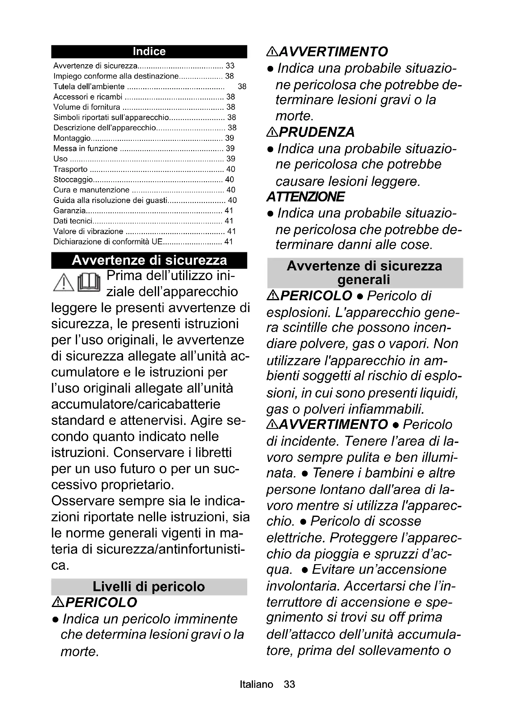 • 1,5 Dimensions et poids Longueur x largeur x hauteur mm 1329 x 3 12 x 327 Poids (sans bloc-batterie) kg 2,2 Chairman of the Board of ManagementDirector Regulatory Affairs & Certification H. Jenner S. ReiserItaliano 33 Indice Avvertenze di sicurezza Prima dell’utilizzo ini- ziale dell’apparecchio leggere le presenti avvertenze di sicurezza, le presenti istruzioni per l’uso originali, le avvertenze di sicurezza allegate all’unità ac- cumulatore e le istruzioni per l’uso originali allegate all’unità accumulatore/caricabatterie standard e attenervisi. Agire se- condo quanto indicato nelle istruzioni. Conservare i libretti per un uso futuro o per un suc- cessivo proprietario. Osservare sempre sia le indica- zioni riportate nelle istruzioni, sia le norme generali vigenti in ma- teria di sicurezza/antinfortunisti- ca. Livelli di pericolo PERICOLO ● Indica un pericolo imminente che determina lesioni gravi o la morte. 몇 AVVERTIMENTO ● Indica una probabile situazio- ne pericolosa che potrebbe de- terminare lesioni gravi o la morte. 몇 PRUDENZA ● Indica una probabile situazio- ne pericolosa che potrebbe causare lesioni leggere. ATTENZIONE ● Indica una probabile situazio- ne pericolosa che potrebbe de- terminare danni alle cose. Avvertenze di sicurezza generali PERICOLO ● Pericolo di esplosioni. L'apparecchio gene- ra scintille che possono incen- diare polvere, gas o vapori. Non utilizzare l'apparecchio in am- bienti soggetti al rischio di esplo- sioni, in cui sono presenti liquidi, gas o polveri infiammabili. 몇 AVVERTIMENTO ● Pericolo di incidente. Tenere l’area di la- voro sempre pulita e ben illumi- nata. ● Tenere i bambini e altre persone lontano dall'area di la- voro mentre si utilizza l'apparec- chio. ● Pericolo di scosse elettriche. Proteggere l’apparec- chio da pioggia e spruzzi d’ac- qua. ● Evitare un’accensione involontaria. Accertarsi che l’in- terruttore di accensione e spe- gnimento si trovi su off prima dell’attacco dell’unità accumula- tore, prima del sollevamento o Avvertenze di sicurezza p. 33