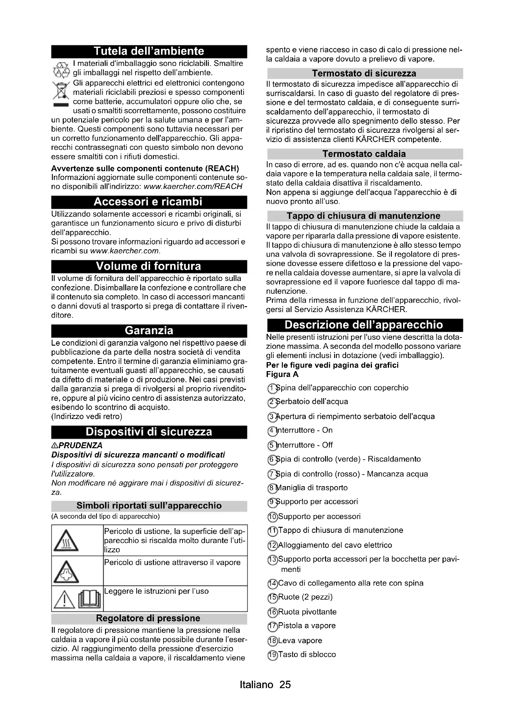 - Dati tecnici Italiano 25 Tutela dell’ambiente I materiali d'imballaggio sono riciclabili. Smaltire gli imballaggi nel rispetto dell’ambiente. Gli apparecchi elettrici ed elettronici contengono materiali riciclabili preziosi e spesso componenti come batterie, accumulatori oppure olio che, se usati o smaltiti scorrettamente, possono costituire un potenziale pericolo per la salute umana e per l'am- biente. Questi componenti sono tuttavia necessari per un corretto funzionamento dell'apparecchio. Gli appa- recchi contrassegnati con questo simbolo non devono essere smaltiti con i rifiuti domestici. Avvertenze sulle componenti contenute (REACH) Informazioni aggiornate sulle componenti contenute so- no disponibili all'indirizzo: www.kaercher.com/REACH Accessori e ricambi Utilizzando solamente accessori e ricambi originali, si garantisce un funzionamento sicuro e privo di disturbi dell'apparecchio. Si possono trovare informazioni riguardo ad accessori e ricambi su www.kaercher.com. Volume di fornitura Il volume di fornitura dell’apparecchio è riportato sulla confezione. Disimballare la confezione e controllare che il contenuto sia completo. In caso di accessori mancanti o danni dovuti al trasporto si prega di contattare il riven- ditore. Garanzia Le condizioni di garanzia valgono nel rispettivo paese di pubblicazione da parte della nostra società di vendita competente. Entro il termine di garanzia eliminiamo gra- tuitamente eventuali guasti all’apparecchio, se causati da difetto di materiale o di produzione. Nei casi previsti dalla garanzia si prega di rivolgersi al proprio rivendito- re, oppure al più vicino centro di assistenza autorizzato, esibendo lo scontrino di acquisto. (Indirizzo vedi retro) Dispositivi di sicurezza 몇 PRUDENZA Dispositivi di sicurezza mancanti o modificati I dispositivi di sicurezza sono pensati per proteggere l'utilizzatore. Non modificare né aggirare mai i dispositivi di sicurez- za. Simboli riportati sull’apparecchio (A seconda del tipo di apparecchio) Regolatore di pressione Il regolatore di pressione mantiene la pressione nella caldaia a vapore il più costante possibile durante l’eser- cizio. Al raggiungimento della pressione d'esercizio massima nella caldaia a vapore, il riscaldamento viene spento e viene riacceso in caso di calo di pressione nel- la caldaia a vapore dovuto a prelievo di vapore. Termostato di sicurezza Il termostato di sicurezza impedisce all’apparecchio di surriscaldarsi. In caso di guasto del regolatore di pres- sione e del termostato caldaia, e di conseguente surri- scaldamento dell’apparecchio, il termostato di sicurezza provvede allo spegnimento dello stesso. Per il ripristino del termostato di sicurezza rivolgersi al ser- vizio di assistenza clienti KÄRCHER competente. Termostato caldaia In caso di errore, ad es. quando non c'è acqua nella cal- daia vapore e la temperatura nella caldaia sale, il termo- stato della caldaia disattiva il riscaldamento. Non appena si aggiunge dell'acqua l'apparecchio è di nuovo pronto all’uso. Tappo di chiusura di manutenzione Il tappo di chiusura di manutenzione chiude la caldaia a vapore per ripararla dalla pressione di vapore esistente. Il tappo di chiusura di manutenzione è allo stesso tempo una valvola di sovrapressione. Se il regolatore di pres- sione dovesse essere difettoso e la pressione del vapo- re nella caldaia dovesse aumentare, si apre la valvola di sovrapressione ed il vapore fuoriesce dal tappo di ma- nutenzione. Prima della rimessa in funzione dell’apparecchio, rivol- gersi al Servizio Assistenza KÄRCHER. Descrizione dell’apparecchio Nelle presenti istruzioni per l'uso viene descritta la dota- zione massima. A seconda del modello possono variare gli elementi inclusi in dotazione (vedi imballaggio). Per le figure vedi pagina dei grafici Figura A 1 Spina dell'apparecchio con coperchio 2 Serbatoio dell’acqua 3 Apertura di riempimento serbatoio dell'acqua 4 Interruttore - On 5 Interruttore - Off 6 Spia di controllo (verde) - Riscaldamento 7 Spia di controllo (rosso) - Mancanza acqua 8 Maniglia di trasporto 9 Supporto per accessori 10 Supporto per accessori 11 Tappo di chiusura di manutenzione 12 Alloggiamento del cavo elettrico 13 Supporto porta accessori per la bocchetta per pavi- menti 14 Cavo di collegamento alla rete con spina 15 Ruote (2 pezzi) 16 Ruota pivottante 17 Pistola a vapore 18 Leva vapore 19 Tasto di sblocco Pericolo di ustione, la superficie dell’ap- parecchio si riscalda molto durante l’uti- lizzo Pericolo di ustione attraverso il vapore Leggere le istruzioni per l’uso26 Italiano 20 Selettore per quantità di vapore (con sicura per bambini) 21 Tubo flessibile vapore 22 Spina del tubo flessibile vapore 23 Ugello a getto puntiforme 24 Spazzola rotonda (piccola) 25 **Ugello Power 26 **Spazzola rotonda (grande) 27 Ugello manuale 28 Rivestimento in microfibra ugello manuale 29 Tubi di prolunga (2 pezzi) 30 Tasto di sblocco 31 Bocchetta per pavimenti 32 Attacco a strappo 33 Panno in microfibra per pavimenti (1 pezzo) 34 **Panno in microfibra per pavimenti (2 pezzi) 35 **Piastra 36 Decalcificante 37 Ferro da stiro a vapore 38 Spia di controllo (arancione) - Riscaldamento 39 Tasto vapore (inferiore) 40 Spina del tubo flessibile vapore ** opzionale Montaggio Montaggio accessori p. 31