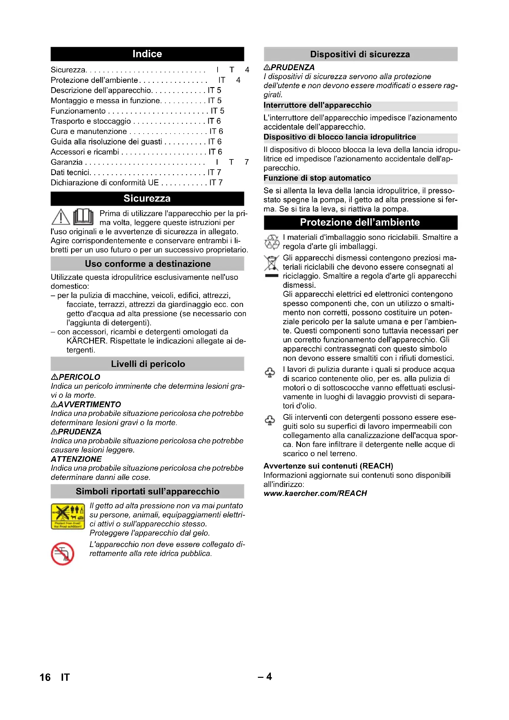 93 dB(A) Sous réserve de modifications techniques. Déclaration UE de conformité Produit : Nettoyeur haute pression Type : 1.673-xxx Directives européennes en vigueur : 2011/65/UE 2000/14/CE 2006/42/CE (+2009/127/CE) 2014/30/UE Normes harmonisées appliquées : EN 60335–1 EN 60335–2–79 EN 62233: 2008 EN 55014–1:2017 EN 55014–2: 2015 EN 61000–3–2: 2014 EN 61000–3–3: 2013 EN IEC 63000: 2018 Procédures d'évaluation de la conformité 2000/14/CE: Annexe V Niveau de puissance acoustique dB(A) Mesuré: 90 Garanti: 93 Chairman of the Board of Management Director Regulatory Affairs & Certification 15FR– 4 Prima di utilizzare l'apparecchio per la pri- ma volta, leggere queste istruzioni per l'uso originali e le avvertenze di sicurezza in allegato. Agire corrispondentemente e conservare entrambi i li- bretti per un uso futuro o per un successivo proprietario. Utilizzate questa idropulitrice esclusivamente nell'uso domestico: – per la pulizia di macchine, veicoli, edifici, attrezzi, facciate, terrazzi, attrezzi da giardinaggio ecc. con getto d'acqua ad alta pressione (se necessario con l'aggiunta di detergenti). – con accessori, ricambi e detergenti omologati da KÄRCHER. Rispettate le indicazioni allegate ai de- tergenti. PERICOLO Indica un pericolo imminente che determina lesioni gra- vi o la morte. 몇 AVVERTIMENTO Indica una probabile situazione pericolosa che potrebbe determinare lesioni gravi o la morte. 몇 PRUDENZA Indica una probabile situazione pericolosa che potrebbe causare lesioni leggere. ATTENZIONE Indica una probabile situazione pericolosa che potrebbe determinare danni alle cose. 몇 PRUDENZA I dispositivi di sicurezza servono alla protezione dell'utente e non devono essere modificati o essere rag- girati. L'interruttore dell'apparecchio impedisce l'azionamento accidentale dell'apparecchio. Il dispositivo di blocco blocca la leva della lancia idropu- litrice ed impedisce l'azionamento accidentale dell'ap- parecchio. Se si allenta la leva della lancia idropulitrice, il presso- stato spegne la pompa, il getto ad alta pressione si fer- ma. Se si tira la leva, si riattiva la pompa. Avvertenze sui contenuti (REACH) Informazioni aggiornate sui contenuti sono disponibili all'indirizzo: www.kaercher.com/REACH Indice Sicurezza...IT4 Protezione dell’ambiente... IT 4 Descrizione dell’apparecchio... IT 5 Montaggio e messa in funzione... IT 5 Funzionamento ... IT 5 Trasporto e stoccaggio ... IT 6 Cura e manutenzione ... IT 6 Guida alla risoluzione dei guasti ... IT 6 Accessori e ricambi ... IT 6 Garanzia ...IT7 Dati tecnici... IT 7 Dichiarazione di conformità UE ... IT 7 Sicurezza Uso conforme a destinazione Livelli di pericolo Simboli riportati sull’apparecchio Il getto ad alta pressione non va mai puntato su persone, animali, equipaggiamenti elettri- ci attivi o sull'apparecchio stesso. Proteggere l'apparecchio dal gelo. L'apparecchio non deve essere collegato di- rettamente alla rete idrica pubblica. Dispositivi di sicurezza Interruttore dell'apparecchio Dispositivo di blocco lancia idropulitrice Funzione di stop automatico Protezione dell’ambiente I materiali d'imballaggio sono riciclabili. Smaltire a regola d'arte gli imballaggi. Gli apparecchi dismessi contengono preziosi ma- teriali riciclabili che devono essere consegnati al riciclaggio. Smaltire a regola d'arte gli apparecchi dismessi. Gli apparecchi elettrici ed elettronici contengono spesso componenti che, con un utilizzo o smalti- mento non corretti, possono costituire un poten- ziale pericolo per la salute umana e per l'ambien- te. Questi componenti sono tuttavia necessari per un corretto funzionamento dell'apparecchio. Gli apparecchi contrassegnati con questo simbolo non devono essere smaltiti con i rifiuti domestici. I lavori di pulizia durante i quali si produce acqua di scarico contenente olio, per es. alla pulizia di motori o di sottoscocche vanno effettuati esclusi- vamente in luoghi di lavaggio provvisti di separa- tori d'olio. Gli interventi con detergenti possono essere ese- guiti solo su superfici di lavoro impermeabili con collegamento alla canalizzazione dell'acqua spor- ca. Non fare infiltrare il detergente nelle acque di scarico o nel terreno. 16 IT– 5 L'equipaggiamento dell'apparecchio (in funzione del modello) è riportato sulla confezione. Le presenti istru- zioni per l'uso descrivono tutte le opzioni possibili. Per le figure vedi pagine con grafico 1 Attacco alta pressione 2 Interruttore dell'apparecchio „0/OFF“ / „I/ON“ 3 Custodia per tubo flessibile di alta pressione 4 Maniglia di trasporto 5 Custodia per lancia 6 Collegamento dell'acqua con filtro montato 7 Giunto per collegamento dell'acqua 8 Cavo di allacciamento alla rete con connettore 9 Targhetta 10 Lancia dell'idropulitrice 11 Dispositivo di blocco lancia idropulitrice 12 Tubo flessibile alta pressione 13 Morsetto per tubo flessibile di alta pressione 14 Lancia con ugello alta pressione Per operazioni normali di pulizia. 15 Lancia con fresa per lo sporco Per lo sporco più resistente Per le figure vedi pagine con grafico Figura Prima della messa in funzione montare i compo- nenti singoli dell'apparecchio. Posizionare l'apparecchio su una superficie piana. Figura Estrarre il morsetto dalla lancia dell'idropulitrice ed inserire il tubo flessibile per alta pressione nella lancia. Introdurre il morsetto fino al suo aggancio. Accer- tarsi del corretto aggancio tirando il tubo flessibile di alta pressione. Figura ATTENZIONE Impurità nell'acqua possono danneggiare la pompa ad alta pressione e gli accessori. Consigliamo come prote- zione di utilizzare il filtro per l'acqua KÄRCHER (acces- sorio speciale, codice d'ordine 4.730-059). 몇 PRUDENZA Un funzionamento a secco di oltre 2 minuti determina dei danneggiamenti sulla pompa ad alta pressione. Nel caso in cui l'apparecchio non produca alcuna pressione entro 2 minuti, spegnere l'apparecchio e procedere se- condo le indicazioni riportate al capitolo „Guida alla r