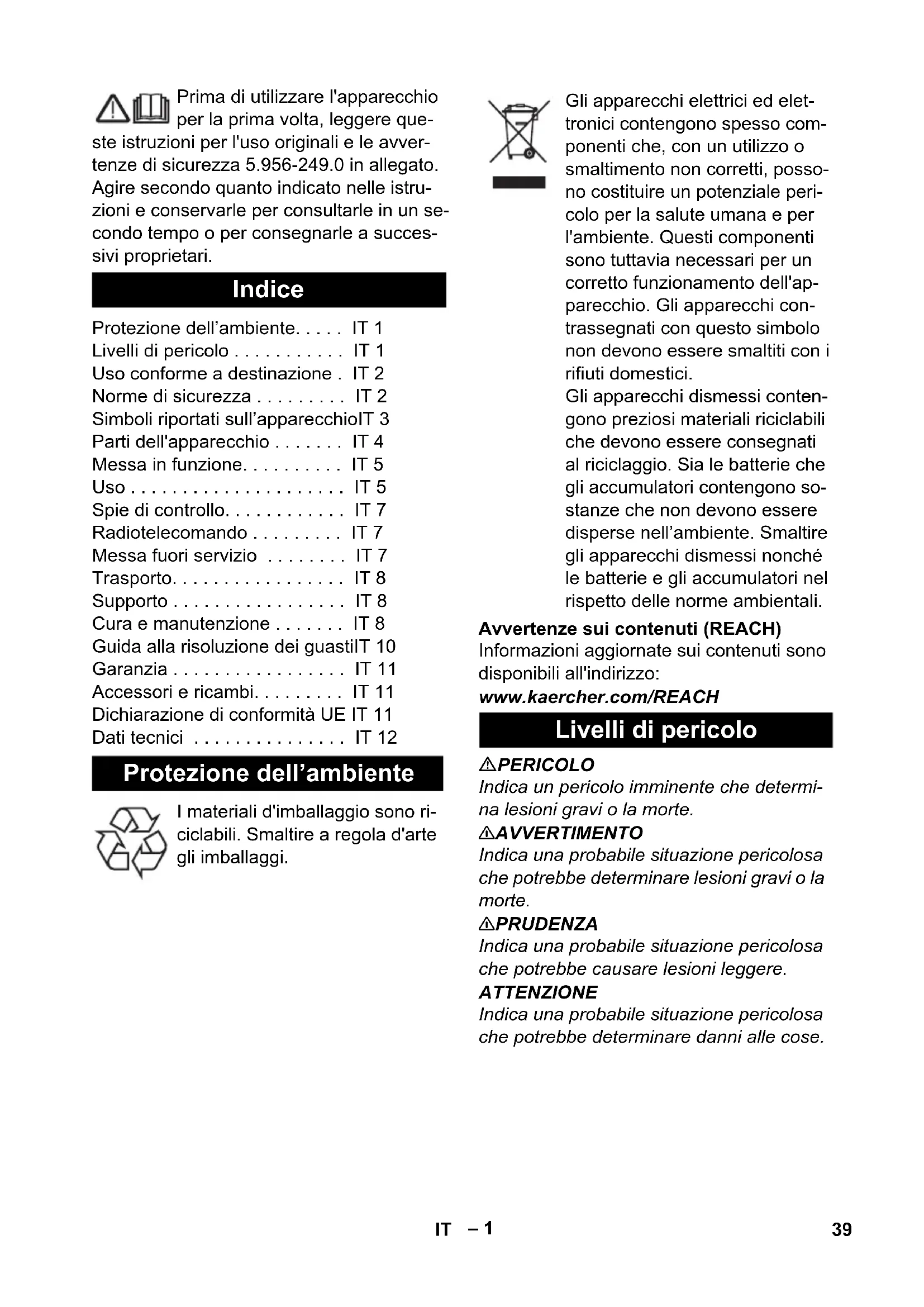 38 FR– 1 Prima di utilizzare l'apparecchio per la prima volta, leggere que- ste istruzioni per l'uso originali e le avver- tenze di sicurezza 5.956-249.0 in allegato. Agire secondo quanto indicato nelle istru- zioni e conservarle per consultarle in un se- condo tempo o per consegnarle a succes- sivi proprietari. Avvertenze sui contenuti (REACH) Informazioni aggiornate sui contenuti sono disponibili all'indirizzo: www.kaercher.com/REACH PERICOLO Indica un pericolo imminente che determi- na lesioni gravi o la morte. 몇 AVVERTIMENTO Indica una probabile situazione pericolosa che potrebbe determinare lesioni gravi o la morte. 몇 PRUDENZA Indica una probabile situazione pericolosa che potrebbe causare lesioni leggere. ATTENZIONE Indica una probabile situazione pericolosa che potrebbe determinare danni alle cose. Indice Protezione dell’ambiente... IT 1 Livelli di pericolo ... IT 1 Uso conforme a destinazione . IT 2 Norme di sicurezza ... IT 2 Simboli riportati sull’apparecchioIT 3 Parti dell'apparecchio ... IT 4 Messa in funzione... IT 5 Uso ... IT 5 Spie di controllo... IT 7 Radiotelecomando ... IT 7 Messa fuori servizio ... IT 7 Trasporto... IT 8 Supporto ... IT 8 Cura e manutenzione ... IT 8 Guida alla risoluzione dei guastiIT 10 Garanzia ... IT 11 Accessori e ricambi... IT 11 Dichiarazione di conformità UE IT 11 Dati tecnici ... IT 12 Protezione dell’ambiente I materiali d'imballaggio sono ri- ciclabili. Smaltire a regola d'arte gli imballaggi. Gli apparecchi elettrici ed elet- tronici contengono spesso com- ponenti che, con un utilizzo o smaltimento non corretti, posso- no costituire un potenziale peri- colo per la salute umana e per l'ambiente. Questi componenti sono tuttavia necessari per un corretto funzionamento dell'ap- parecchio. Gli apparecchi con- trassegnati con questo simbolo non devono essere smaltiti con i rifiuti domestici. Gli apparecchi dismessi conten- gono preziosi materiali riciclabili che devono essere consegnati al riciclaggio. Sia le batterie che gli accumulatori contengono so- stanze che non devono essere disperse nell’ambiente. Smaltire gli apparecchi dismessi nonché le batterie e gli accumulatori nel rispetto delle norme ambientali. Livelli di pericolo 39IT– 2 – Questo aspiratore è indicato per la puli- zia a secco/umido di pavimenti o pareti. – Questo apparecchio è idoneo per aspi- rare polveri secche e non combustibili dalle macchine. – L'apparecchio è indicato per aspirare sostanze liquide o umide. – L’apparecchio è idoneo all’aspirazione di polveri asciutte, non infiammabili e nocive alla salute; Categoria polveri M secondo EN 60 335–2–69. Limitazione: è vietato aspirare sostanze canceroge- ne. – Questo apparecchio è idoneo per l'im- piego industriale. – La fornitura non comprende alcun ac- cessorio. Gli accessori devono essere acquistati separatamente in base all'uso previsto. – Il funzionamento perfetto dell'apparec- chio è garantito solo con un tubo flessi- bile del diametro nominale DN42, DN52 e DN 72. Il IV 100/40 M può essere utilizzato solo con accessori DN 42 e DN 52. – Qualsiasi altro utilizzo viene considera- to come non conforme alla destinazione d'uso. Prima di eseguire la prima messa in funzio- ne legegre assolutamente le avvertenze di sicurezza allegate per aspiratori solidi-liqui- di! PERICOLO – Se l’aria di scarico viene rinviata nel ri- spettivo ambiente chiuso, occorre assi- curare un sufficiente tasso di ricambio dell'aria L. Per rispettare i valori limite ri- chiesti, il flusso volumetrico ricondotto deve essere al massimo 50% del flusso volumetrico di aria fresca (volume dell'ambiente V