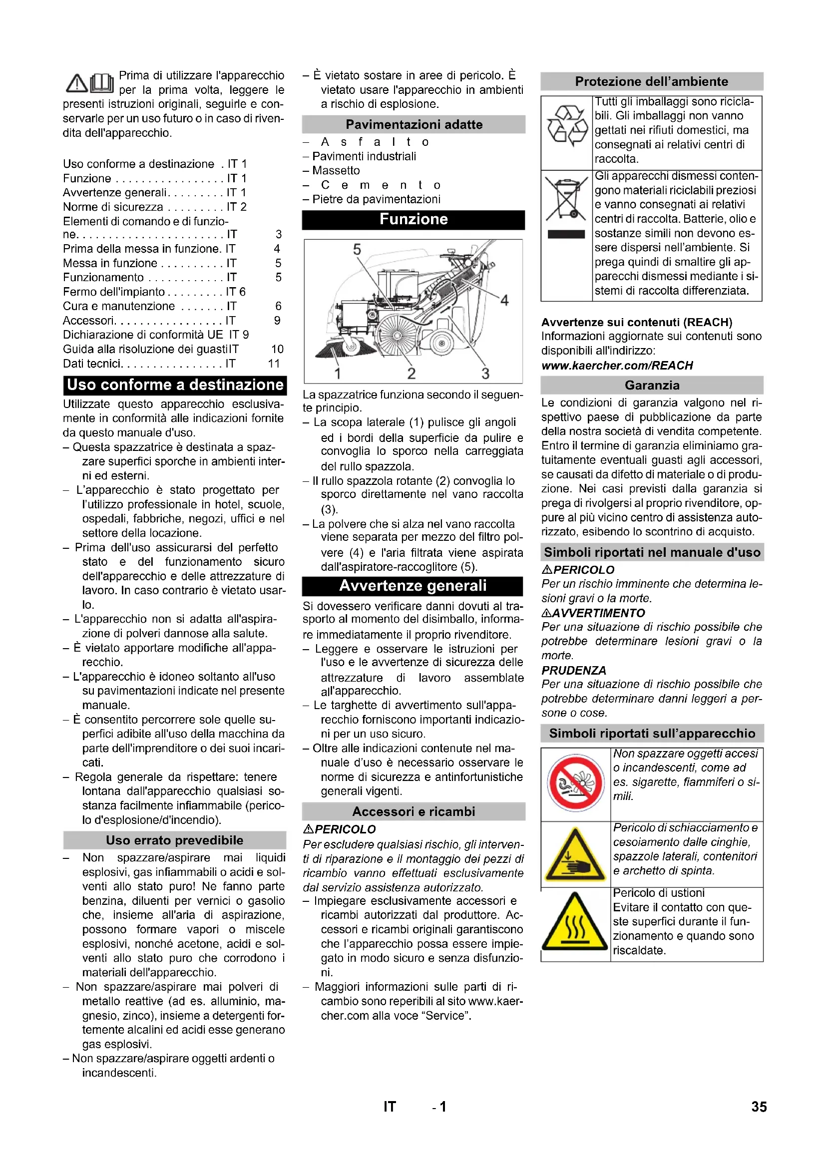 l'apparecchio. – Le targhette di avvertimento sull'appa- recchio forniscono importanti indicazio- ni per un uso sicuro. – Oltre alle indicazioni contenute nel ma- nuale d’uso è necessario osservare le norme di sicurezza e antinfortunistiche generali vigenti. PERICOLO Per escludere qualsiasi rischio, gli interven- ti di riparazione e il montaggio dei pezzi di ricambio vanno effettuati esclusivamente dal servizio assistenza autorizzato. – Impiegare esclusivamente accessori e ricambi autorizzati dal produttore. Ac- cessori e ricambi originali garantiscono che l’apparecchio possa essere impie- gato in modo sicuro e senza disfunzio- ni. – Maggiori informazioni sulle parti di ri- cambio sono reperibili al sito www.kaer- cher.com alla voce “Service”. Avvertenze sui contenuti (REACH) Informazioni aggiornate sui contenuti sono disponibili all'indirizzo: www.kaercher.com/REACH Le condizioni di garanzia valgono nel ri- spettivo paese di pubblicazione da parte della nostra società di vendita competente. Entro il termine di garanzia eliminiamo gra- tuitamente eventuali guasti agli accessori, se causati da difetto di materiale o di produ- zione. Nei casi previsti dalla garanzia si prega di rivolgersi al proprio rivenditore, op- pure al più vicino centro di assistenza auto- rizzato, esibendo lo scontrino di acquisto. PERICOLO Per un rischio imminente che determina le- sioni gravi o la morte. 몇 AVVERTIMENTO Per una situazione di rischio possibile che potrebbe determinare lesioni gravi o la morte. PRUDENZA Per una situazione di rischio possibile che potrebbe determinare danni leggeri a per- sone o cose. Uso conforme a destinazione . IT 1 Funzione . . . . . . . . . . . . . . . . . IT 1 Avvertenze generali. . . . . . . . . IT 1 Norme di sicurezza . . . . . . . . . IT 2 Elementi di comando e di funzio- ne. . . . . . . . . . . . . . . . . . . . . . . IT 3 Prima della messa in funzione. IT 4 Messa in funzione . . . . . . . . . . IT 5 Funzionamento . . . . . . . . . . . . IT 5 Fermo dell'impianto . . . . . . . . . IT 6 Cura e manutenzione . . . . . . . IT 6 Accessori. . . . . . . . . . . . . . . . . IT 9 Dichiarazione di conformità UE IT 9 Guida alla risoluzione dei guastiIT 10 Dati tecnici. . . . . . . . . . . . . . . . IT 11 Uso conforme a destinazione Uso errato prevedibile Pavimentazioni adatte Funzione Avvertenze generali Accessori e ricambi Protezione dell’ambiente Tutti gli imballaggi sono ricicla- bili. Gli imballaggi non vanno gettati nei rifiuti domestici, ma consegnati ai relativi centri di raccolta. Gli apparecchi dismessi conten- gono materiali riciclabili preziosi e vanno consegnati ai relativi centri di raccolta. Batterie, olio e sostanze simili non devono es- sere dispersi nell’ambiente. Si prega quindi di smaltire gli ap- parecchi dismessi mediante i si- stemi di raccolta differenziata. Garanzia Simboli riportati nel manuale d'uso Simboli riportati sull’apparecchio Non spazzare oggetti accesi o incandescenti, come ad es. sigarette, fiammiferi o si- mili. Pericolo di schiacciamento e cesoiamento dalle cinghie, spazzole laterali, contenitori e archetto di spinta. Pericolo di ustioni Evitare il contatto con que- ste superfici durante il fun- zionamento e quando sono riscaldate. 35IT- 2 – Prima dell'uso assicurarsi del perfetto stato e del funzionamento sicuro dell'apparecchio e delle attrezzature di lavoro. In caso contrario è vietato usar- lo. – In caso di utilizzo dell'apparecchio in ambienti a rischio (per es. stazioni di servizio) devono essere rispettate le re- lative norme di sicurezza. È vietato usa- re l'apparecchio in ambienti a rischio di esplosione. – Utilizzare sempre l’apparecchio confor- memente alla destinazione d’uso te- nendo in considerazione le condizioni locali e prestando attenzione durante il lavoro all’eventuale presenza di terzi, soprattutto bambini. – Prima di iniziare i lavori, l'operatore deve accertarsi che tutti i dispositivi di protezione siano regolarmente collocati e funzionanti. – L'operatore dell'apparecchio è respon- sabile per incidenti con altre persone o con proprietà di queste. – L'operatore deve indossare indumeti aderenti. Indossare scarpe stabili e evi- tare di indossare indumenti sciolti e al- lentati. – Prima dell'avviamento, controllare l'area adiacente (p. es. bambini). Fare attenzione che ci sia una sufficiente vi- sibilità! – Per evitare che l'apparecchio venga uti- lizzato da persone non autorizzate, to- gliere la chiave. – Quando si esce, l’apparecchio va bloc- cato contro movimenti involontari. – L'apparecchio deve essere utilizzato solo da persone istruite sul rispettivo uso o che hanno dato prova di sapere utilizzare l'apparecchio ed espressa- mente incaricate dell'uso. – Questo apparecchio non deve essere utilizzato da persone (bambini compre- si) con capacità fisiche, sensoriali o mentali ridotte o che non abbiano espe- rienza e conoscenza. – I bambini devono essere sorvegliati af- finché non giochino con l'apparecchio. Pericolo Rischio di lesioni! Rischio di ribaltamento in forte pendenza. – Non percorrere pendenze superiori al 12% in senso di marcia. Rischio di ribaltamento su terreni instabili. – Condurre l'apparecchio solo su pavi- mentazioni stabili. Rischio di ribaltamento in caso di inclina- zione laterale eccessiva. – Percorrere diagonalmente al senso di marcia pendenze non superiori al 12%. La velocità di marcia deve essere adeguata alle rispettive condizioni. – Per il trasporto osservare il peso dell'apparecchio. – Per il trasporto dell'apparecchio, scolle- gare la batteria dai morsetti e fissare l'apparecchio in modo sicuro. Avviso: Il diritto di garanzia esiste soltanto, se si u sano batterie e caricabatterie racco- mandati dalla Kärcher. – Osservare assolutamente le istruzioni d'uso del produttore della batteria e del caricabatterie. Osservare le raccoman- dazioni del legislatore riguardanti l'uti- lizzo di batterie. – Le batterie scariche devono e
