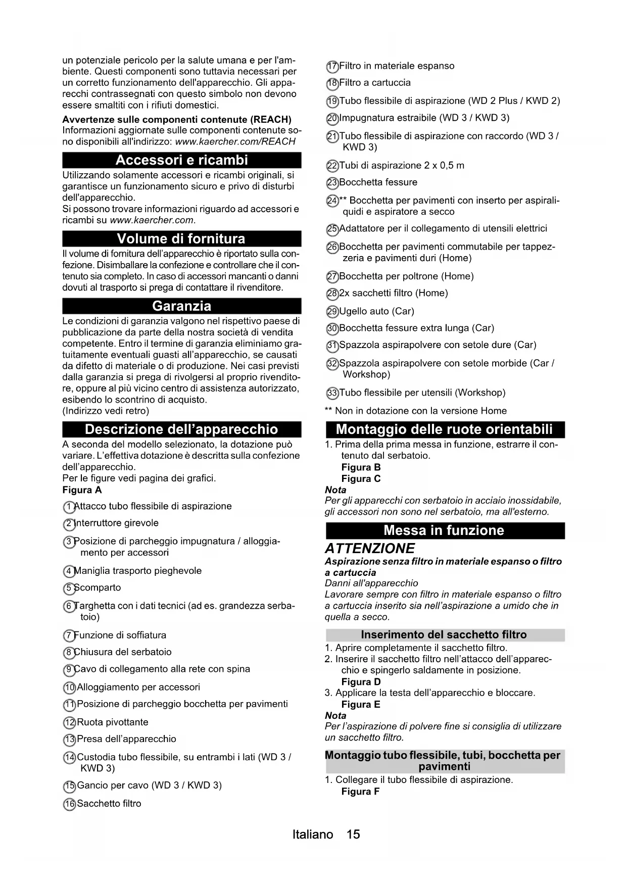 dapté. Le sac filtrant est plein. Remplacer le sac filtrant. Le filtre mousse / la cartouche filtrante est encrassée. Nettoyer le filtre mousse / la cartouche filtrante (voir chapitre Nettoyer le filtre mousse / la cartouche fil- trante). Le filtre mousse / la cartouche filtrante est endommagé. Remplacer le filtre mousse / la cartouche filtrante. Caractéristiques techniques Remarque Les caractéristiques techniques figurent sur la plaque signalétique. Avvertenze generali Prima di utilizzare l’apparecchio per la prima volta, leggere le presenti istruzioni per l’uso originali e le allegate avverten- ze di sicurezza. Agire secondo quanto indicato nelle istruzioni. conservare entrambi i libretti per un uso futuro o per un successivo proprietario. Impiego conforme alla destinazione Questo apparecchio è destinato esclusivamente all’uso domestico. L’apparecchio è destinato a essere utilizzato come aspi- raliquidi e aspiratore a secco conformemente alle de- scrizioni e alle avvertenze di sicurezza riportate nelle presenti istruzioni per l’uso. La cenere fredda può essere aspirata solo con gli ac- cessori adatti. Proteggere l’apparecchio da pioggia e conservarlo sol- tanto in ambienti chiusi. Nota Il produttore non risponde di eventuali danni causati da un utilizzo non conforme alla destinazione d’uso o da uso errato. Tutela dell’ambiente I materiali d'imballaggio sono riciclabili. Smaltire gli imballaggi nel rispetto dell’ambiente. Gli apparecchi elettrici ed elettronici contengono materiali riciclabili preziosi e spesso componenti come batterie, accumulatori oppure olio che, se usati o smaltiti scorrettamente, possono costituireItaliano 15 un potenziale pericolo per la salute umana e per l'am- biente. Questi componenti sono tuttavia necessari per un corretto funzionamento dell'apparecchio. Gli appa- recchi contrassegnati con questo simbolo non devono essere smaltiti con i rifiuti domestici. Avvertenze sulle componenti contenute (REACH) Informazioni aggiornate sulle componenti contenute so- no disponibili all'indirizzo: www.kaercher.com/REACH Accessori e ricambi Utilizzando solamente accessori e ricambi originali, si garantisce un funzionamento sicuro e privo di disturbi dell'apparecchio. Si possono trovare informazioni riguardo ad accessori e ricambi su www.kaercher.com. Volume di fornitura Il volume di fornitura dell’apparecchio è riportato sulla con- fezione. Disimballare la confezione e controllare che il con- tenuto sia completo. In caso di accessori mancanti o danni dovuti al trasporto si prega di contattare il rivenditore. Garanzia Le condizioni di garanzia valgono nel rispettivo paese di pubblicazione da parte della nostra società di vendita competente. Entro il termine di garanzia eliminiamo gra- tuitamente eventuali guasti all’apparecchio, se causati da difetto di materiale o di produzione. Nei casi previsti dalla garanzia si prega di rivolgersi al proprio rivendito- re, oppure al più vicino centro di assistenza autorizzato, esibendo lo scontrino di acquisto. (Indirizzo vedi retro) Descrizione dell’apparecchio A seconda del modello selezionato, la dotazione può variare. L’effettiva dotazione è descritta sulla confezione dell’apparecchio. Per le figure vedi pagina dei grafici. Figura A 1 Attacco tubo flessibile di aspirazione 2 Interruttore girevole 3 Posizione di parcheggio impugnatura / alloggia- mento per accessori 4 Maniglia trasporto pieghevole 5 Scomparto 6 Targhetta con i dati tecnici (ad es. grandezza serba- toio) 7 Funzione di soffiatura 8 Chiusura del serbatoio 9 Cavo di collegamento alla rete con spina 10 Alloggiamento per accessori 11 Posizione di parcheggio bocchetta per pavimenti 12 Ruota pivottante 13 Presa dell’apparecchio 14 Custodia tubo flessibile, su entrambi i lati (WD 3 / KWD 3) 15 Gancio per cavo (WD 3 / KWD 3) 16 Sacchetto filtro 17 Filtro in materiale espanso 18 Filtro a cartuccia 19 Tubo flessibile di aspirazione (WD 2 Plus / KWD 2) 20 Impugnatura estraibile (WD 3 / KWD 3) 21 Tubo flessibile di aspirazione con raccordo (WD 3 / KWD 3) 22 Tubi di aspirazione 2 x 0,5 m 23 Bocchetta fessure 24 ** Bocchetta per pavimenti con inserto per aspirali- quidi e aspiratore a secco 25 Adattatore per il collegamento di utensili elettrici 26 Bocchetta per pavimenti commutabile per tappez- zeria e pavimenti duri (Home) 27 Bocchetta per poltrone (Home) 28 2x sacchetti filtro (Home) 29 Ugello auto (Car) 30 Bocchetta fessure extra lunga (Car) 31 Spazzola aspirapolvere con setole dure (Car) 32 Spazzola aspirapolvere con setole morbide (Car / Workshop) 33 Tubo flessibile per utensili (Workshop) ** Non in dotazione con la versione Home Montaggio delle ruote orientabili