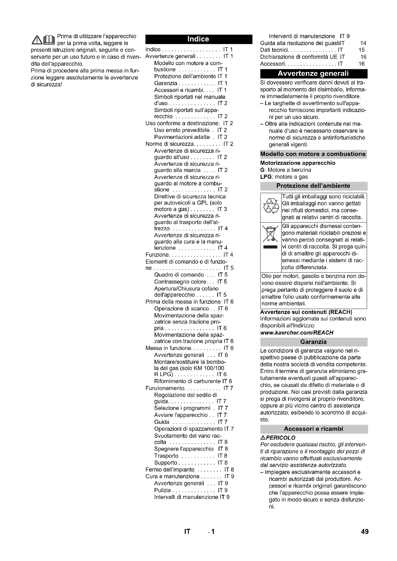 Mesuré: 95 Garanti: 98 Chairman of the Board of Management Director Regulatory Affairs & Certification Accessoires Balai latéral 6.905-986.0 Avec crins standard pour les surfaces inté- rieures et extérieures. Balais latéraux, mous 6.906-133.0 Pour la poussière fine sur les surfaces in- térieures, résistant à l'humidité. Balais latéraux, durs 6.906-065.0 Pour retirer les salissures adhérant forte- ment en extérieur, résistante à l'humidité. Brosse rotative stan- dard 6.906-375.0 Résistante à l’usure et à l'humidité Crin universel pour le nettoyage intérieur et ex- térieur. Brosse rotative, souple 6.906-533.0 Avec crin naturel spécial pour le balayage des poussières fines sur des sols lisses en intérieur. Pas résistant à l'humidité, par pour les surfaces abrasives. Brosse rotative, dure 6.906-532.0 Pour retirer les salissures adhérant forte- ment en extérieur, résistante à l'humidité. Filtre à poussières 6.414-532.0 48 FR- 1 Prima di utilizzare l'apparecchio per la prima volta, leggere le presenti istruzioni originali, seguirle e con- servarle per un uso futuro o in caso di riven- dita dell'apparecchio. Prima di procedere alla prima messa in fun- zione leggere assolutamente le avvertenze di sicurezza! Si dovessero verificare danni dovuti al tra- sporto al momento del disimballo, informa- re immediatamente il proprio rivenditore. – Le targhette di avvertimento sull'appa- recchio forniscono importanti indicazio- ni per un uso sicuro. – Oltre alle indicazioni contenute nel ma- nuale d’uso è necessario osservare le norme di sicurezza e antinfortunistiche generali vigenti. Motorizzazione apparecchio G: Motore a benzina LPG: motore a gas Avvertenze sui contenuti (REACH) Informazioni aggiornate sui contenuti sono disponibili all'indirizzo: www.kaercher.com/REACH Le condizioni di garanzia valgono nel ri- spettivo paese di pubblicazione da parte della nostra società di vendita competente. Entro il termine di garanzia eliminiamo gra- tuitamente eventuali guasti all’apparec- chio, se causati da difetto di materiale o di produzione. Nei casi previsti dalla garanzia si prega di rivolgersi al proprio rivenditore, oppure al più vicino centro di assistenza autorizzato, esibendo lo scontrino di acqui- sto. PERICOLO Per escludere qualsiasi rischio, gli interven- ti di riparazione e il montaggio dei pezzi di ricambio vanno effettuati esclusivamente dal servizio assistenza autorizzato. – Impiegare esclusivamente accessori e ricambi autorizzati dal produttore. Ac- cessori e ricambi originali garantiscono che l’apparecchio possa essere impie- gato in modo sicuro e senza disfunzio- ni. Indice Indice ... IT 1 Avvertenze generali ... IT 1 Modello con motore a com- bustione ... IT 1 Protezione dell’ambiente IT 1 Garanzia ... IT 1 Accessori e ricambi... IT 1 Simboli riportati nel manuale d'uso ... IT 2 Simboli riportati sull’appa- recchio ... IT 2 Uso conforme a destinazione. IT 2 Uso errato prevedibile... IT 2 Pavimentazioni adatte . IT 2 Norme di sicurezza... IT 2 Avvertenze di sicurezza ri- guardo all'uso ... IT 2 Avvertenze di sicurezza ri- guardo alla marcia ... IT 2 Avvertenze di sicurezza ri- guardo al motore a combu- stione ... IT 2 Direttive di sicurezza tecnica per autoveicoli a GPL (solo motore a gas) ... IT 3 Avvertenze di sicurezza ri- guardo al trasporto dell'at- trezzo ... IT 4 Avvertenze di sicurezza ri- guardo alla cura e la manu- tenzione ... IT 4 Funzione... IT 4 Elementi di comando e di funzio- ne ... IT 5 Quadro di comando ... IT 5 Contrassegno colore... IT 5 Apertura/Chiusura cofano dell'apparecchio ... IT 5 Prima della messa in funzione IT 6 Operazione di scarico ... IT 6 Movimentazione della spaz- zatrice senza trazione pro- pria ... IT 6 Movimentazione della spaz- zatrice con trazione propria IT 6 Messa in funzione... IT 6 Avvertenze generali ... IT 6 Montare/sostituire la bombo- la del gas (solo KM 100/100