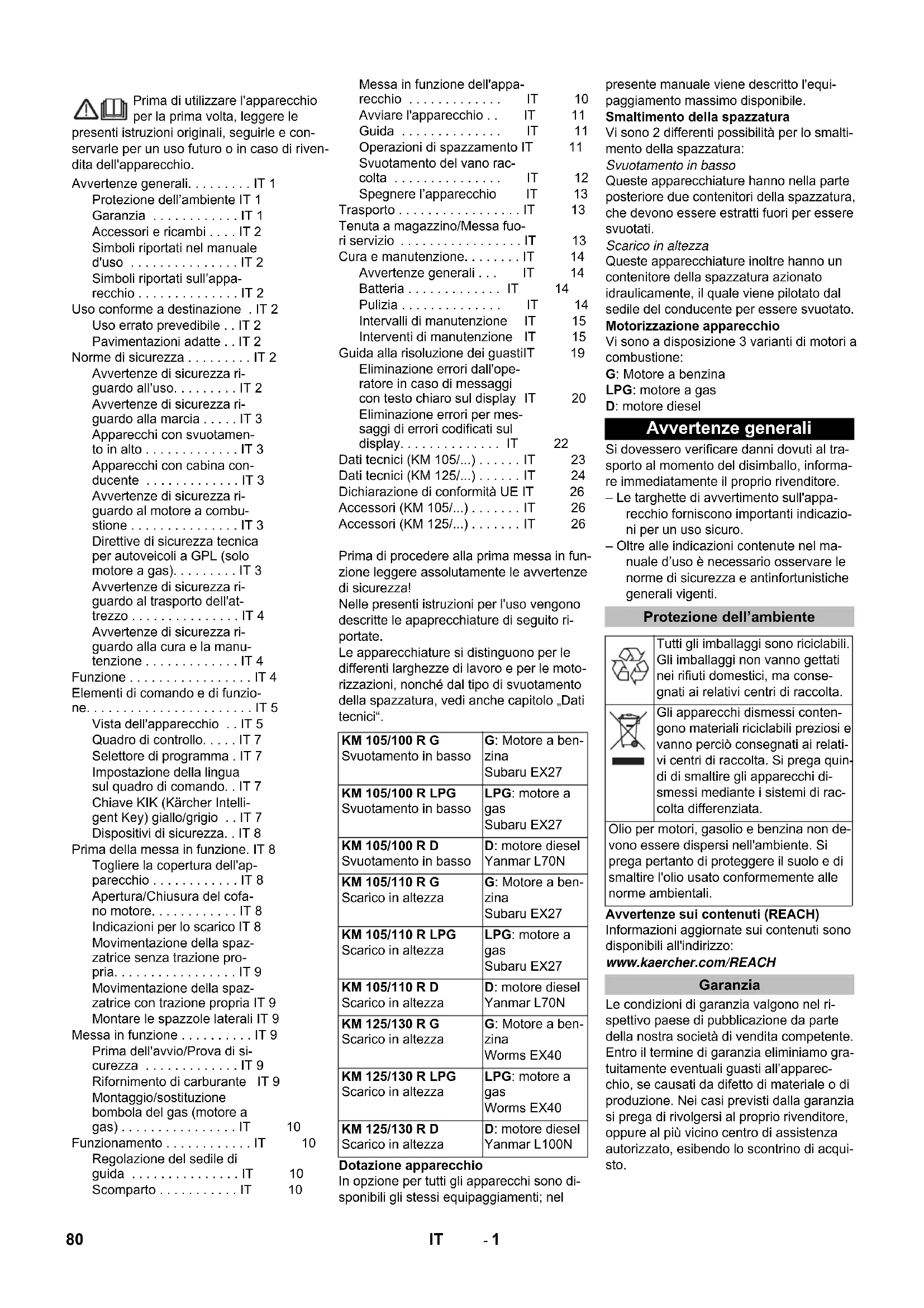Mesuré: 98 100 Garanti: 101 103 Chairman of the Board of Management Director Regulatory Affairs & Certification Accessoire (KM 105/...) Désignation N° de réf. Balai latéral, standard 6.966-063.0 Pour le nettoyage des surfaces intérieures et extérieures. Balais latéraux, durs 6.906-705.0 Pour retirer les salissures adhérant forte- ment en extérieur, résistante à l'humidité. Balais latéraux, mous 6.966-065.0 Spécialement conçu pour le balayage de poussières fines sur les sols lisses. Brosse-rouleau, standard 4.762-529.0 Résistante à l’usure et à l'humidité Crin uni- versel pour le nettoyage intérieur et exté- rieur. Brosse rotative, souple 4.762-523.0 Avec crin naturel spécial pour le balayage des poussières fines sur des sols lisses en intérieur. Pas résistant à l'humidité, par pour les surfaces abrasives. Brosse rotative, dure 4.762-524.0 Pour retirer les salissures adhérant forte- ment en extérieur, résistante à l'humidité. Filtre plat plissé (filtre à poussières) 6.907-352.0 L'appareil nécessite 2 pièces Accessoire (KM 125/...) Désignation N° de réf. Balai latéral, standard 6.966-063.0 Pour le nettoyage des surfaces intérieures et extérieures. Balais latéraux, durs 6.906-705.0 Pour retirer les salissures adhérant forte- ment en extérieur, résistante à l'humidité. Balais latéraux, mous 6.966-065.0 Spécialement conçu pour le balayage de poussières fines sur les sols lisses. Brosse-rouleau, standard 4.762-525.0 Résistante à l’usure et à l'humidité Crin uni- versel pour le nettoyage intérieur et exté- rieur. Brosse rotative, souple 4.762-526.0 Avec crin naturel spécial pour le balayage des poussières fines sur des sols lisses en intérieur. Pas résistant à l'humidité, par pour les surfaces abrasives. Brosse rotative, dure 4.762-527.0 Pour retirer les salissures adhérant forte- ment en extérieur, résistante à l'humidité. Filtre plat plissé (filtre à poussières) 6.907-352.0 L'appareil nécessite 3 pièces Désignation N° de réf. 79FR- 1 Prima di utilizzare l'apparecchio per la prima volta, leggere le presenti istruzioni originali, seguirle e con- servarle per un uso futuro o in caso di riven- dita dell'apparecchio. Prima di procedere alla prima messa in fun- zione leggere assolutamente le avvertenze di sicurezza! Nelle presenti istruzioni per l'uso vengono descritte le apaprecchiature di seguito ri- portate. Le apparecchiature si distinguono per le differenti larghezze di lavoro e per le moto- rizzazioni, nonché dal tipo di svuotamento della spazzatura, vedi anche capitolo „Dati tecnici“. Dotazione apparecchio In opzione per tutti gli apparecchi sono di- sponibili gli stessi equipaggiamenti; nel presente manuale viene descritto l'equi- paggiamento massimo disponibile. Smaltimento della spazzatura Vi sono 2 differenti possibilità per lo smalti- mento della spazzatura: Svuotamento in basso Queste apparecchiature hanno nella parte posteriore due contenitori della spazzatura, che devono essere estratti fuori per essere svuotati. Scarico in altezza Queste apparecchiature inoltre hanno un contenitore della spazzatura azionato idraulicamente, il quale viene pilotato dal sedile del conducente per essere svuotato. Motorizzazione apparecchio Vi sono a disposizione 3 varianti di motori a combustione: G: Motore a benzina LPG: motore a gas D: motore diesel Si dovessero verificare danni dovuti al tra- sporto al momento del disimballo, informa- re immediatamente il proprio rivenditore. – Le targhette di avvertimento sull'appa- recchio forniscono importanti indicazio- ni per un uso sicuro. – Oltre alle indicazioni contenute nel ma- nuale d’uso è necessario osservare le norme di sicurezza e antinfortunistiche generali vigenti. Avvertenze sui contenuti (REACH) Informazioni aggiornate sui contenuti sono disponibili all'indirizzo: www.kaercher.com/REACH Le condizioni di garanzia valgono nel ri- spettivo paese di pubblicazione da parte della nostra società di vendita competente. Entro il termine di garanzia eliminiamo gra- tuitamente eventuali guasti all’apparec- chio, se causati da difetto di materiale o di produzione. Nei casi previsti dalla garanzia si prega di rivolgersi al proprio rivenditore, oppure al più vicino centro di assistenza autorizzato, esibendo lo scontrino di acqui- sto. Avvertenze generali. . . . . . . . . IT 1 Protezione dell’ambiente IT 1 Garanzia . . . . . . . . . . . . IT 1 Accessori e ricambi . . . . IT 2 Simboli riportati nel manuale d'uso . . . . . . . . . . . . . . . IT 2 Simboli riportati sull’appa- recchio . . . . . . . . . . . . . . IT 2 Uso conforme a destinazione . IT 2 Uso errato prevedibile . . IT 2 Pavimentazioni adatte . . IT 2 Norme di sicurezza . . . . . . . . . IT 2 Avvertenze di sicurezza ri- guardo all'uso. . . . . . . . . IT 2 Avvertenze di sicurezza ri- guardo alla marcia . . . . . IT 3 Apparecchi con svuotamen- to in alto . . . . . . . . . . . . . IT 3 Apparecchi con cabina con- ducente . . . . . . . . . . . . . IT 3 Avvertenze di sicurezza ri- guardo al motore a combu- stione . . . . . . . . . . . . . . . IT 3 Direttive di sicurezza tecnica per autoveicoli a GPL (solo motore a gas). . . . . . . . . IT 3 Avvertenze di sicurezza ri- guardo al trasporto dell'at- trezzo . . . . . . . . . . . . . . . IT 4 Avvertenze di sicurezza ri- guardo alla cura e la manu- tenzione . . . . . . . . . . . . . IT 4 Funzione . . . . . . . . . . . . . . . . . IT 4 Elementi di comando e di funzio- ne. . . . . . . . . . . . . . . . . . . . . . . IT 5 Vista dell'apparecchio . . IT 5 Quadro di controllo. . . . . IT 7 Sel ettore di programma . IT 7 Impostazione della lingua sul quadro di comando. . IT 7 Chiave KIK (Kärcher Intelli- gent Key) giallo/grigio . . IT 7 Dispositivi di sicurezza. . IT 8 Prima della messa in funzione. IT 8 Togliere la copertura dell'ap- parecchio . . . . . . . . . . . . IT 8 Apertura/Chiusura del cofa- no motore. . . . . . . . . . . . IT 8 Indicazioni per lo scarico IT 