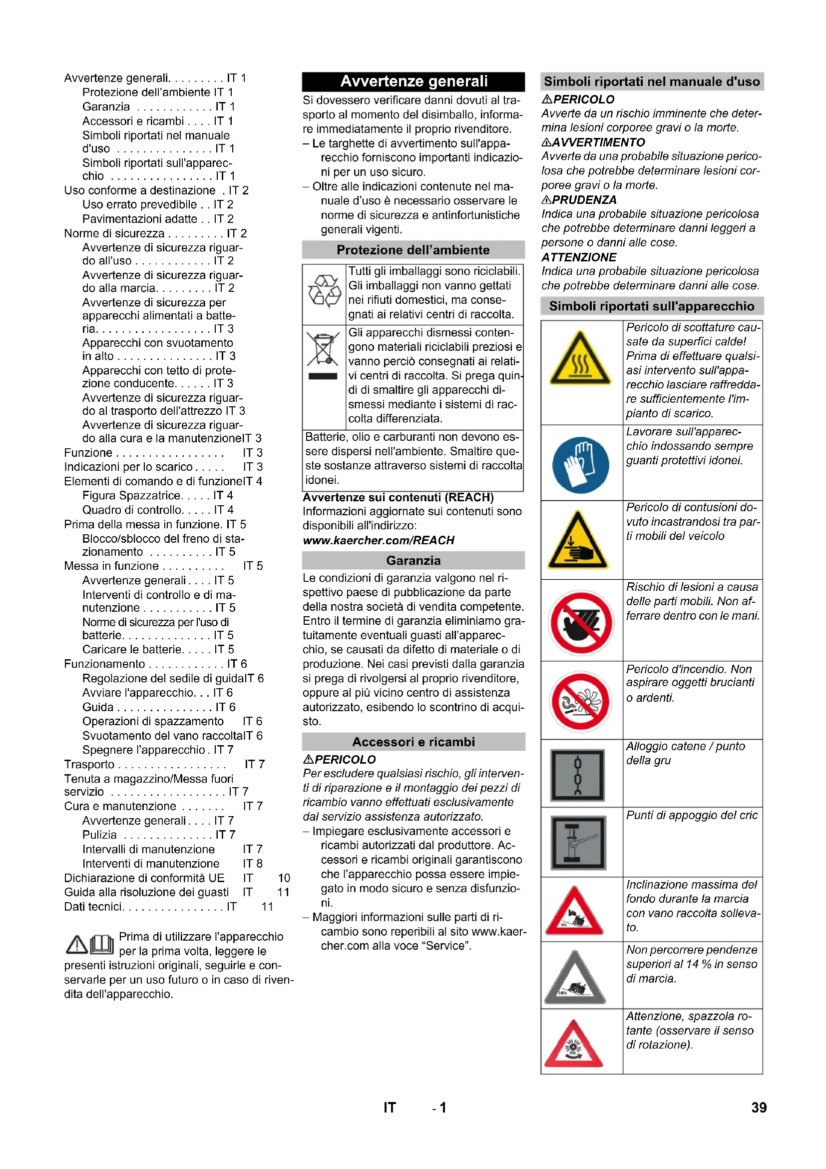 0,1 0,1 Dimensions et poids Longueur x largeur x hauteur mm 2082x1250x1450 2082x1250x1450 Rayon de braquage à droite mm 1350 1350 Rayon de braquage à gauche mm 1350 1350 Poids vide (avec/sans batterie) kg 750/1200 750/1200 Poids total admissible kg 1620 1620 Charge d'essieu avant admissible kg 797 797 Charge d'essieu arrière admissible kg 823 823 Sous réserve de modifications techniques ! 38 FR- 1 Prima di utilizzare l'apparecchio per la prima volta, leggere le presenti istruzioni originali, seguirle e con- servarle per un uso futuro o in caso di riven- dita dell'apparecchio. Si dovessero verificare danni dovuti al tra- sporto al momento del disimballo, informa- re immediatamente il proprio rivenditore. – Le targhette di avvertimento sull'appa- recchio forniscono importanti indicazio- ni per un uso sicuro. – Oltre alle indicazioni contenute nel ma- nuale d’uso è necessario osservare le norme di sicurezza e antinfortunistiche generali vigenti. Avvertenze sui contenuti (REACH) Informazioni aggiornate sui contenuti sono disponibili all'indirizzo: www.kaercher.com/REACH Le condizioni di garanzia valgono nel ri- spettivo paese di pubblicazione da parte della nostra società di vendita competente. Entro il termine di garanzia eliminiamo gra- tuitamente eventuali guasti all’apparec- chio, se causati da difetto di materiale o di produzione. Nei casi previsti dalla garanzia si prega di rivolgersi al proprio rivenditore, oppure al più vicino centro di assistenza autorizzato, esibendo lo scontrino di acqui- sto. PERICOLO Per escludere qualsiasi rischio, gli interven- ti di riparazione e il montaggio dei pezzi di ricambio vanno effettuati esclusivamente dal servizio assistenza autorizzato. – Impiegare esclusivamente accessori e ricambi autorizzati dal produttore. Ac- cessori e ricambi originali garantiscono che l’apparecchio possa essere impie- gato in modo sicuro e senza disfunzio- ni. – Maggiori informazioni sulle parti di ri- cambio sono reperibili al sito www.kaer- cher.com alla voce “Service”. PERICOLO Avverte da un rischio imminente che deter- mina lesioni corporee gravi o la morte. 몇 AVVERTIMENTO Avverte da una probabile situazione perico- losa che potrebbe determinare lesioni cor- poree gravi o la morte. 몇 PRUDENZA Indica una probabile situazione pericolosa che potrebbe determinare danni leggeri a persone o danni alle cose. ATTENZIONE Indica una probabile situazione pericolosa che potrebbe determinare danni alle cose. Avvertenze generali. . . . . . . . . IT 1 Protezione dell’ambiente IT 1 Garanzia . . . . . . . . . . . . IT 1 Accessori e ricambi . . . . IT 1 Simboli riportati nel manuale d'uso . . . . . . . . . . . . . . . IT 1 Simboli riportati sull'apparec- chio . . . . . . . . . . . . . . . . IT 1 Uso conforme a destinazione . IT 2 Uso errato prevedibile . . IT 2 Pavimentazioni adatte . . IT 2 Norme di sicurezza . . . . . . . . . IT 2 Avvertenze di sicurezza riguar- do all'uso . . . . . . . . . . . . IT 2 Avvertenze di sicurezza riguar- do alla marcia. . . . . . . . . IT 2 Avvertenze di sicurezza per apparecchi alimentati a batte- ria. . . . . . . . . . . . . . . . . . IT 3 Apparecchi con svuotamento in alto . . . . . . . . . . . . . . . IT 3 Apparecchi con tetto di prote- zione conducente. . . . . . IT 3 Avvertenze di sicurezza riguar- do al trasporto dell'attrezzo IT 3 Avvertenze di sicurezza riguar- do alla cura e la manutenzioneIT 3 Funzione . . . . . . . . . . . . . . . . . IT 3 Indicazioni per lo scarico . . . . . IT 3 Elementi di comando e di funzioneIT 4 Figura Spazzatrice. . . . . IT 4 Quadro di controllo. . . . . IT 4 Prima della messa in funzione. IT 5 Blocco/sblocco del freno di sta- zionamento . . . . . . . . . . IT 5 Messa in funzione . . . . . . . . . . IT 5 Avvertenze generali . . . . IT 5 Interventi di controllo e di ma- nutenzione . . . . . . . . . . . IT 5 Norme di sicurezza per l'uso di batterie. . . . . . . . . . . . . . IT 5 Caricare le batterie. . . . . IT 5 Funzionamento . . . . . . . . . . . . IT 6 Regolazione del sedile di guidaIT 6 Avviare l'apparecchio. . . IT 6 Guida . . . . . . . . . . . . . . . IT 6 Operazioni di spazzamento IT 6 Svuotamento del vano raccoltaIT 6 Spegnere l’apparecchio . IT 7 Trasporto . . . . . . . . . . . . . . . . . IT 7 Tenuta a magazzino/Messa fuori servizio . . . . . . . . . . . . . . . . . . IT 7 Cura e manutenzione . . . . . . . IT 7 Avvertenze generali . . . . IT 7 Pulizia . . . . . . . . . . . . . . IT 7 Intervalli di manutenzione IT 7 Interventi di manutenzione IT 8 Dichiarazione di conformità UE IT 10 Guida alla risoluzione dei guasti IT 11 Dati tecnici. . . . . . . . . . . . . . . . IT 11 Avvertenze generali Protezione dell’ambiente Tutti gli imballaggi sono riciclabili. Gli imballaggi non vanno gettati nei rifiuti domestici, ma conse- gnati ai relativi centri di raccolta. Gli apparecchi dismessi conten- gono materiali riciclabili preziosi e vanno perciò consegnati ai relati- vi centri di raccolta. Si prega quin- di di smaltire gli apparecchi di- smessi mediante i sistemi di rac- colta differenziata. Batterie, olio e carburanti non devono es- sere dispersi nell'ambiente. Smaltire que- ste sostanze attraverso sistemi di raccolta idonei. Garanzia Accessori e ricambi Simboli riportati nel manuale d'uso Simboli riportati sull'apparecchio Pericolo di scottature cau- sate da superfici calde! Prima di effettuare qualsi- asi intervento sull'appa- recchio lasciare raffredda- re sufficientemente l'im- pianto di scarico. Lavorare sull'apparec- chio indossando sempre guanti protettivi idonei. Pericolo di contusioni do- vuto incastrandosi tra par- ti mobili del veicolo Rischio di lesioni a causa delle parti mobili. Non af- ferrare dentro con le mani. Pericolo d'incendio. Non aspirare oggetti brucianti o ardenti. Alloggio catene / punto della gru Punti di appoggio del cric Inclinazione massima del fondo durante la marcia con vano raccolta solleva- to. Non percorrere pendenze superiori al 14 % in senso di ma