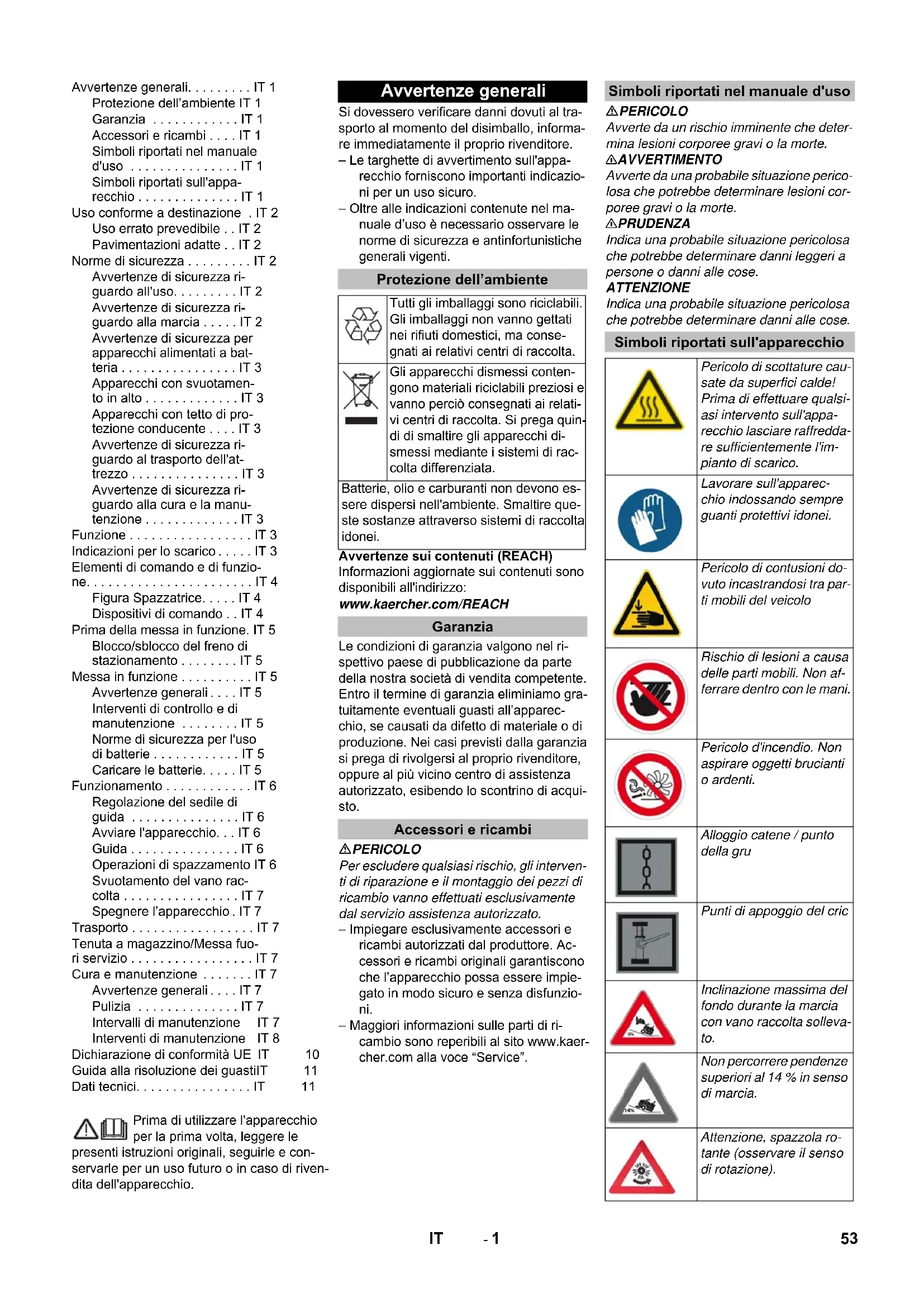 0,1 0,1 Dimensions et poids Longueur x largeur x hauteur mm 1847 x 1065 x 1388 1847 x 1065 x 1388 Rayon de braquage à droite mm 2470 2470 Rayon de braquage à gauche mm 2470 2470 Poids vide (avec/sans batterie) kg 560/860 560/860 Poids total admissible kg 1224 1224 Charge d'essieu avant admissible kg 734 734 Charge d'essieu arrière admissible kg 490 490 Sous réserve de modifications techniques ! 52 FR- 1 Prima di utilizzare l'apparecchio per la prima volta, leggere le presenti istruzioni originali, seguirle e con- servarle per un uso futuro o in caso di riven- dita dell'apparecchio. Si dovessero verificare danni dovuti al tra- sporto al momento del disimballo, informa- re immediatamente il proprio rivenditore. – Le targhette di avvertimento sull'appa- recchio forniscono importanti indicazio- ni per un uso sicuro. – Oltre alle indicazioni contenute nel ma- nuale d’uso è necessario osservare le norme di sicurezza e antinfortunistiche generali vigenti. Avvertenze sui contenuti (REACH) Informazioni aggiornate sui contenuti sono disponibili all'indirizzo: www.kaercher.com/REACH Le condizioni di garanzia valgono nel ri- spettivo paese di pubblicazione da parte della nostra società di vendita competente. Entro il termine di garanzia eliminiamo gra- tuitamente eventuali guasti all’apparec- chio, se causati da difetto di materiale o di produzione. Nei casi previsti dalla garanzia si prega di rivolgersi al proprio rivenditore, oppure al più vicino centro di assistenza autorizzato, esibendo lo scontrino di acqui- sto. PERICOLO Per escludere qualsiasi rischio, gli interven- ti di riparazione e il montaggio dei pezzi di ricambio vanno effettuati esclusivamente dal servizio assistenza autorizzato. – Impiegare esclusivamente accessori e ricambi autorizzati dal produttore. Ac- cessori e ricambi originali garantiscono che l’apparecchio possa essere impie- gato in modo sicuro e senza disfunzio- ni. – Maggiori informazioni sulle parti di ri- cambio sono reperibili al sito www.kaer- cher.com alla voce “Service”. PERICOLO Avverte da un rischio imminente che deter- mina lesioni corporee gravi o la morte. 몇 AVVERTIMENTO Avverte da una probabile situazione perico- losa che potrebbe determinare lesioni cor- poree gravi o la morte. 몇 PRUDENZA Indica una probabile situazione pericolosa che potrebbe determinare danni leggeri a persone o danni alle cose. ATTENZIONE Indica una probabile situazione pericolosa che potrebbe determinare danni alle cose. Avvertenze generali. . . . . . . . . IT 1 Protezione dell’ambiente IT 1 Garanzia . . . . . . . . . . . . IT 1 Accessori e ricambi . . . . IT 1 Simboli riportati nel manuale d'uso . . . . . . . . . . . . . . . IT 1 Simboli riportati sull'appa- recchio . . . . . . . . . . . . . . IT 1 Uso conforme a destinazione . IT 2 Uso errato prevedibile . . IT 2 Pavimentazioni adatte . . IT 2 Norme di sicurezza . . . . . . . . . IT 2 Avvertenze di sicurezza ri- guardo all'uso. . . . . . . . . IT 2 Avvertenze di sicurezza ri- guardo alla marcia . . . . . IT 2 Avvertenze di sicurezza per apparecchi alimentati a bat- teria . . . . . . . . . . . . . . . . IT 3 Apparecchi con svuotamen- to in alto . . . . . . . . . . . . . IT 3 Apparecchi con tetto di pro- tezione conducente . . . . IT 3 Avvertenze di sicurezza ri- guardo al trasporto dell'at- trezzo . . . . . . . . . . . . . . . IT 3 Avvertenze di sicurezza ri- guardo alla cura e la manu- tenzione . . . . . . . . . . . . . IT 3 Funzione . . . . . . . . . . . . . . . . . IT 3 Indicazioni per lo scarico . . . . . IT 3 Elementi di comando e di funzio- ne. . . . . . . . . . . . . . . . . . . . . . . IT 4 Figura Spazzatrice. . . . . IT 4 Dispositivi di comando . . IT 4 Prima della messa in funzione. IT 5 Blocco/sblocco del freno di stazionamento . . . . . . . . IT 5 Messa in funzione . . . . . . . . . . IT 5 Avvertenze generali . . . . IT 5 Interventi di controllo e di manutenzione . . . . . . . . IT 5 Norme di sicurezza per l'uso di batterie . . . . . . . . . . . . IT 5 Car icare le batterie. . . . . IT 5 Funzionamento . . . . . . . . . . . . IT 6 Regolazione del sedile di guida . . . . . . . . . . . . . . . IT 6 Avviare l'apparecchio. . . IT 6 Guida . . . . . . . . . . . . . . . IT 6 Operazioni di spazzamento IT 6 Svuotamento del vano rac- colta . . . . . . . . . . . . . . . . IT 7 Spegnere l’apparecchio . IT 7 Trasporto . . . . . . . . . . . . . . . . . IT 7 Tenuta a magazzino/Messa fuo- ri servizio . . . . . . . . . . . . . . . . . IT 7 Cura e manutenzione . . . . . . . IT 7 Avvertenze generali . . . . IT 7 Pulizia . . . . . . . . . . . . . . IT 7 Intervalli di manutenzione IT 7 Interventi di manutenzione IT 8 Dichiarazione di conformità UE IT 10 Guida alla risoluzione dei guastiIT 11 Dati tecnici. . . . . . . . . . . . . . . . IT 11 Avvertenze generali Protezione dell’ambiente Tutti gli imballaggi sono riciclabili. Gli imballaggi non vanno gettati nei rifiuti domestici, ma conse- gnati ai relativi centri di raccolta. Gli apparecchi dismessi conten- gono materiali riciclabili preziosi e vanno perciò consegnati ai relati- vi centri di raccolta. Si prega quin- di di smaltire gli apparecchi di- smessi mediante i sistemi di rac- colta differenziata. Batterie, olio e carburanti non devono es- sere dispersi nell'ambiente. Smaltire que- ste sostanze attraverso sistemi di raccolta idonei. Garanzia Accessori e ricambi Simboli riportati nel manuale d'uso Simboli riportati sull'apparecchio Pericolo di scottature cau- sate da superfici calde! Prima di effettuare qualsi- asi intervento sull'appa- recchio lasciare raffredda- re sufficientemente l'im- pianto di scarico. Lavorare sull'apparec- chio indossando sempre guanti protettivi idonei. Pericolo di contusioni do- vuto incastrandosi tra par- ti mobili del veicolo Rischio di lesioni a causa delle parti mobili. Non af- ferrare dentro con le mani. Pericolo d'incendio. Non aspirare oggetti brucianti o ardenti. Alloggio catene / punto della gru Punti di appoggio del cric 
