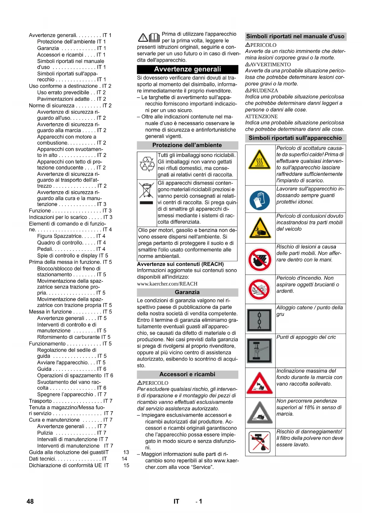 Procédures d'évaluation de la confor- mité 2000/14/CE: Annexe V Niveau de puissance acoustique dB(A) Mesuré: 96 Garanti: 98 Chairman of the Board of Management Director Regulatory Affairs & Certification 47FR- 1 Prima di utilizzare l'apparecchio per la prima volta, leggere le presenti istruzioni originali, seguirle e con- servarle per un uso futuro o in caso di riven- dita dell'apparecchio. Si dovessero verificare danni dovuti al tra- sporto al momento del disimballo, informa- re immediatamente il proprio rivenditore. – Le targhette di avvertimento sull'appa- recchio forniscono importanti indicazio- ni per un uso sicuro. – Oltre alle indicazioni contenute nel ma- nuale d’uso è necessario osservare le norme di sicurezza e antinfortunistiche generali vigenti. Avvertenze sui contenuti (REACH) Informazioni aggiornate sui contenuti sono disponibili all'indirizzo: www.kaercher.com/REACH Le condizioni di garanzia valgono nel ri- spettivo paese di pubblicazione da parte della nostra società di vendita competente. Entro il termine di garanzia eliminiamo gra- tuitamente eventuali guasti all’apparec- chio, se causati da difetto di materiale o di produzione. Nei casi previsti dalla garanzia si prega di rivolgersi al proprio rivenditore, oppure al più vicino centro di assistenza autorizzato, esibendo lo scontrino di acqui- sto. PERICOLO Per escludere qualsiasi rischio, gli interven- ti di riparazione e il montaggio dei pezzi di ricambio vanno effettuati esclusivamente dal servizio assistenza autorizzato. – Impiegare esclusivamente accessori e ricambi autorizzati dal produttore. Ac- cessori e ricambi originali garantiscono che l’apparecchio possa essere impie- gato in modo sicuro e senza disfunzio- ni. – Maggiori informazioni sulle parti di ri- cambio sono reperibili al sito www.kaer- cher.com alla voce “Service”. PERICOLO Avverte da un rischio imminente che deter- mina lesioni corporee gravi o la morte. 몇 AVVERTIMENTO Avverte da una probabile situazione perico- losa che potrebbe determinare lesioni cor- poree gravi o la morte. 몇 PRUDENZA Indica una probabile situazione pericolosa che potrebbe determinare danni leggeri a persone o danni alle cose. ATTENZIONE Indica una probabile situazione pericolosa che potrebbe determinare danni alle cose. Avvertenze generali. . . . . . . . . IT 1 Protezione dell’ambiente IT 1 Garanzia . . . . . . . . . . . . IT 1 Accessori e ricambi . . . . IT 1 Simboli riportati nel manuale d'uso . . . . . . . . . . . . . . . IT 1 Simboli riportati sull'appa- recchio . . . . . . . . . . . . . . IT 1 Uso conforme a destinazione . IT 2 Uso errato prevedibile . . IT 2 Pavimentazioni adatte . . IT 2 Norme di sicurezza . . . . . . . . . IT 2 Avvertenze di sicurezza ri- guardo all'uso. . . . . . . . . IT 2 Avvertenze di sicurezza ri- guardo alla marcia . . . . . IT 2 Apparecchi con motore a combustione. . . . . . . . . . IT 2 Apparecchi con svuotamen- to in alto . . . . . . . . . . . . . IT 2 Apparecchi con tetto di pro- tezione conducente . . . . IT 2 Avvertenze di sicurezza ri- guardo al trasporto dell'at- trezzo . . . . . . . . . . . . . . . IT 2 Avvertenze di sicurezza ri- guardo alla cura e la manu- tenzione . . . . . . . . . . . . . IT 3 Funzione . . . . . . . . . . . . . . . . . IT 3 Indicazioni per lo scarico . . . . . IT 3 Elementi di comando e di funzio- ne. . . . . . . . . . . . . . . . . . . . . . . IT 4 Figura Spazzatrice. . . . . IT 4 Quadro di controllo. . . . . IT 4 Pedali. . . . . . . . . . . . . . . IT 4 Spie di controllo e display IT 5 Prima della messa in funzione. IT 5 Blocco/sblocco del freno di stazionamento . . . . . . . . IT 5 Movimentazione della spaz- zatrice senza trazione pro- pria. . . . . . . . . . . . . . . . . IT 5 Movimentazione della spaz- zatrice con trazione propria IT 5 Messa in funzione . . . . . . . . . . IT 5 Avvertenze generali . . . . IT 5 Interventi di controllo e di manutenzione . . . . . . . . IT 5 Rifornimento di carburante IT 5 Funzionamento . . . . . . . . . . . . IT 5 Regolazione del sedile di guida . . . . . . . . . . . . . . . IT 5 Avviare l'apparecchio. . . IT 5 Guida . . . . . . . . . . . . . . . IT 6 Operazioni di spazzamento IT 6 Svuotamento del vano rac- colta . . . . . . . . . . . . . . . . IT 6 Spegnere l’apparecchio . IT 7 Trasporto . . . . . . . . . . . . . . . . . IT 7 Tenuta a magazzino/Messa fuo- ri servizio . . . . . . . . . . . . . . . . . IT 7 Cura e manutenzione . . . . . . . IT 7 Avvertenze generali . . . . IT 7 Pulizia . . . . . . . . . . . . . . IT 7 Intervalli di manutenzione IT 7 Interventi di manutenzione IT 7 Guida alla risoluzione dei guastiIT 13 Dati tecnici. . . . . . . . . . . . . . . . IT 14 Dichiarazione di conformità UE IT 15 Avvertenze generali Protezione dell’ambiente Tutti gli imballaggi sono riciclabili. Gli imballaggi non vanno gettati nei rifiuti domestici, ma conse- gnati ai relativi centri di raccolta. Gli apparecchi dismessi conten- gono materiali riciclabili preziosi e vanno perciò consegnati ai relati- vi centri di raccolta. Si prega quin- di di smaltire gli apparecchi di- smessi mediante i sistemi di rac- colta differenziata. Olio per motori, gasolio e benzina non de- vono essere dispersi nell'ambiente. Si prega pertanto di proteggere il suolo e di smaltire l'olio usato conformemente alle norme ambientali. Garanzia Accessori e ricambi Simboli riportati nel manuale d'uso Simboli riportati sull'apparecchio Pericolo di scottature causa- te da superfici calde! Prima di effettuare qualsiasi interven- to sull'apparecchio lasciare raffreddare sufficientemente l'impianto di scarico. Lavorare sull'apparecchio in- dossando sempre guanti protettivi idonei. Pericolo di contusioni dovuto incastrandosi tra parti mobili del veicolo Rischio di lesioni a causa delle parti mobili. Non affer- rare dentro con le mani. Pericolo d'incendio. Non aspirare oggetti brucianti o ardenti. Alloggio catene / punto della gru Punti di appoggio del cric Inclinazione massima del fondo durante