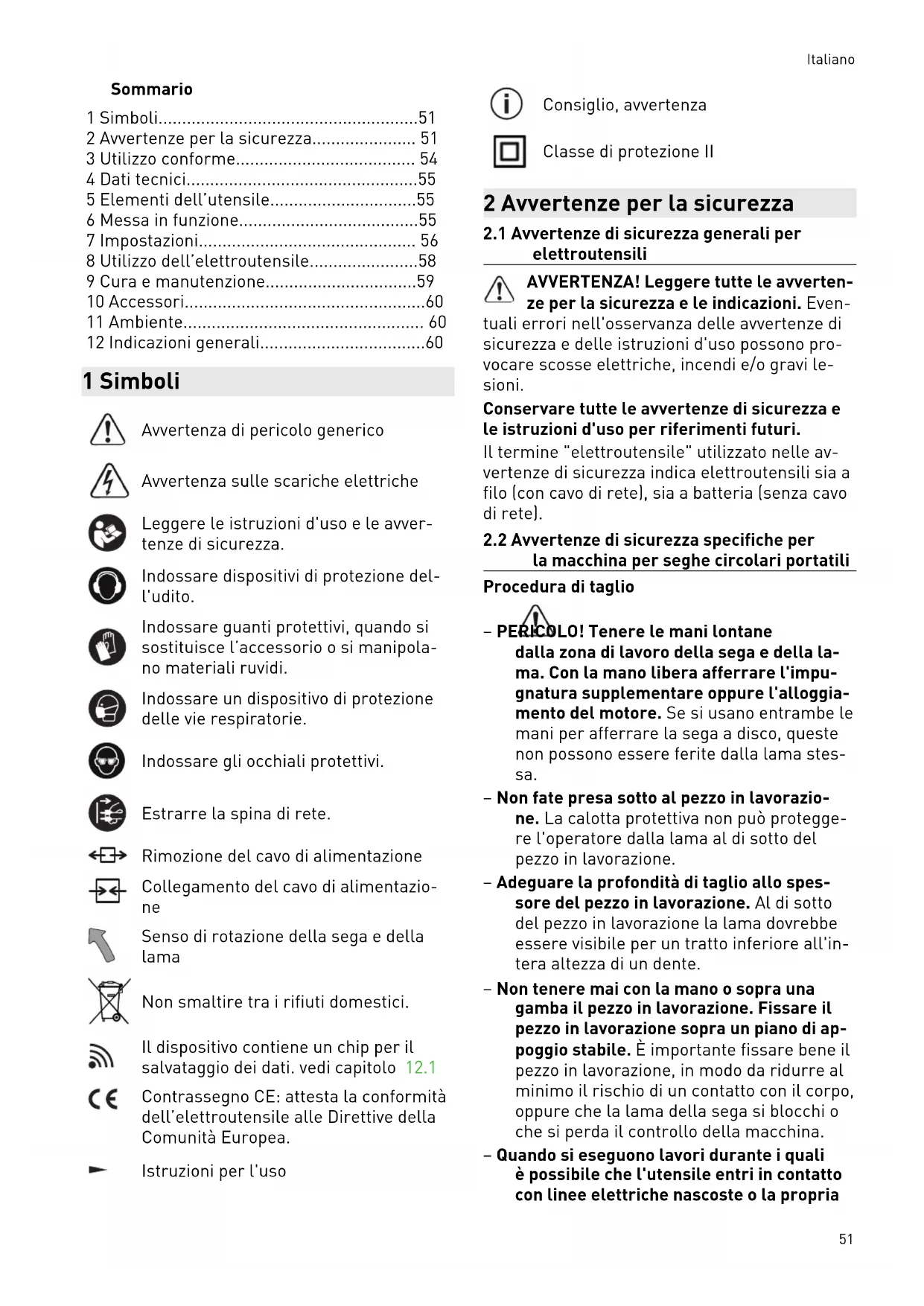 Senso di rotazione della sega e della lama Non smaltire tra i rifiuti domestici. Il dispositivo contiene un chip per il salvataggio dei dati. vedi capitolo 12.1 Contrassegno CE: attesta la conformità dell’elettroutensile alle Direttive della Comunità Europea. Istruzioni per l'uso Consiglio, avvertenza Classe di protezione II 2 Avvertenze per la sicurezza