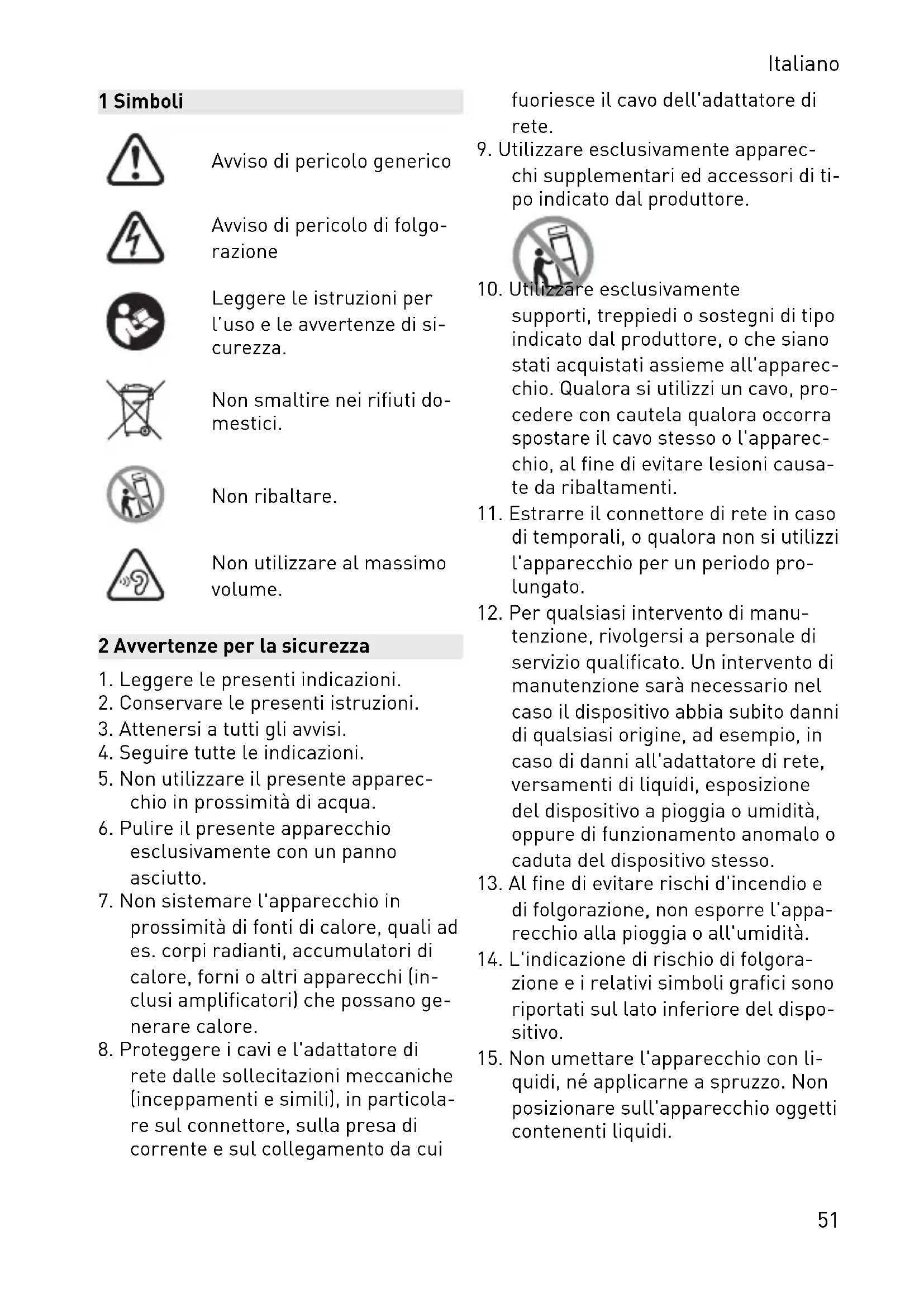 tenzione, rivolgersi a personale di servizio qualificato. Un intervento di manutenzione sarà necessario nel caso il dispositivo abbia subito danni di qualsiasi origine, ad esempio, in caso di danni all'adattatore di rete, versamenti di liquidi, esposizione del dispositivo a pioggia o umidità, oppure di funzionamento anomalo o caduta del dispositivo stesso.