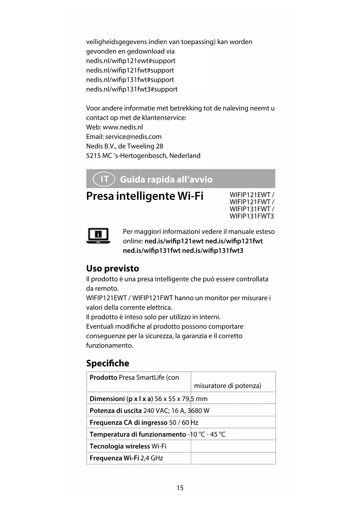 Guida rapida all’avvio Presa intelligente Wi-Fi WIFIP121EWT / WIFIP121FWT / WIFIP131FWT / WIFIP131FWT3 Per maggiori informazioni vedere il manuale esteso online: ned.is/wip121ewt ned.is/wip121fwt ned.is/wip131fwt ned.is/wip131fwt3 Uso previsto Il prodotto è una presa intelligente che può essere controllata da remoto. WIFIP121EWT / WIFIP121FWT hanno un monitor per misurare i valori della corrente elettrica. Il prodotto è inteso solo per utilizzo in interni. Eventuali modiche al prodotto possono comportare conseguenze per la sicurezza, la garanzia e il corretto funzionamento. Speciche Prodotto Presa SmartLife (con misuratore di potenza) Dimensioni (p x l x a) 56 x 55 x 79,5 mm Potenza di uscita 240 VAC; 16 A, 3680 W Frequenza CA di ingresso 50 / 60 Hz Temperatura di funzionamento -10 °C - 45 °C Tecnologia wireless Wi-Fi Frequenza Wi-Fi 2,4 GHz16 Intervallo di frequenza 2400 - 2483.5 MHz Potenza di trasmissione radio max 16 dBm Parti principali (immagine A) 1 Pulsante di accensione/ spegnimento 2 Spia LED Istruzioni di sicurezza