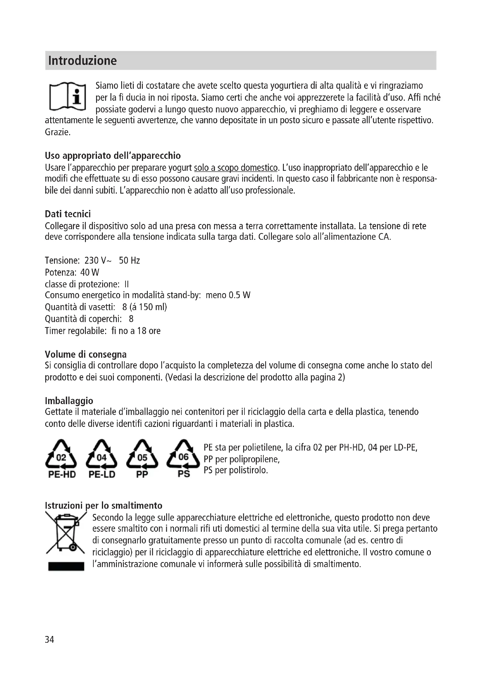 - Mettere lo yogurt pronto per almeno 4 ore in frigorifero per terminare così il processo di maturazione. Dopo di che, se desiderato, si potranno aggiungere altri ingredienti, usarlo come ingrediente per diverse ricette o semplicemente degustarlo al naturale. AVVISO: L’azionamento di qualsiasi tasto è accompagnato da segnale acustico. AVVISO: Lavare bene i vasetti di vetro e sciacquarli con acqua calda prima dell’uso.39 Pulizia e manutenzione ATTENZIONE: Disinserire la spina dalla presa di corrente prima della pulizia! Fare raffreddate l’apparecchio prima della pulizia! Non immergere l’apparecchio né la sua spina nell’acqua o lavarli sotto il rubinetto aperto! Pulire l’apparecchio con un panno inumidito e asciugarlo accuratamente.
