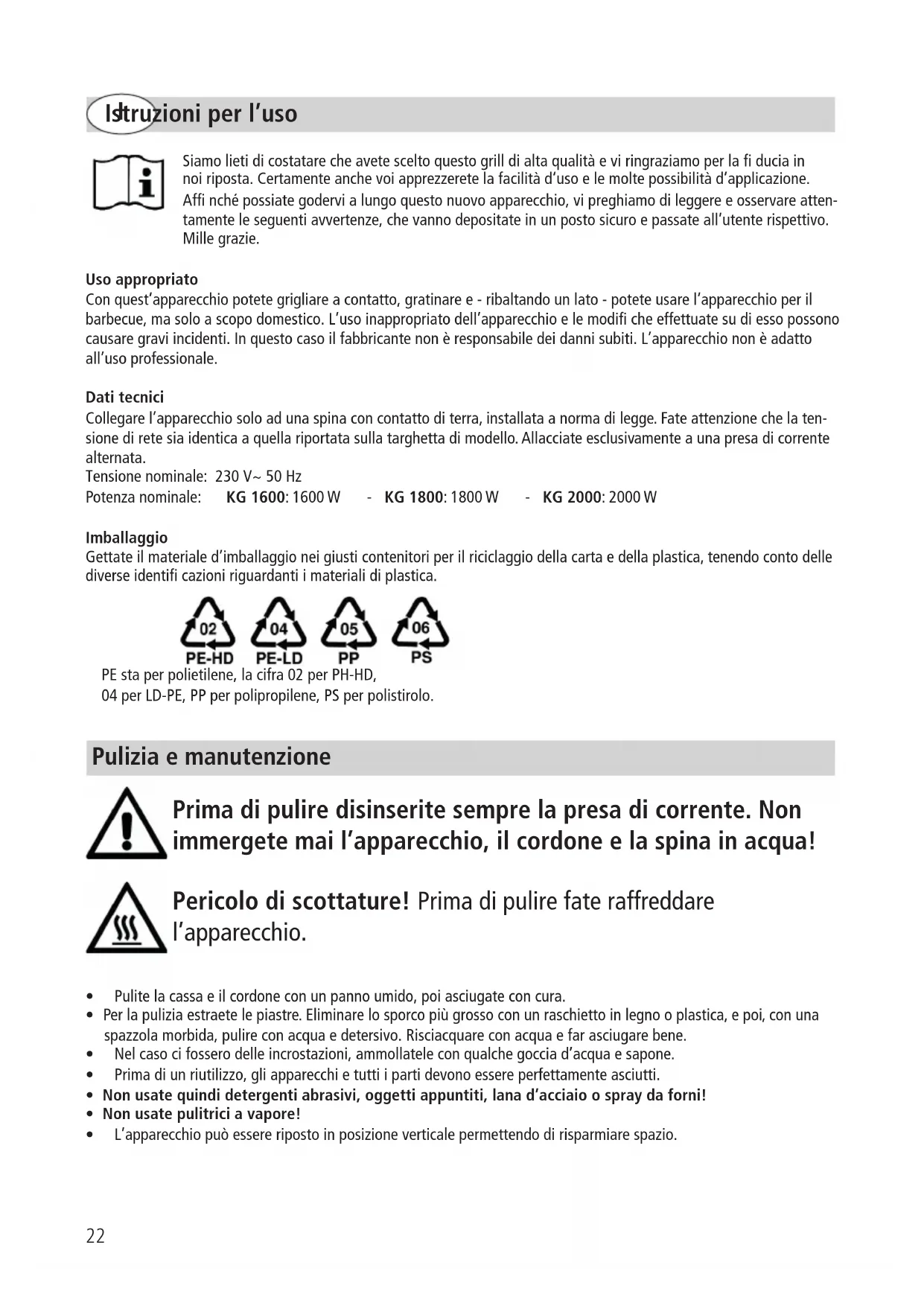 Temps (min.) 5 – 7 8 – 10 10 – 15 4 – 10 3 – 8 4 – 6 Note :Enpositionouverte,lachaleurs’enfuitplusvite.C’estpourquoilesalimentsexigentplusdetempspourcuire commeenpositionfermée. bugers T E N I R C H A U D22 Istruzioni per l’uso Siamolietidicostatarecheavetesceltoquestogrilldialtaqualitàeviringraziamoperladuciain noi riposta. Certamente anche voi apprezzerete la facilità d‘uso e le molte possibilità d’applicazione. Afnchépossiategodervialungoquestonuovoapparecchio,vipreghiamodileggereeosservareatten- tamente le seguenti avvertenze, che vanno depositate in un posto sicuro e passate all’utente rispettivo. Mille grazie. Uso appropriato Conquest’apparecchiopotetegrigliareacontatto,gratinaree-ribaltandounlato-poteteusarel‘apparecchioperil barbecue, ma solo a scopo domestico. L’uso inappropriato dell’apparecchio e le modifi che effettuate su di esso possono causaregraviincidenti.Inquestocasoilfabbricantenonèresponsabiledeidannisubiti.L’apparecchiononèadatto all’uso professionale. Dati tecnici Collegare l’apparecchio solo ad una spina con contatto di terra, installata a norma di legge. Fate attenzione che la ten- sionediretesiaidenticaaquellariportatasullatarghettadimodello.Allacciateesclusivamenteaunapresadicorrente alternata. Tensione nominale: 230 V~ 50 Hz Potenza nominale: KG 1600: 1600 W - KG 1800: 1800 W - KG 2000: 2000 W Imballaggio Gettate il materiale d’imballaggio nei giusti contenitori per il riciclaggio della carta e della plastica, tenendo conto delle diverse identifi cazioni riguardanti i materiali di plastica. PE sta per polietilene, la cifra 02 per PH-HD, 04 per LD-PE, PP per polipropilene, PS per polistirolo.
