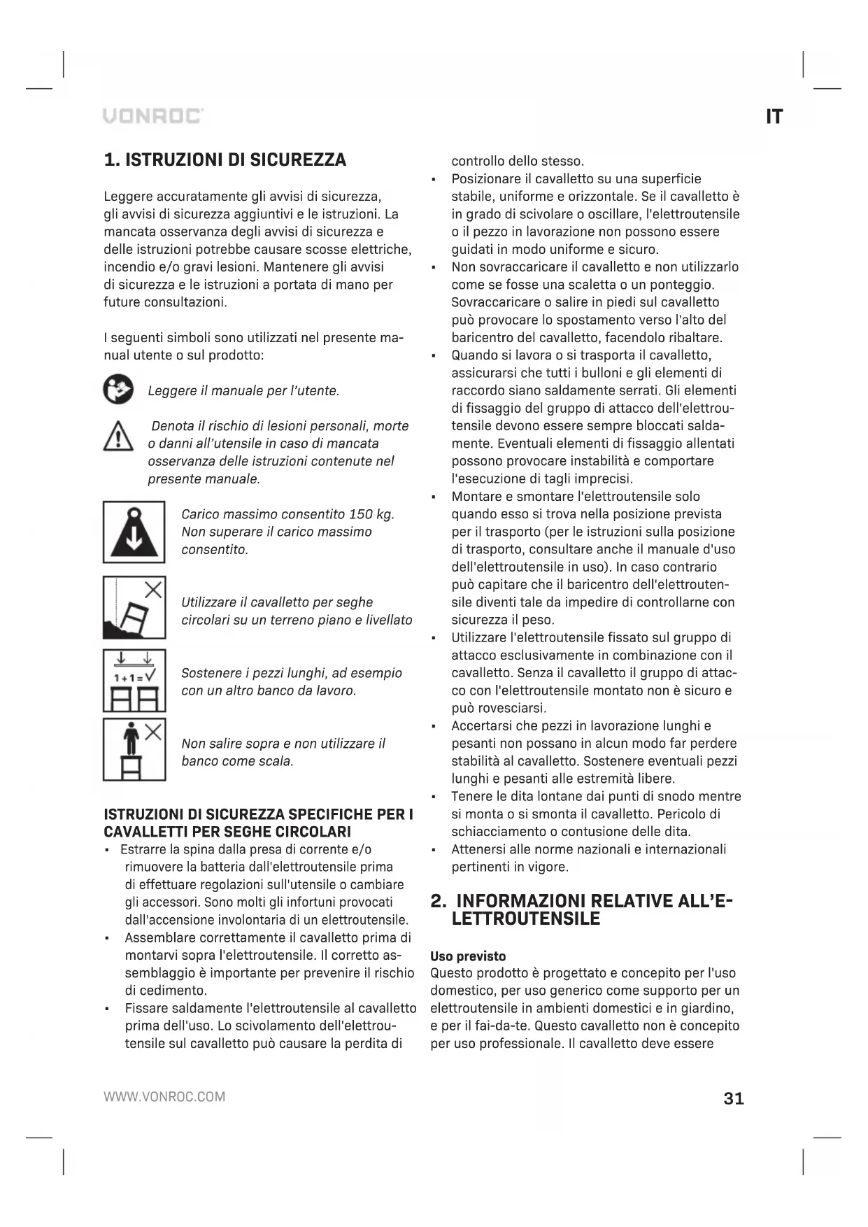 Leggere accuratamente gli avvisi di sicurezza, gli avvisi di sicurezza aggiuntivi e le istruzioni. La mancata osservanza degli avvisi di sicurezza e delle istruzioni potrebbe causare scosse elettriche, incendio e/o gravi lesioni. Mantenere gli avvisi di sicurezza e le istruzioni a portata di mano per future consultazioni. I seguenti simboli sono utilizzati nel presente ma- nual utente o sul prodotto: Leggere il manuale per l’utente. Denota il rischio di lesioni personali, morte o danni all’utensile in caso di mancata osservanza delle istruzioni contenute nel presente manuale. Carico massimo consentito 150 kg. Non superare il carico massimo consentito. Utilizzare il cavalletto per seghe circolari su un terreno piano e livellato Sostenere i pezzi lunghi, ad esempio con un altro banco da lavoro. Non salire sopra e non utilizzare il banco come scala.