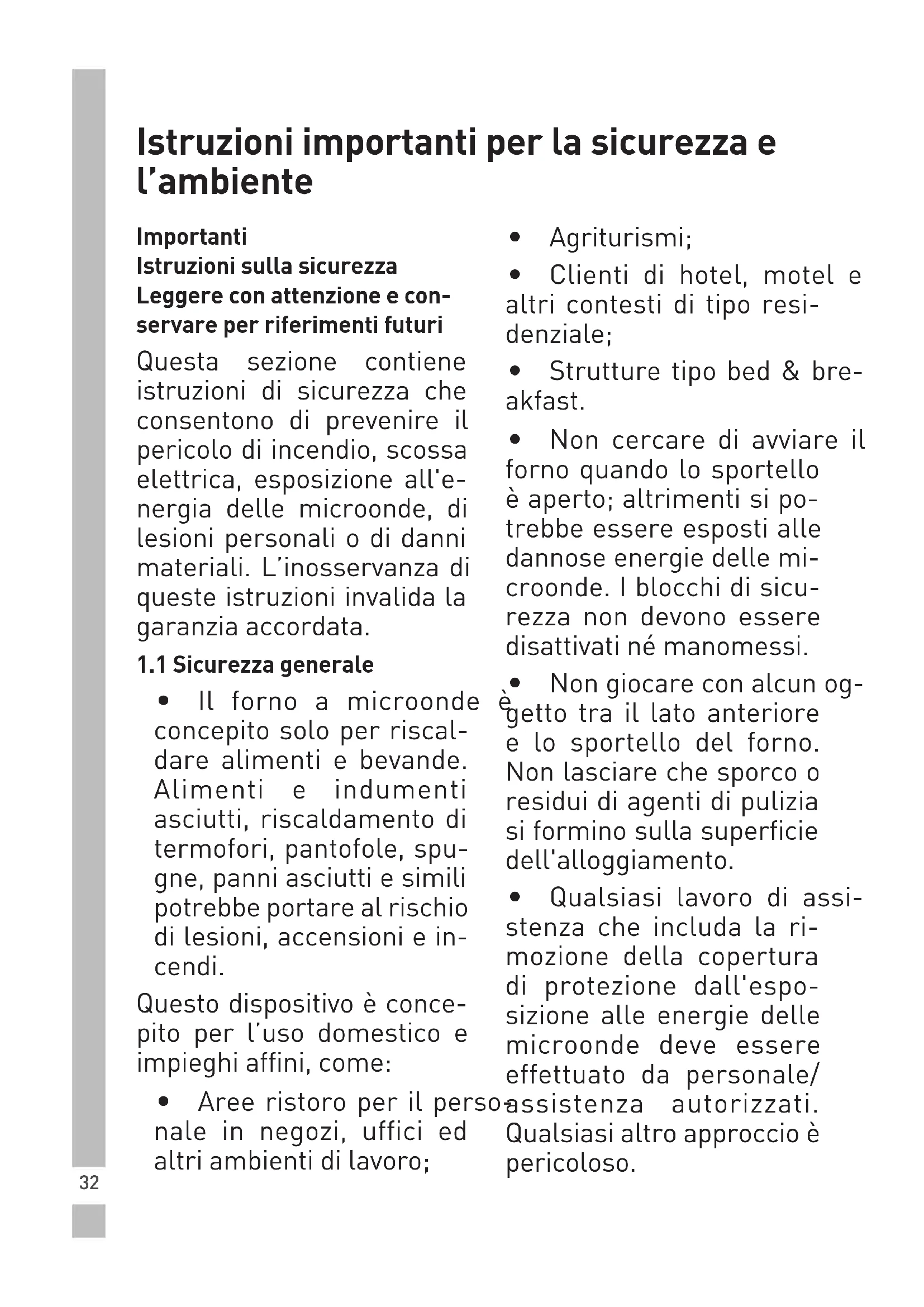 (due to an obstruction in front of the door, low voltage and etc.) Unplug. Then plug again after 10 seconds.32 Istruzioni importanti per la sicurezza e l’ambiente Importanti Istruzioni sulla sicurezza Leggere con attenzione e con- servare per riferimenti futuri Questa sezione contiene istruzioni di sicurezza che consentono di prevenire il pericolo di incendio, scossa elettrica, esposizione all'e- nergia delle microonde, di lesioni personali o di danni materiali. L’inosservanza di queste istruzioni invalida la garanzia accordata.