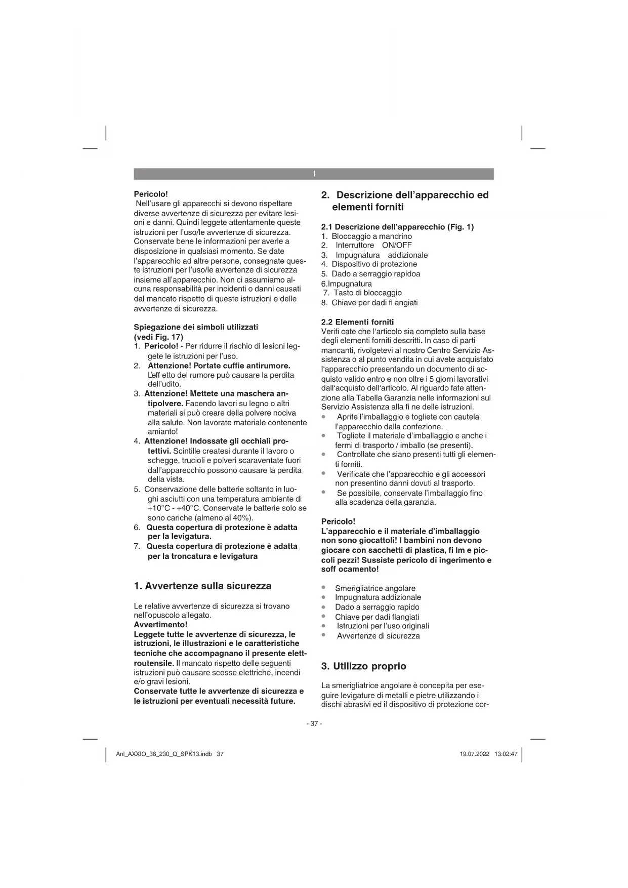 La smerigliatrice angolare è concepita per ese- guire levigature di metalli e pietre utilizzando i dischi abrasivi ed il dispositivo di protezione cor- Anl_AXXIO_36_230_Q_SPK13.indb 37Anl_AXXIO_36_230_Q_SPK13.indb 37 19.07.2022 13:02:4719.07.2022 13:02:47I