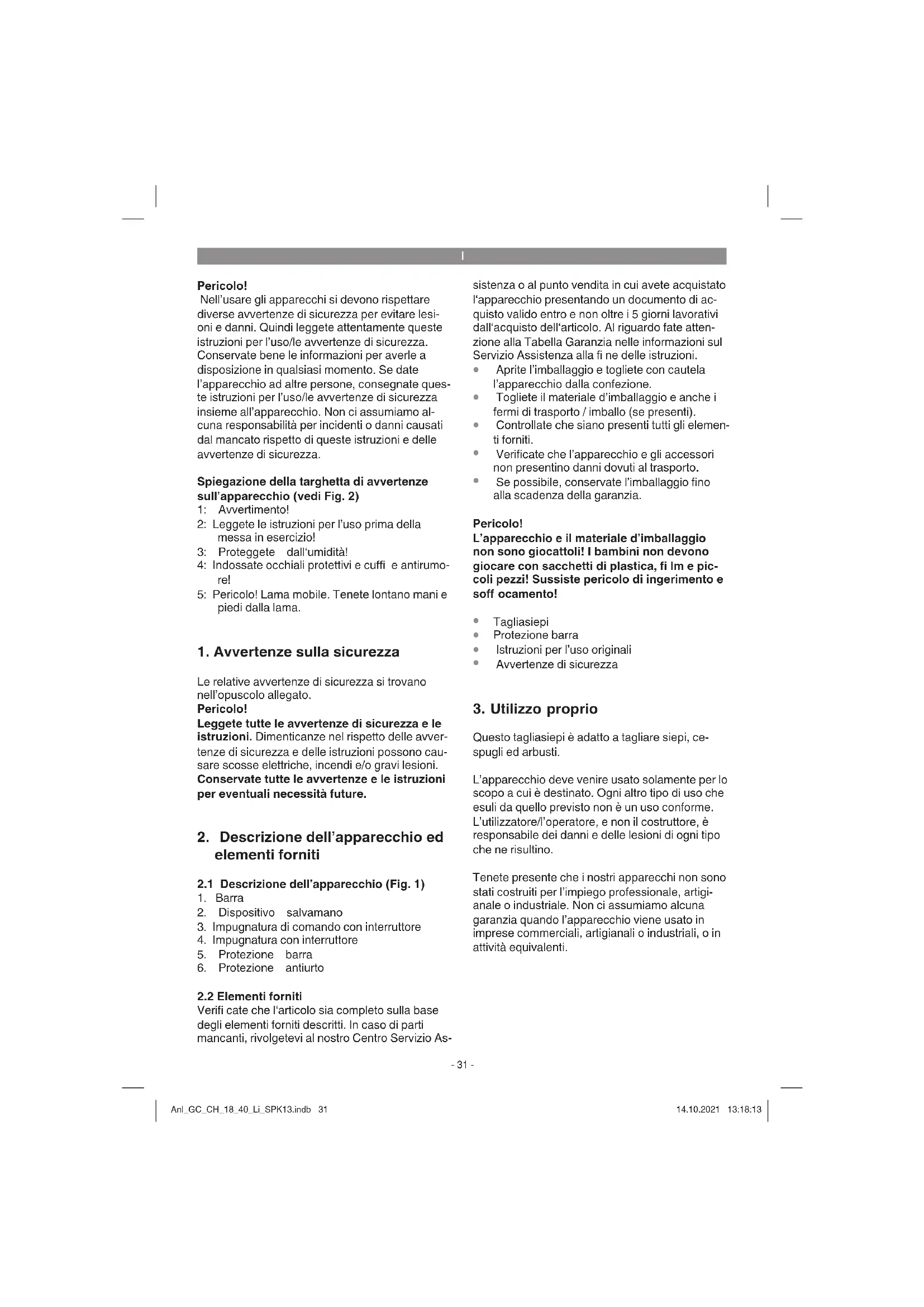 Questo tagliasiepi è adatto a tagliare siepi, ce- spugli ed arbusti. L’apparecchio deve venire usato solamente per lo scopo a cui è destinato. Ogni altro tipo di uso che esuli da quello previsto non è un uso conforme. L’utilizzatore/l’operatore, e non il costruttore, è responsabile dei danni e delle lesioni di ogni tipo che ne risultino. Tenete presente che i nostri apparecchi non sono stati costruiti per l’impiego professionale, artigi- anale o industriale. Non ci assumiamo alcuna garanzia quando l’apparecchio viene usato in imprese commerciali, artigianali o industriali, o in attività equivalenti. Anl_GC_CH_18_40_Li_SPK13.indb 31Anl_GC_CH_18_40_Li_SPK13.indb 31 14.10.2021 13:18:1314.10.2021 13:18:13I