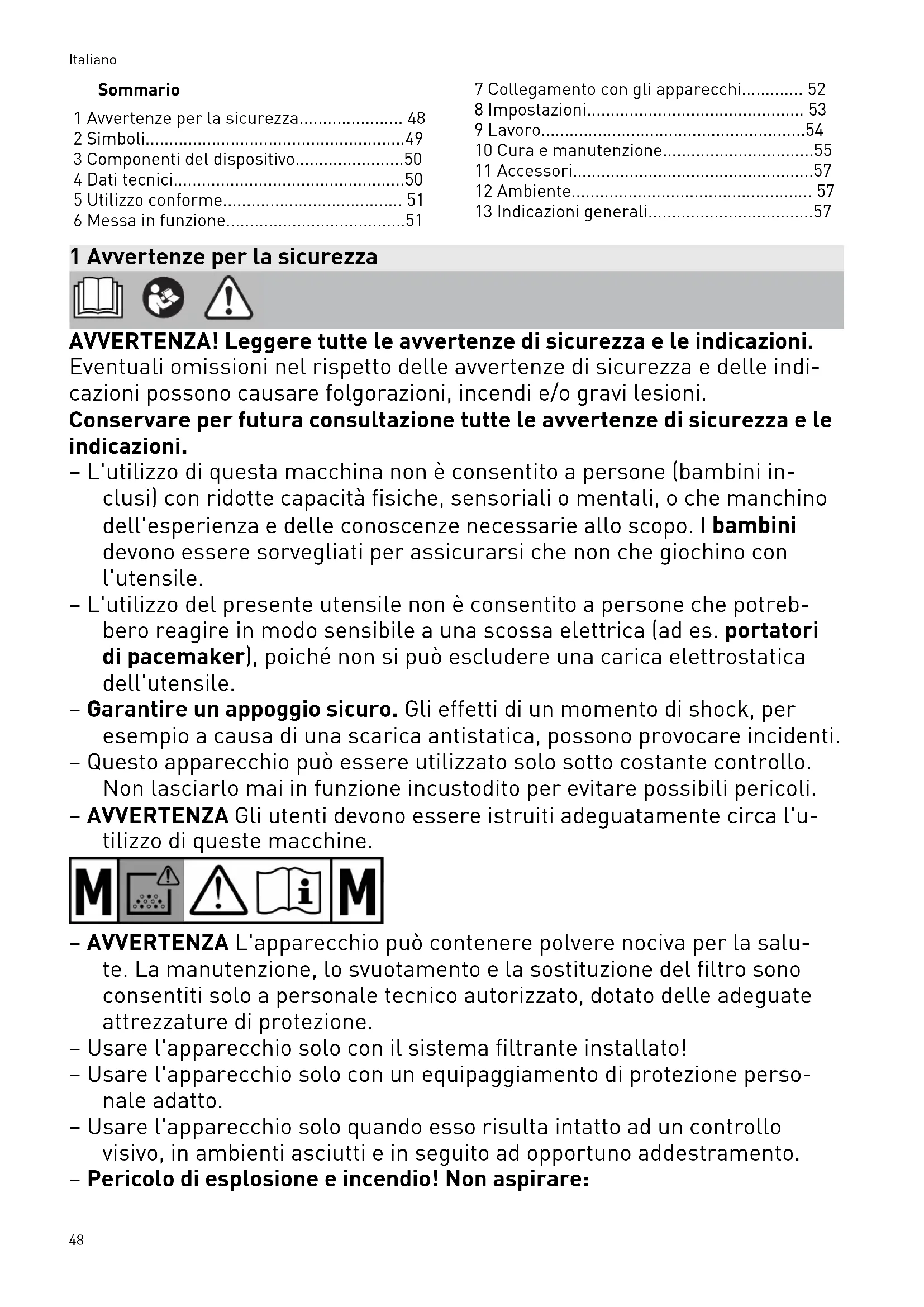 - 13 Indicazioni generali 1 Avvertenze per la sicurezza AVVERTENZA! Leggere tutte le avvertenze di sicurezza e le indicazioni. Eventuali omissioni nel rispetto delle avvertenze di sicurezza e delle indi cazioni possono causare folgorazioni, incendi e/o gravi lesioni. Conservare per futura consultazione tutte le avvertenze di sicurezza e le indicazioni. – L'utilizzo di questa macchina non è consentito a persone (bambini in clusi) con ridotte capacità fisiche, sensoriali o mentali, o che manchino dell'esperienza e delle conoscenze necessarie allo scopo. I bambini devono essere sorvegliati per assicurarsi che non che giochino con l'utensile. – L'utilizzo del presente utensile non è consentito a persone che potreb bero reagire in modo sensibile a una scossa elettrica (ad es. portatori di pacemaker), poiché non si può escludere una carica elettrostatica dell'utensile. – Garantire un appoggio sicuro. Gli effetti di un momento di shock, per esempio a causa di una scarica antistatica, possono provocare incidenti. – Questo apparecchio può essere utilizzato solo sotto costante controllo. Non lasciarlo mai in funzione incustodito per evitare possibili pericoli. – AVVERTENZA Gli utenti devono essere istruiti adeguatamente circa l'u tilizzo di queste macchine. – AVVERTENZA L'apparecchio può contenere polvere nociva per la salu te. La manutenzione, lo svuotamento e la sostituzione del filtro sono consentiti solo a personale tecnico autorizzato, dotato delle adeguate attrezzature di protezione. – Usare l'apparecchio solo con il sistema filtrante installato! – Usare l'apparecchio solo con un equipaggiamento di protezione perso nale adatto. – Usare l'apparecchio solo quando esso risulta intatto ad un controllo visivo, in ambienti asciutti e in seguito ad opportuno addestramento. – Pericolo di esplosione e incendio! Non aspirare: Italiano 48– scintille, pezzi incandescenti o polveri calde; – materiali infiammabili o esplosivi (p.es. magnesio, alluminio, benzina, diluente); – materiali aggressivi (ad esempio acidi, soluzioni alcaline, solventi); – materiali chimicamente reattivi che possano generare calore, aci di/basi, gas ecc. (ad esempio materiali reattivi bicomponenti, allumi nio e acqua). – Attenersi alle norme nazionali sulla sicurezza e alle indicazioni del produttore dei materiali. p. 57