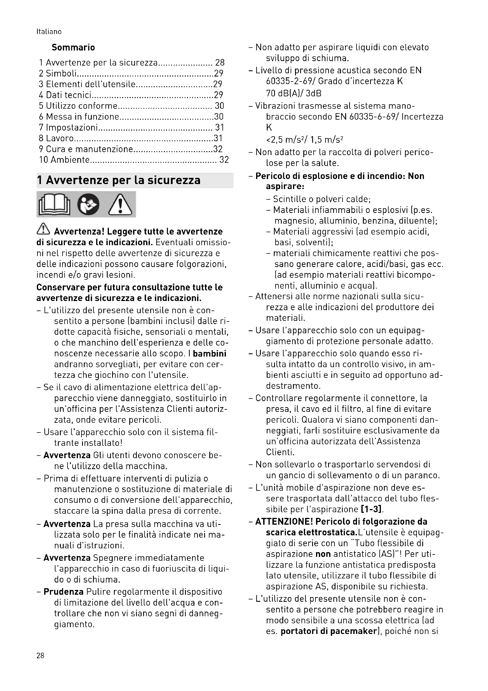 - 10 Ambiente 1 Avvertenze per la sicurezza Avvertenza! Leggere tutte le avvertenze di sicurezza e le indicazioni. Eventuali omissio ni nel rispetto delle avvertenze di sicurezza e delle indicazioni possono causare folgorazioni, incendi e/o gravi lesioni. Conservare per futura consultazione tutte le avvertenze di sicurezza e le indicazioni. – L'utilizzo del presente utensile non è con sentito a persone (bambini inclusi) dalle ri dotte capacità fisiche, sensoriali o mentali, o che manchino dell'esperienza e delle co noscenze necessarie allo scopo. I bambini andranno sorvegliati, per evitare con cer tezza che giochino con l'utensile. – Se il cavo di alimentazione elettrica dell'ap parecchio viene danneggiato, sostituirlo in un'officina per l'Assistenza Clienti autoriz zata, onde evitare pericoli. – Usare l'apparecchio solo con il sistema fil trante installato! – Avvertenza Gli utenti devono conoscere be ne l'utilizzo della macchina. – Prima di effettuare interventi di pulizia o manutenzione o sostituzione di materiale di consumo o di conversione dell'apparecchio, staccare la spina dalla presa di corrente. – Avvertenza La presa sulla macchina va uti lizzata solo per le finalità indicate nei ma nuali d'istruzioni. – Avvertenza Spegnere immediatamente l'apparecchio in caso di fuoriuscita di liqui do o di schiuma. – Prudenza Pulire regolarmente il dispositivo di limitazione del livello dell'acqua e con trollare che non vi siano segni di danneg giamento. – Non adatto per aspirare liquidi con elevato sviluppo di schiuma. – Livello di pressione acustica secondo EN 60335-2-69/ Grado d’incertezza K 70 dB(A)/ 3dB – Vibrazioni trasmesse al sistema mano- braccio secondo EN 60335-6-69/ Incertezza p. 32