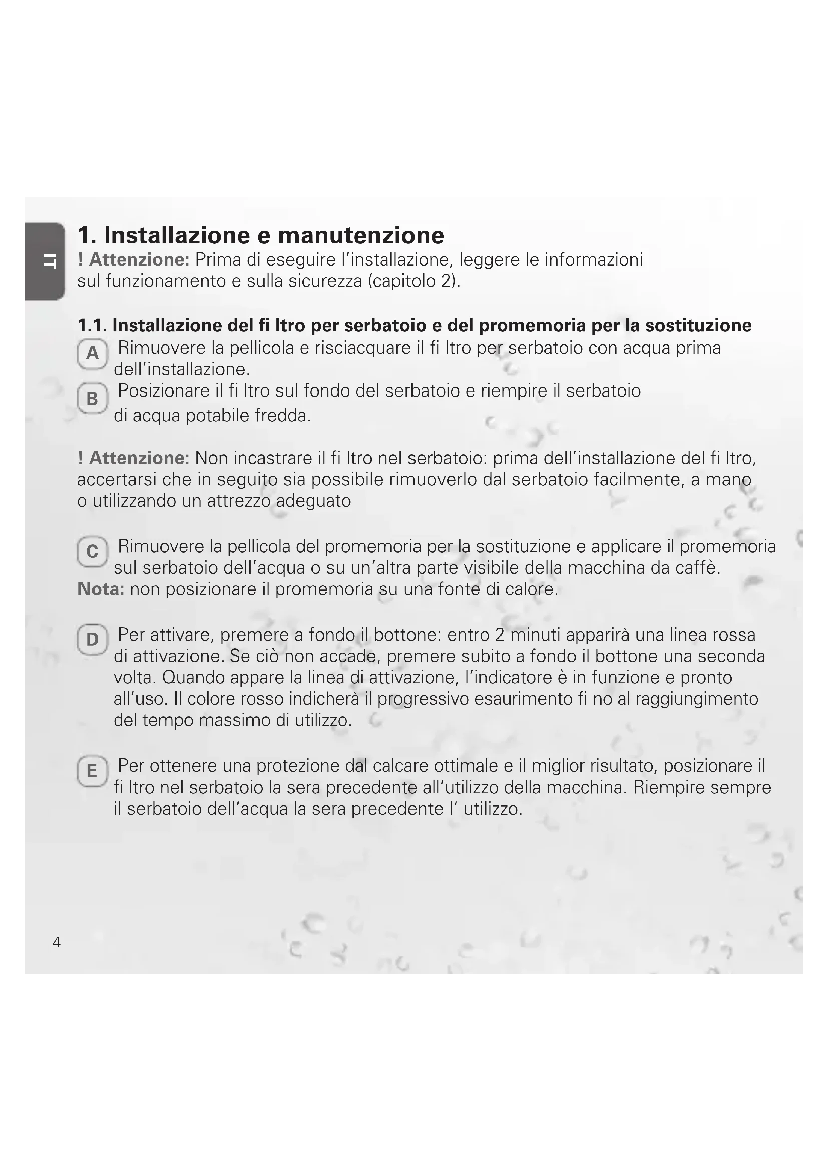 Per ottenere una protezione dal calcare ottimale e il miglior risultato, posizionare il fi ltro nel serbatoio la sera precedente all’utilizzo della macchina. Riempire sempre il serbatoio dell’acqua la sera precedente l‘ utilizzo. IT5 1.2. Manutenzione
