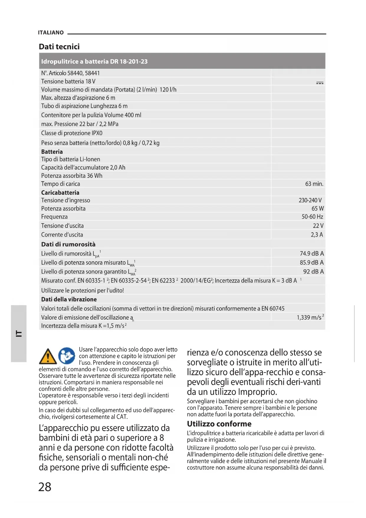 chio, rivolgersi cortesemente al CAT. L‘apparecchio pu essere utilizzato da bambini di età pari o superiore a 8 anni e da persone con ridotte facoltà siche, sensoriali o mentali non-ché da persone prive di suciente espe- rienza e/o conoscenza dello stesso se sorvegliate o istruite in merito all‘uti- lizzo sicuro dell‘appa-recchio e consa- pevoli degli eventuali rischi deri-vanti da un utilizzo Improprio. Sorvegliare i bambini per accertarsi che non giochino con l’apparato. Tenere sempre i bambini e le persone non adatte fuori la portata dell’apparecchio. Utilizzo conforme L’idropulitrice a batteria ricaricabile è adatta per lavori di pulizia e irrigazione. Utilizzare il prodotto solo per l’uso per cui è previsto. All‘inadempimento delle istituzioni delle direttive gene