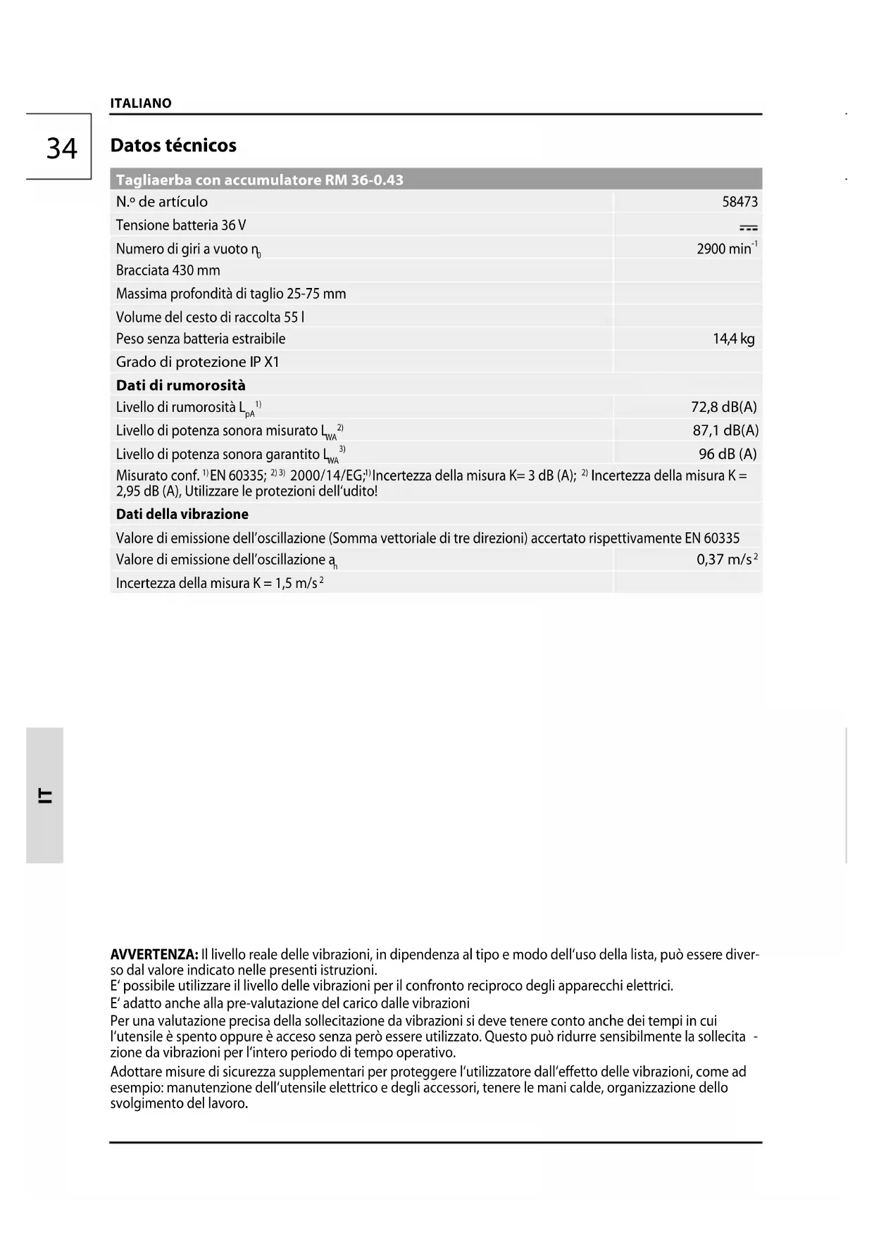 Incertezza della misura K = 2,95 dB (A), Utilizzare le protezioni dell‘udito! Dati della vibrazione Valore di emissione dell’oscillazione (Somma vettoriale di tre direzioni) accertato rispettivamente EN 60335 Valore di emissione dell’oscillazione a