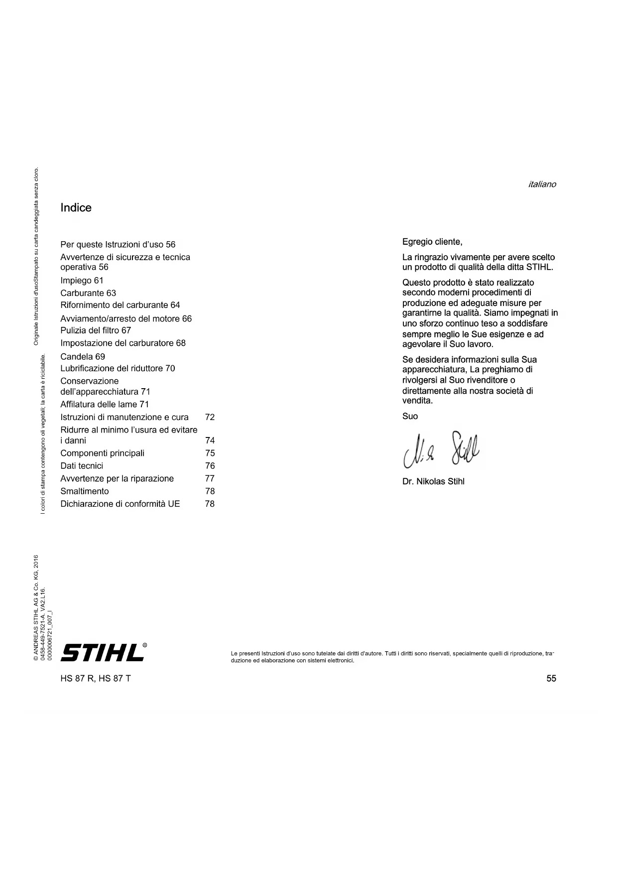 duzione ed elaborazione con sistemi elettronici. Indice Egregio cliente, La ringrazio vivamente per avere scelto un prodotto di qualità della ditta STIHL. Questo prodotto è stato realizzato secondo moderni procedimenti di produzione ed adeguate misure per garantirne la qualità. Siamo impegnati in uno sforzo continuo teso a soddisfare sempre meglio le Sue esigenze e ad agevolare il Suo lavoro. Se desidera informazioni sulla Sua apparecchiatura, La preghiamo di rivolgersi al Suo rivenditore o direttamente alla nostra società di vendita. Suo Dr. Nikolas Stihl Per queste Istruzioni d’uso 56 Avvertenze di sicurezza e tecnica operativa 56 Impiego 61 Carburante 63 Rifornimento del carburante 64 Avviamento/arresto del motore 66 Pulizia del filtro 67 Impostazione del carburatore 68 Candela 69 Lubrificazione del riduttore 70 Conservazione dell’apparecchiatura 71 Affilatura delle lame 71 Istruzioni di manutenzione e cura 72 Ridurre al minimo l’usura ed evitare i danni 74 Componenti principali 75 Dati tecnici 76 Avvertenze per la riparazione 77 Smaltimento 78 Dichiarazione di conformità UE 78HS 87 R, HS 87 T italiano