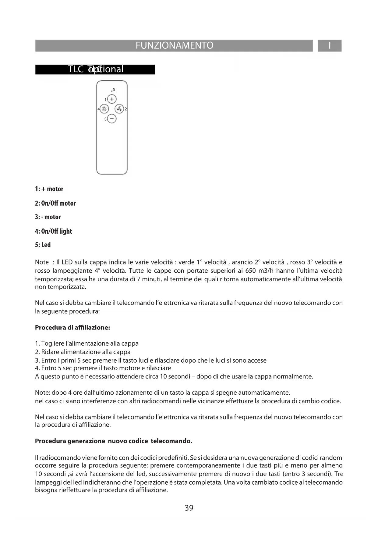 TLC 1: + motor 2: On/O motor 3: - motor 4: On/O light 5: Led Note : Il LED sulla cappa indica le varie velocità : verde 1° velocità , arancio 2° velocità , rosso 3° velocità e rosso lampeggiante 4° velocità. Tutte le cappe con portate superiori ai 650 m3/h hanno l’ultima velocità temporizzata; essa ha una durata di 7 minuti, al termine dei quali ritorna automaticamente all’ultima velocità non temporizzata. Nel caso si debba cambiare il telecomando l’elettronica va ritarata sulla frequenza del nuovo telecomando con la seguente procedura: Procedura di aliazione: