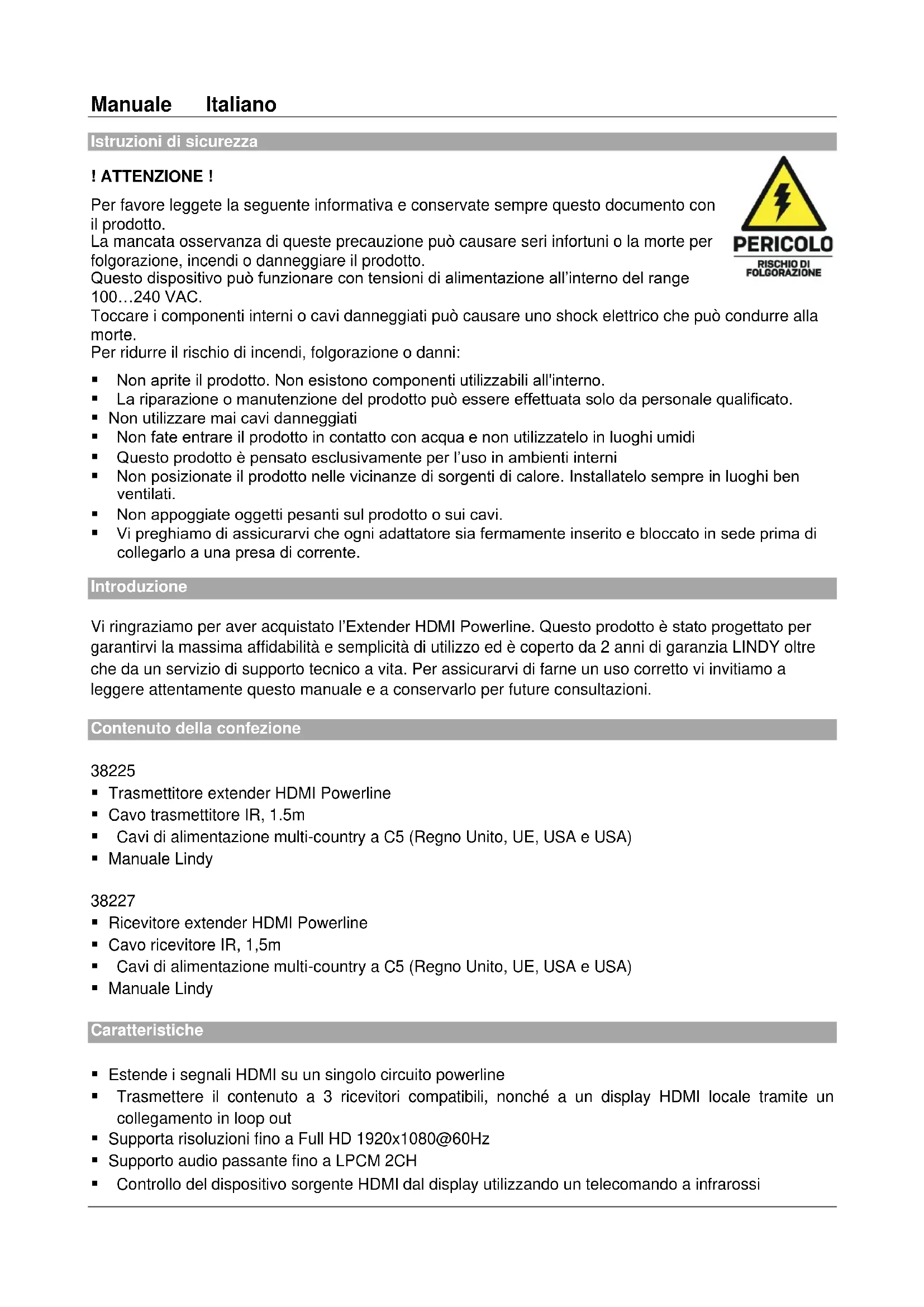 - Vi preghiamo di assicurarvi che ogni adattatore sia fermamente inserito e bloccato in sede prima di collegarlo a una presa di corrente. Introduzione Vi ringraziamo per aver acquistato l’Extender HDMI Powerline. Questo prodotto è stato progettato per garantirvi la massima affidabilità e semplicità di utilizzo ed è coperto da 2 anni di garanzia LINDY oltre che da un servizio di supporto tecnico a vita. Per assicurarvi di farne un uso corretto vi invitiamo a leggere attentamente questo manuale e a conservarlo per future consultazioni. Contenuto della confezione