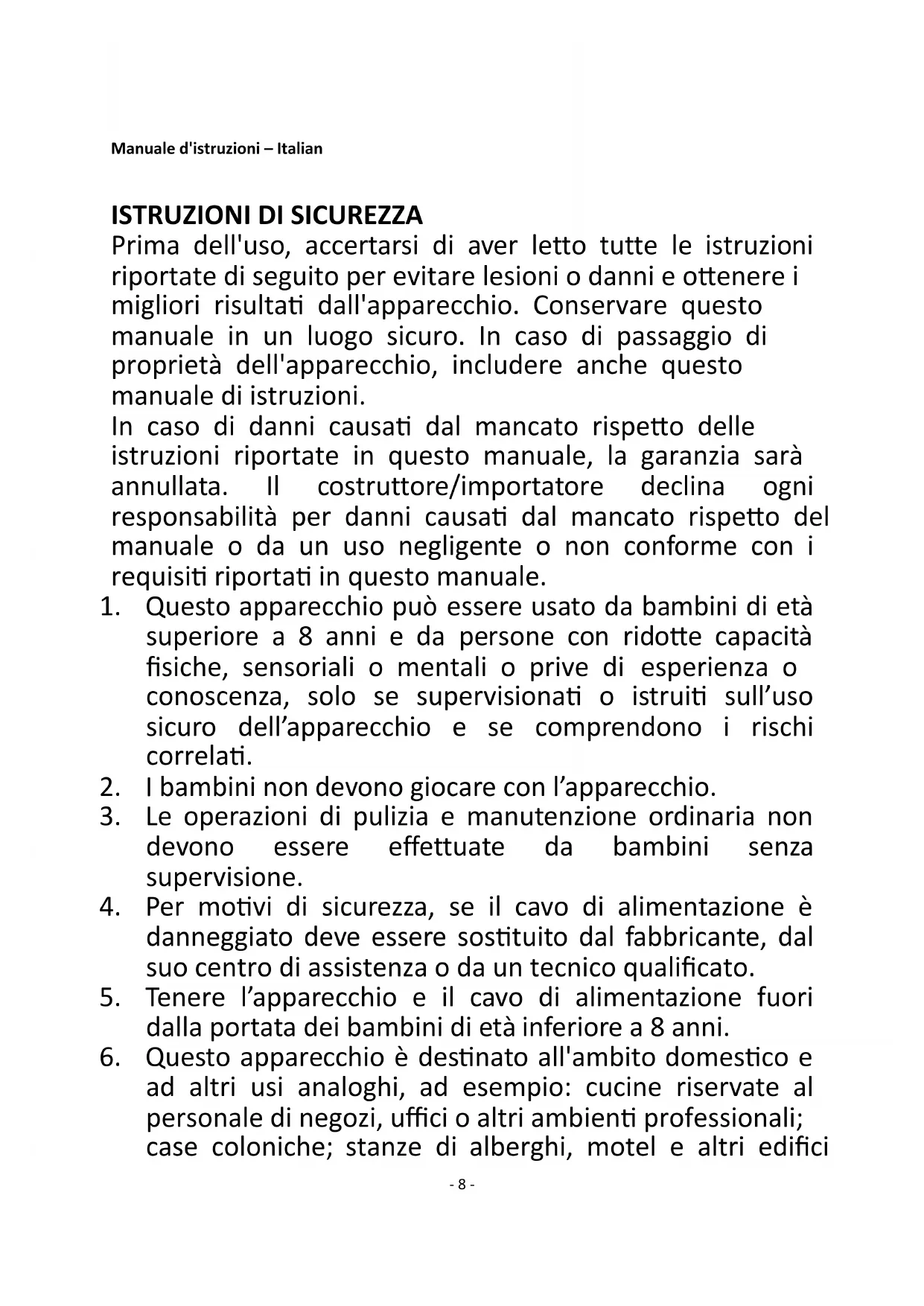 Prima dell'uso, accertarsi di aver letto tutte le istruzioni riportate di seguito per evitare lesioni o danni e ottenere i migliori risultati dall'apparecchio. Conservare questo manuale in un luogo sicuro. In caso di passaggio di proprietà dell'apparecchio, includere anche questo manuale di istruzioni. In caso di danni causati dal mancato rispetto delle istruzioni riportate in questo manuale, la garanzia sarà annullata. Il costruttore/importatore declina ogni responsabilità per danni causati dal mancato rispetto del manuale o da un uso negligente o non conforme con i requisiti riportati in questo manuale.